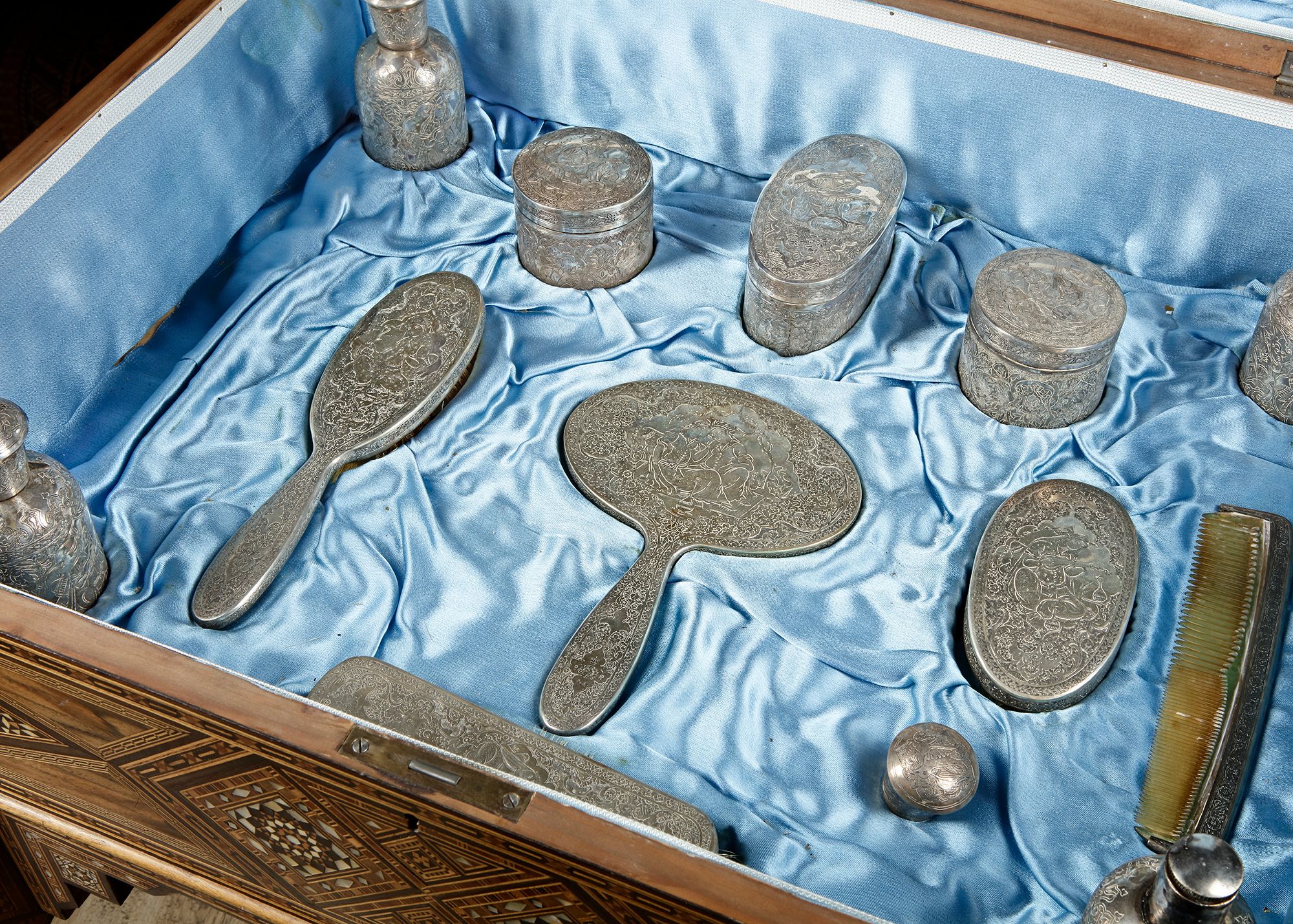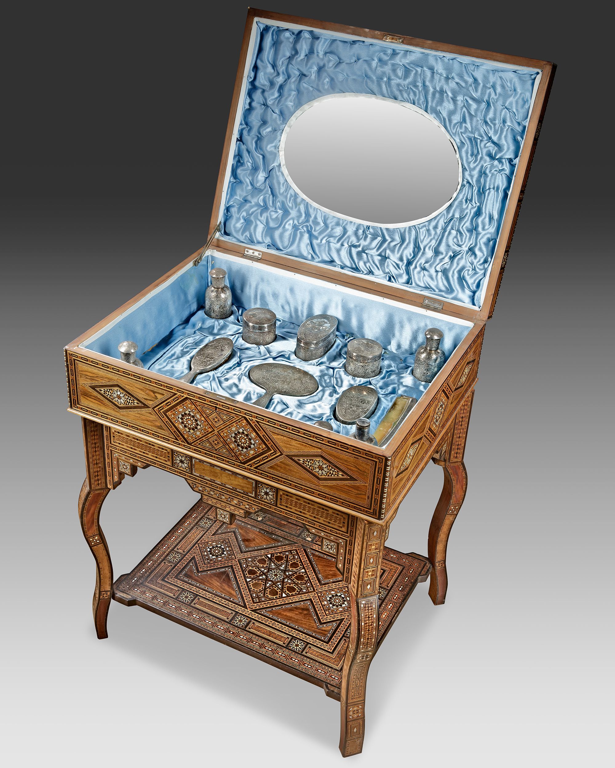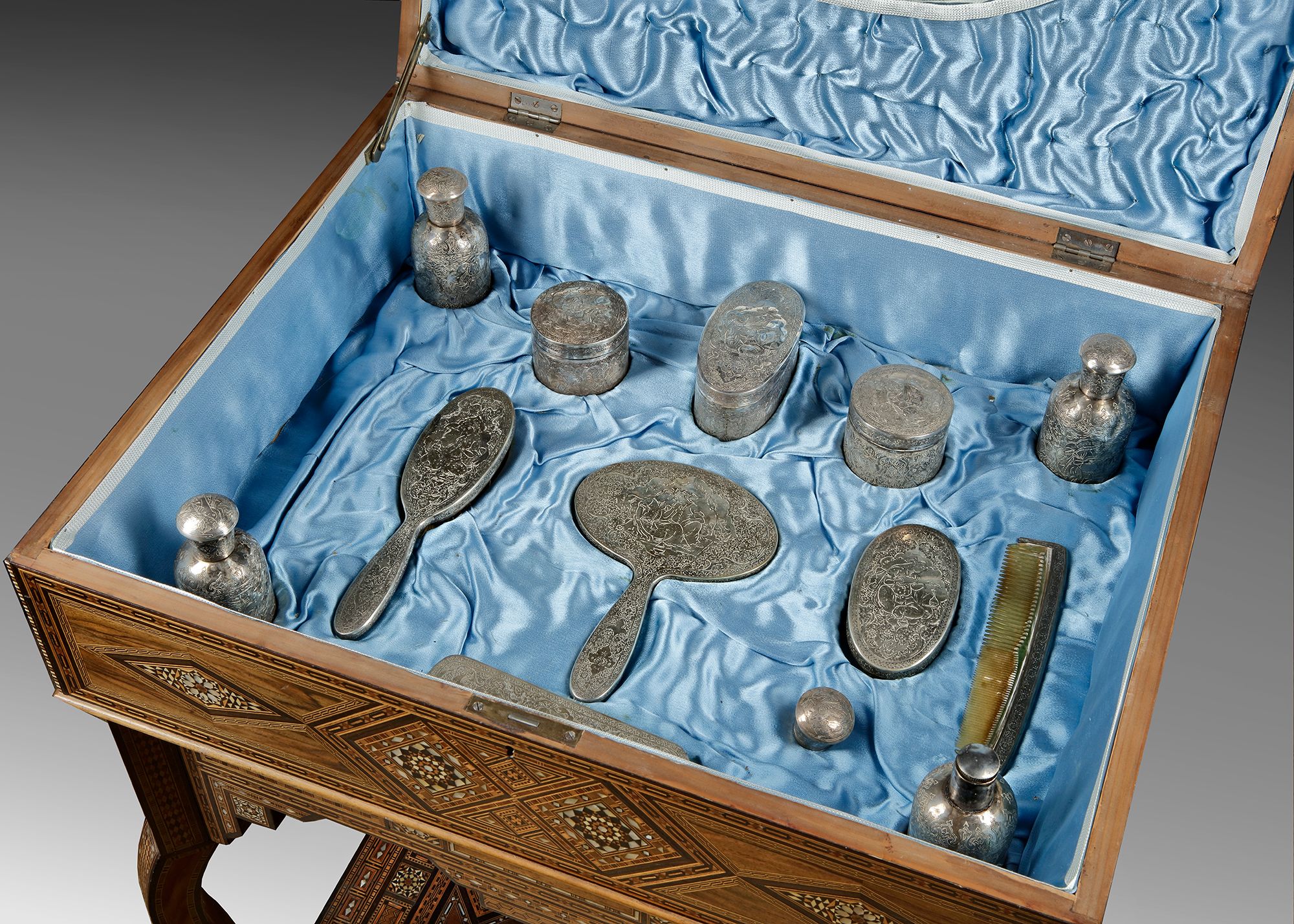 With a spacer top and 4 arched legs. Opens with a series of toiletries in chiseled solid silver.