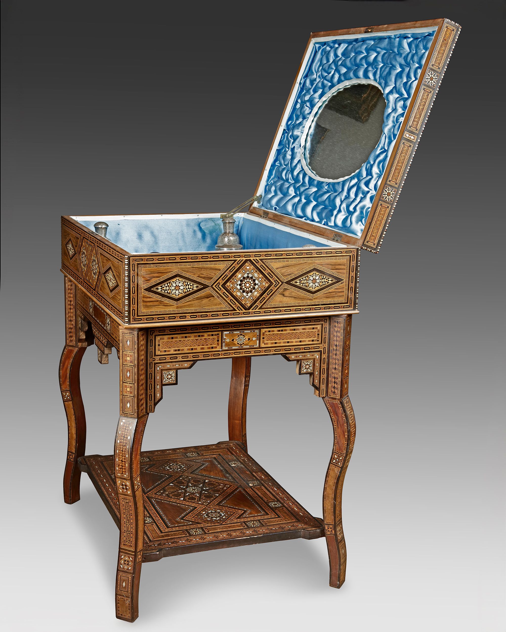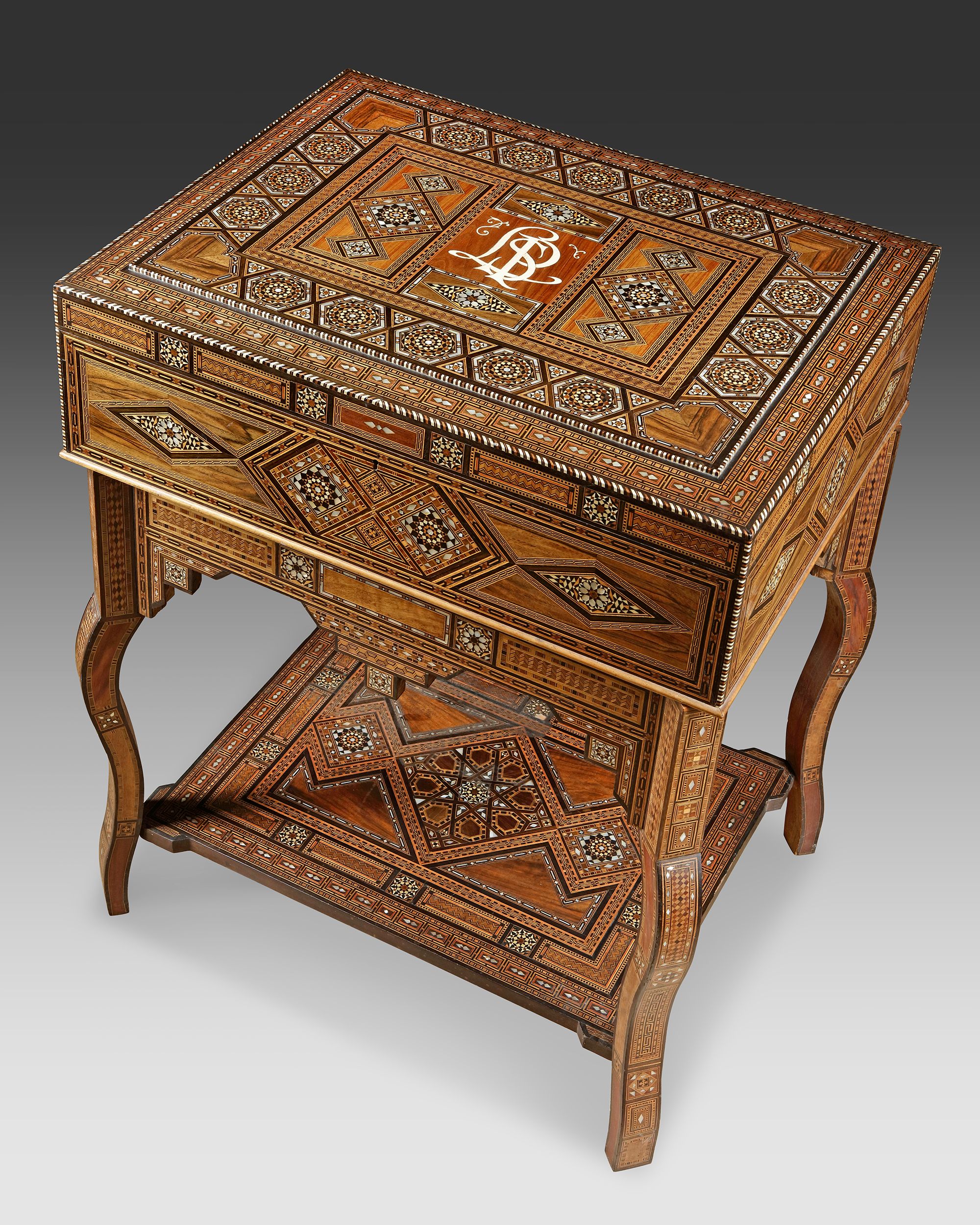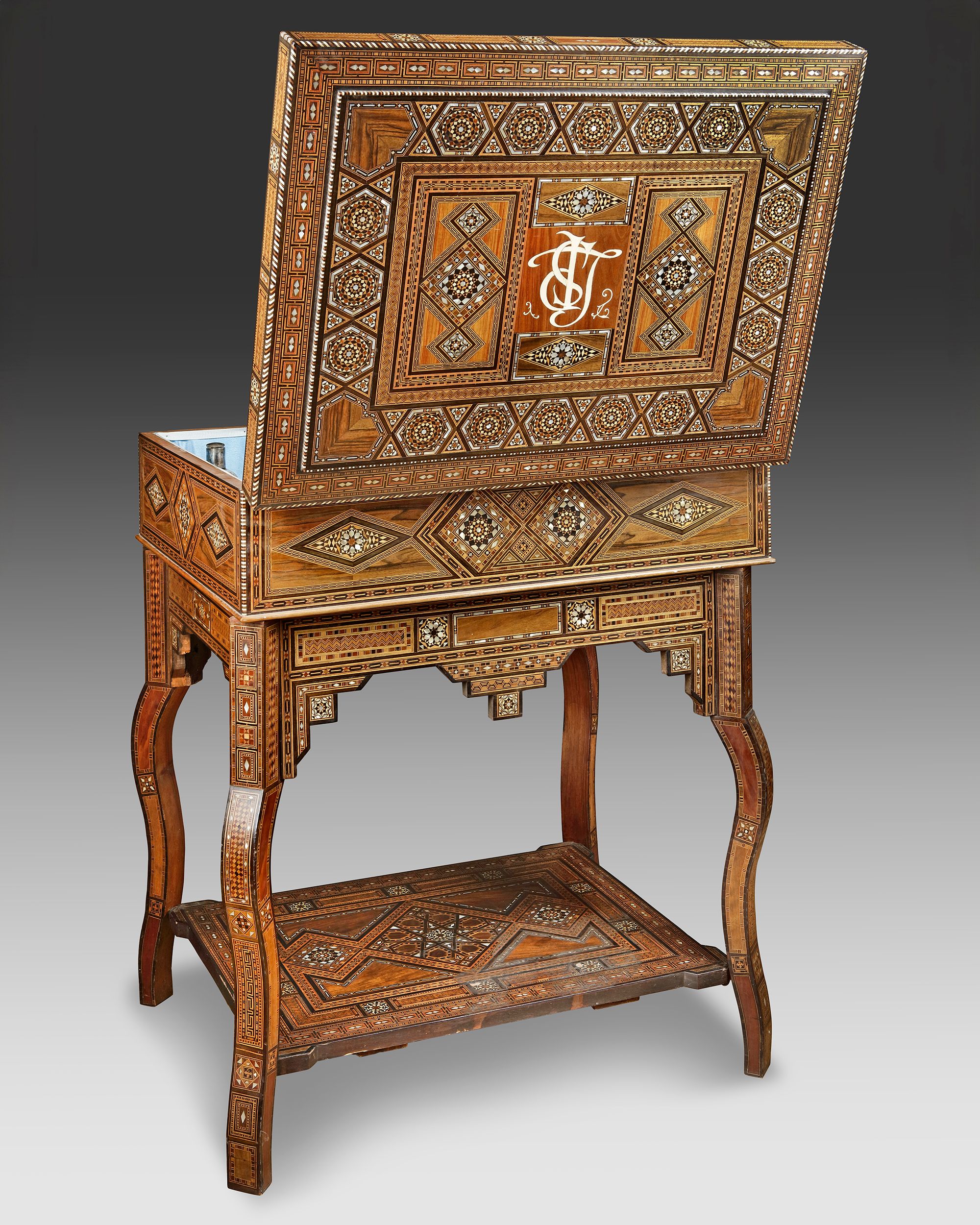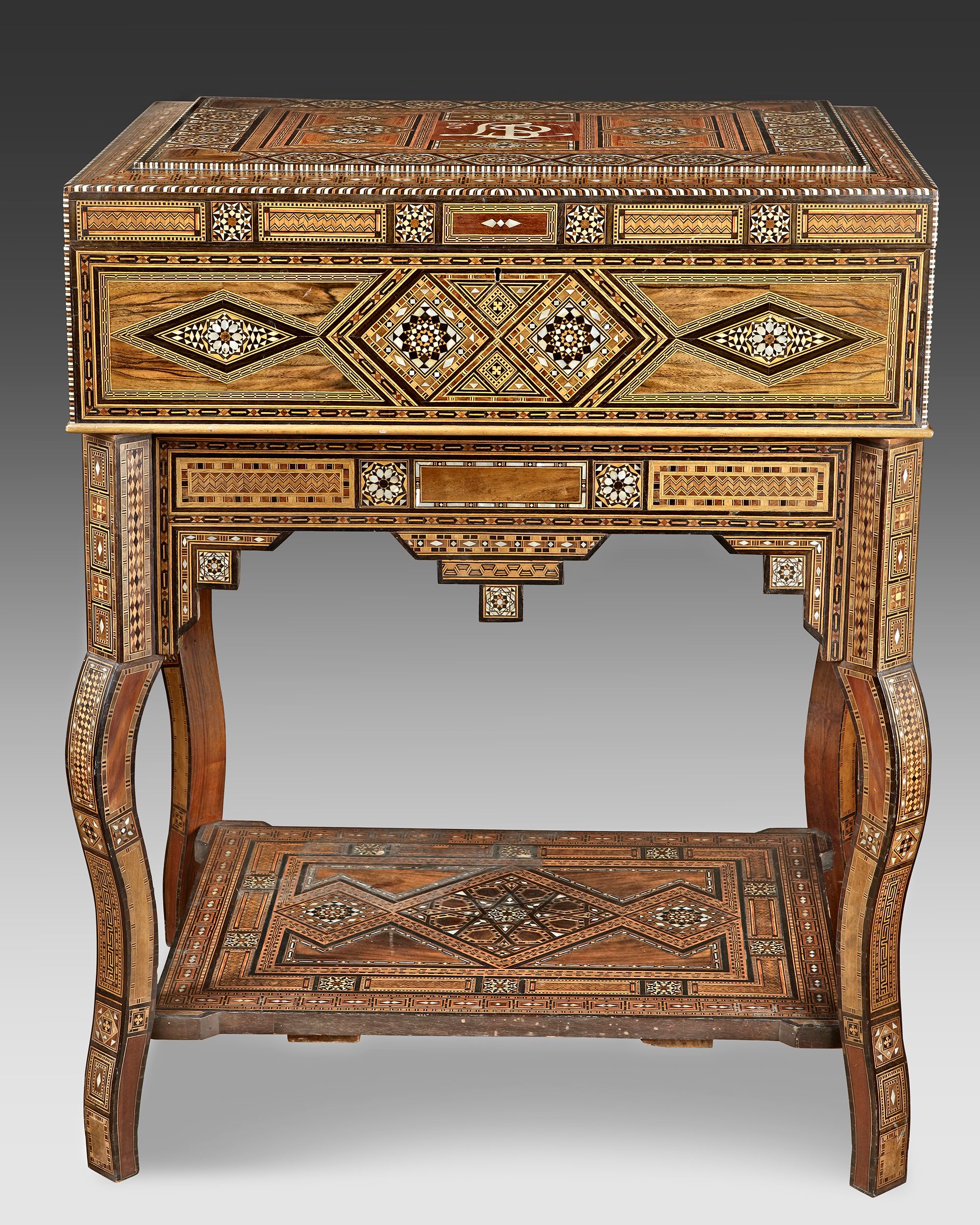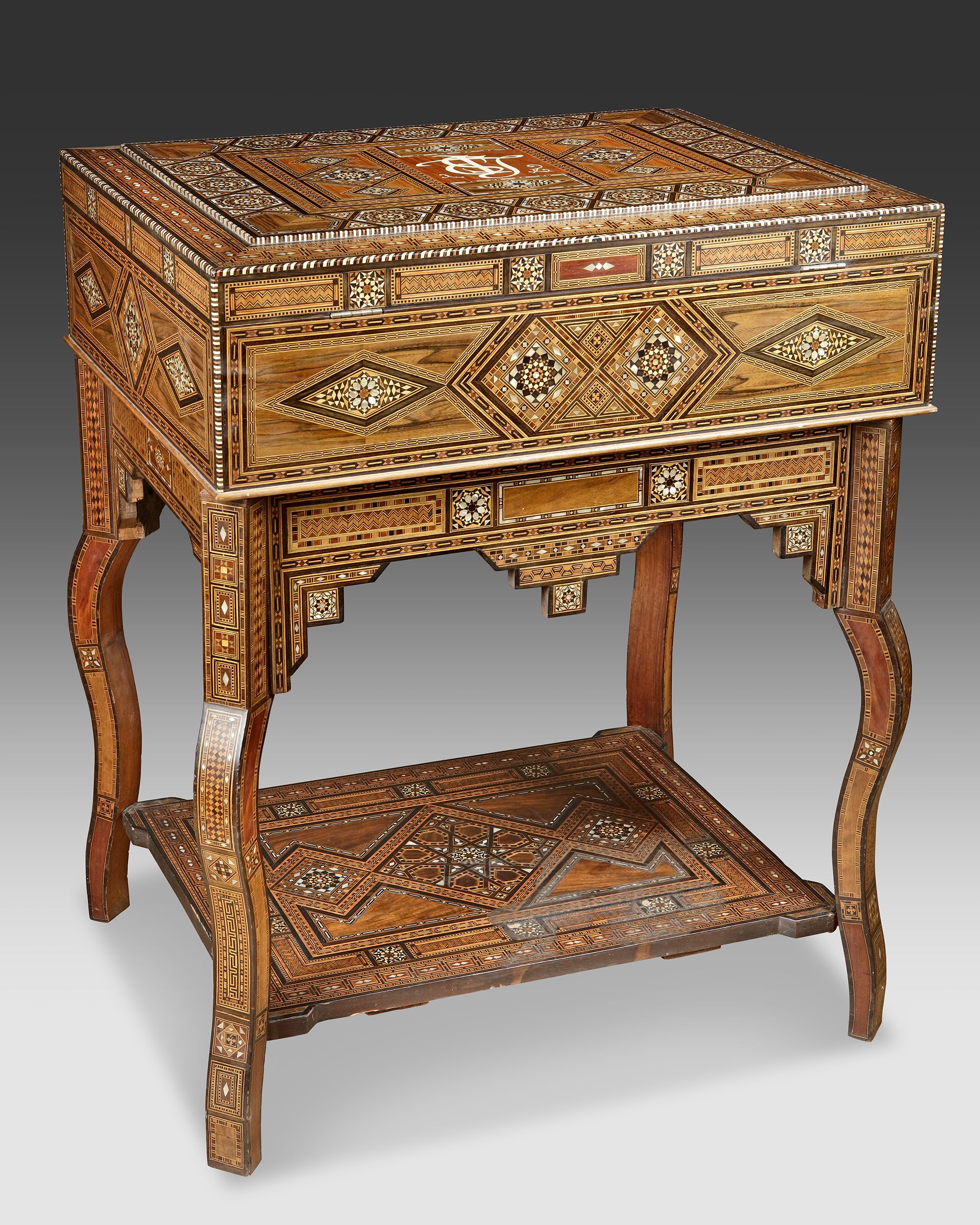 A SYRIAN TABLE BOX IN PRECIOUS WOOD MARQUETRY AND MOTHER-OF-PEARL INLAY, CIRCA 1880