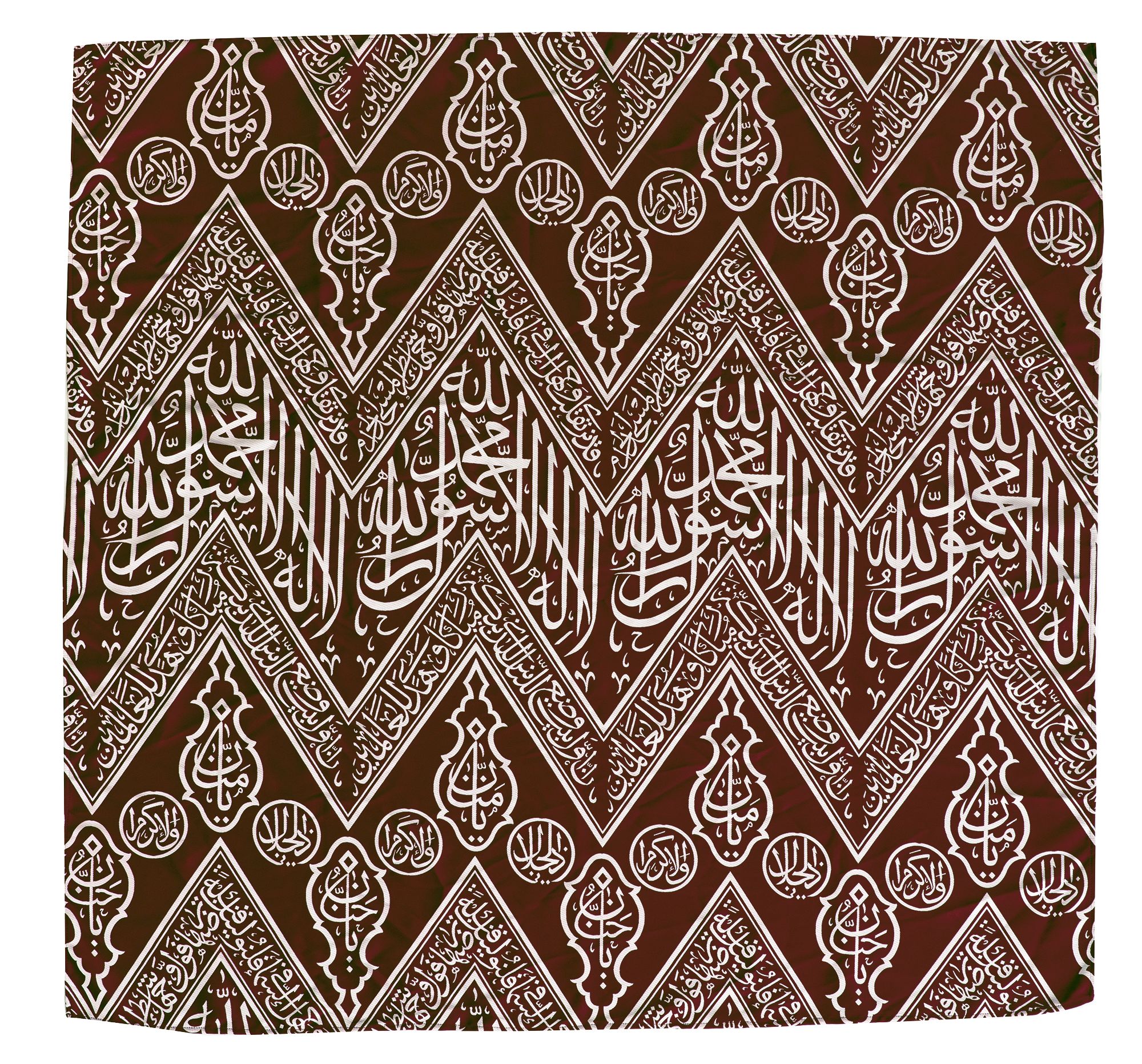 A fragment of the inner curtain of sacred kiswa for the inner wall of the Kabaa with an inscribed weave in cream-colored silk over a dark red ground. The crests of the chevrons are embellished with lamp motifs with circular medallions in between. Embellished with two groups of three undulating bands which assume the form of a continuous chain made up of number ‘7’s. The bands run from the beginning to the end of the cloth. The central band with prominent Inscription of ‘Kalimaat al-Tawhid, There is no God but Allah and Muhammad is his Prophet’, repeating in the middle of the kiswa between the two zigzag bands. The two expressions, ‘Ya Mannan’ (O, the All-Bounteous) inside the upright lantern, and ‘Ya Hannan’ (O, the Most-Compassionate) inside the reversed lantern are also repeated with ‘Praise be to Allah’ (O, The All-sovereign) inside the circles. On the upper undulating band, there is a verse from the Quran 2 surah Al-Baqarah verse-144. The lower undulating band encloses another inscription of v.96 from surah Al-Imraan.