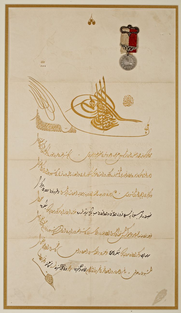 Manuscript on paper, Ink and gold on burnished paper, with 8 lines of elegant gold and black diwani script, the large gold tughra of Ottoman Sultan AbdulHamid II at the top.