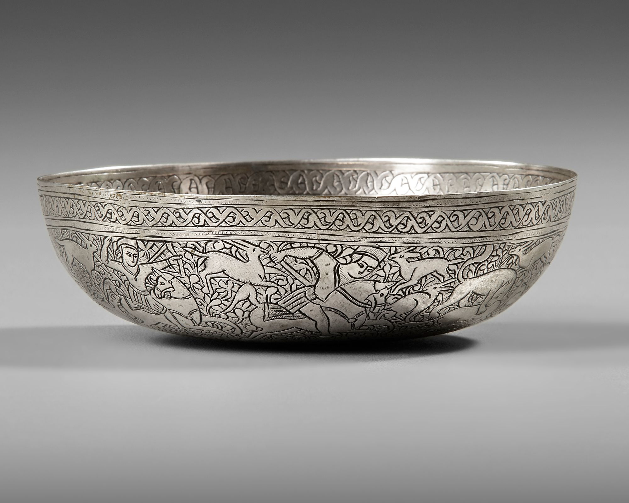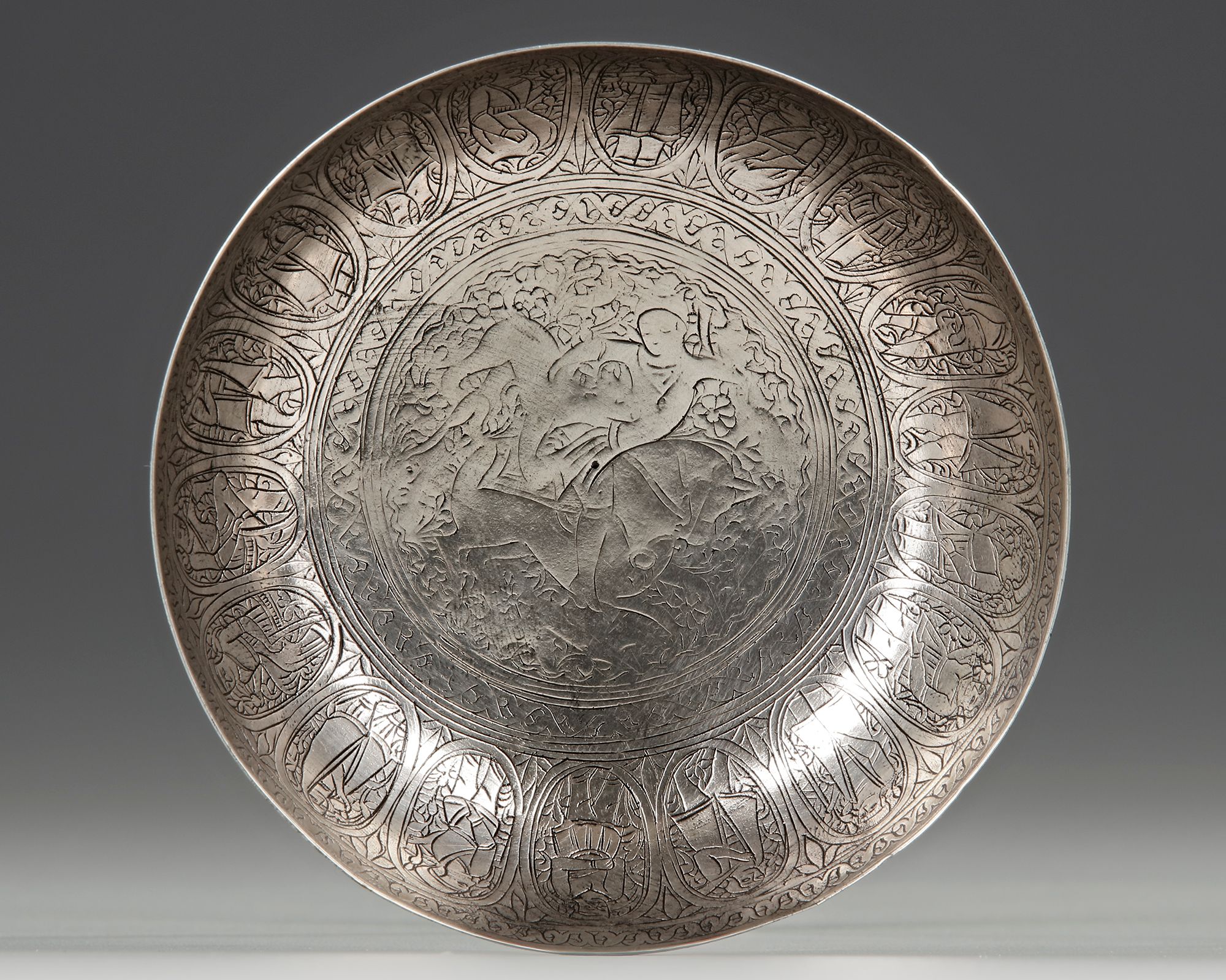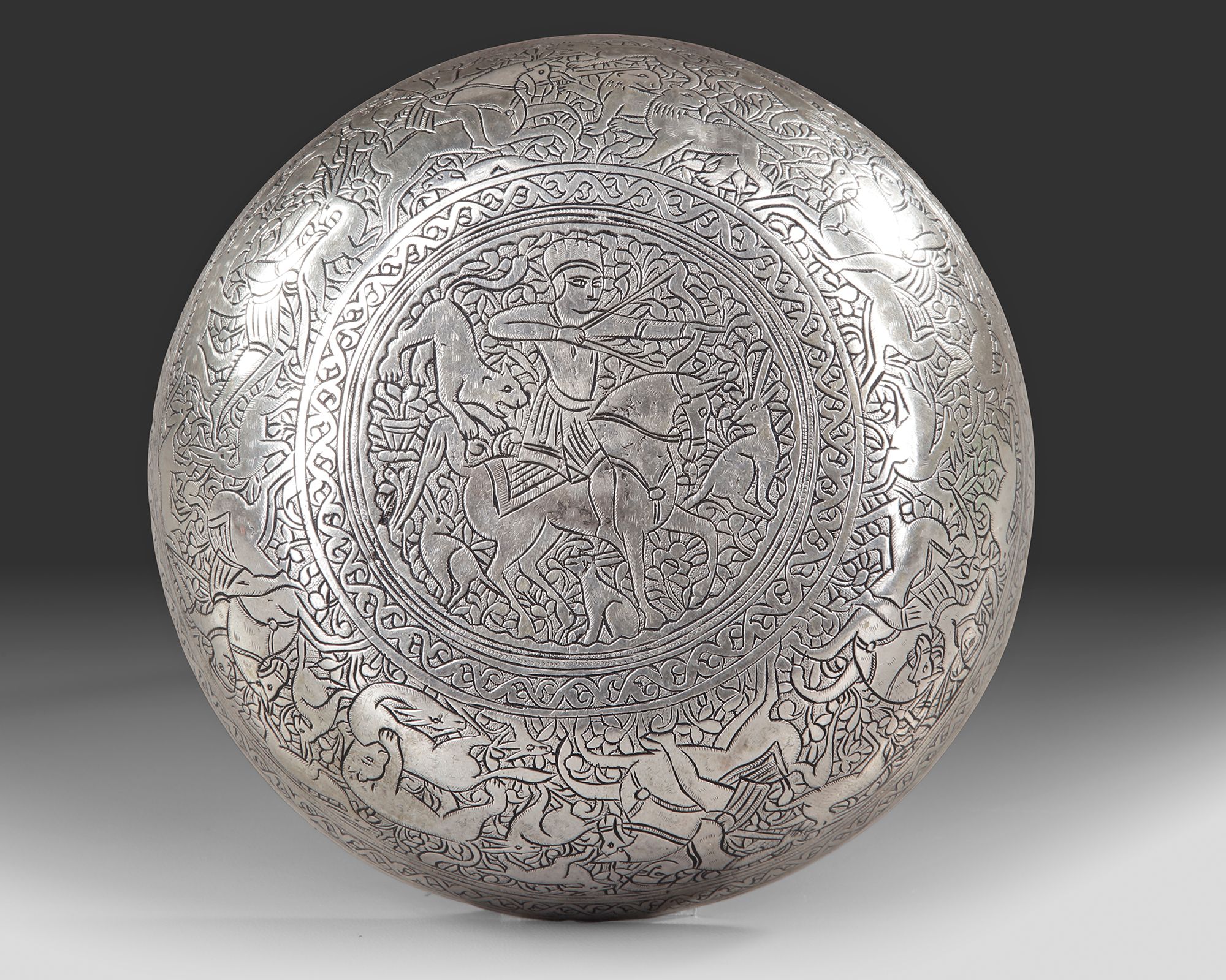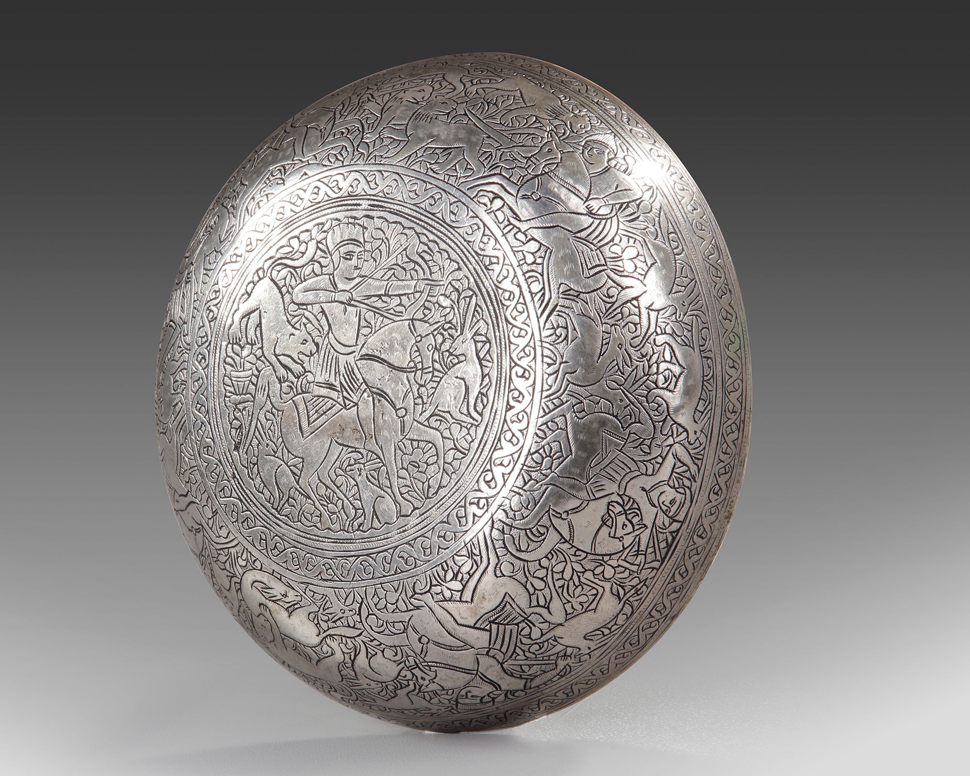 A Persian silver magic bowl, engraved to the interior with a central roundel enclosing a horseman in a hunting scene, the sides with panels enclosing standing figures engaged in different activities. The exterior engraved with horsemen, lions and deer in hunting scenes.