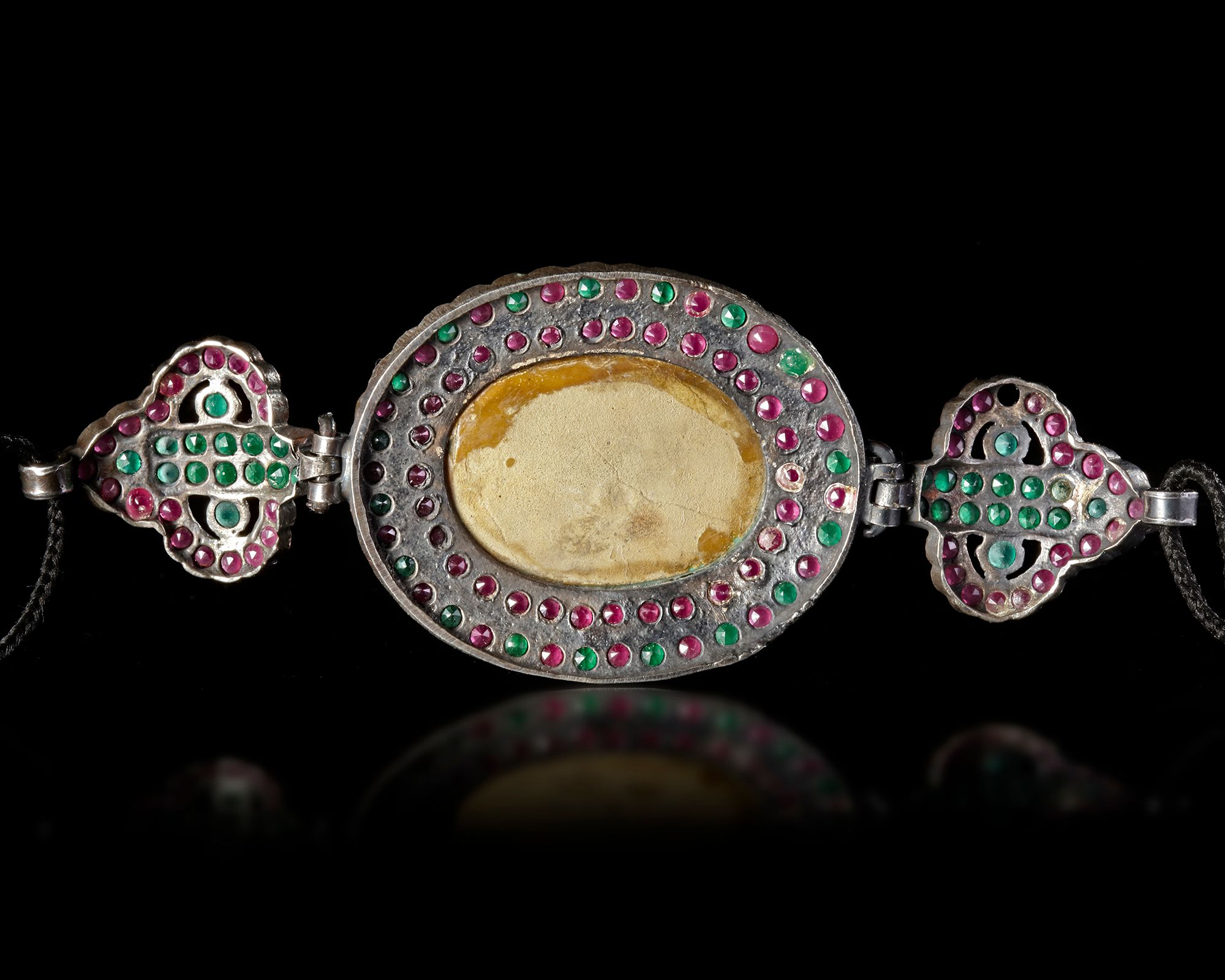 Of typical form, the central silver panel set with rounded turquoise stone engraved with Quran inscriptions in nastal'iq script, surrounded by two bands of rubies and emerald stones, with two hinged tapering foliate panels on either side similarly set. Length: 11.5 cm