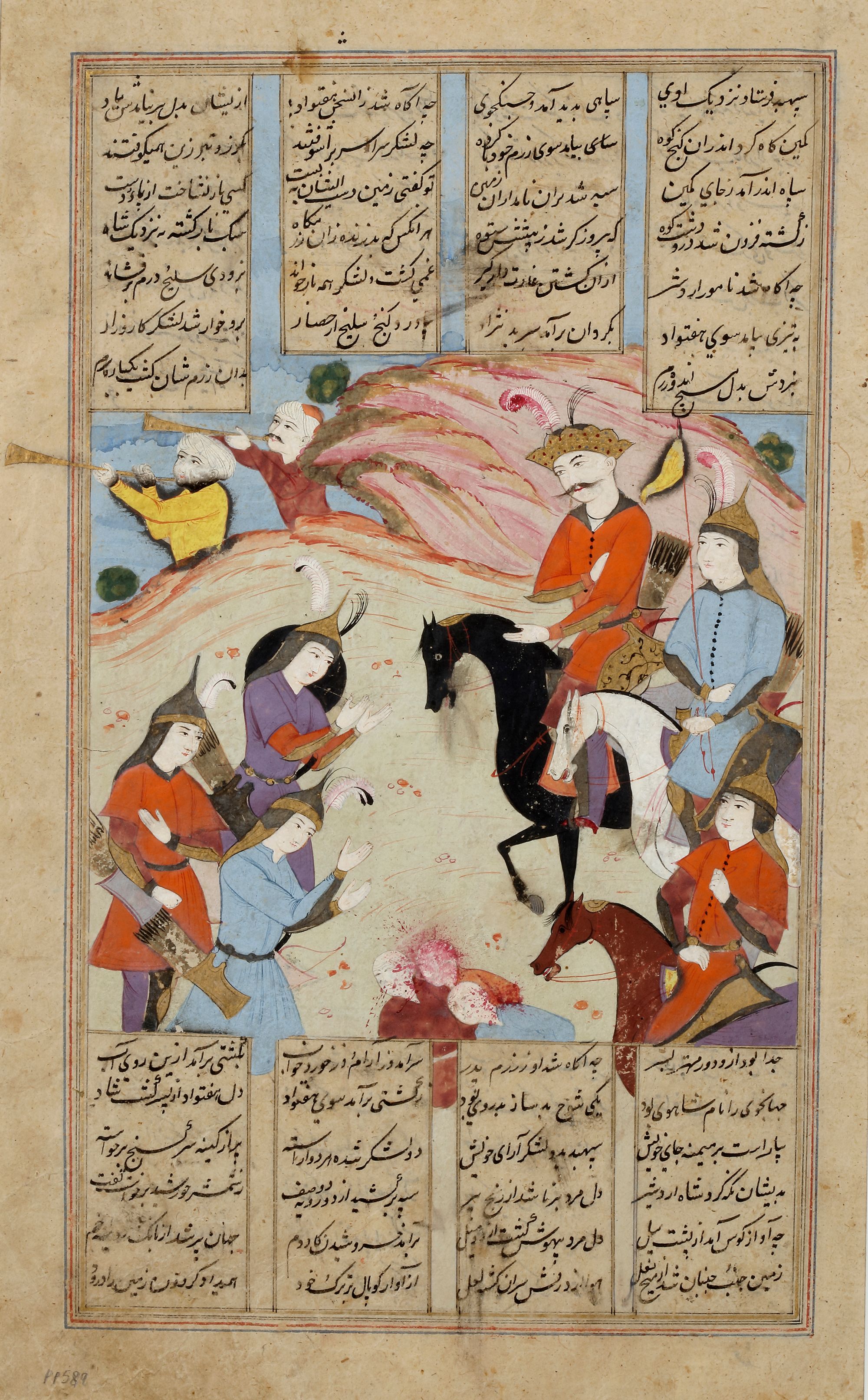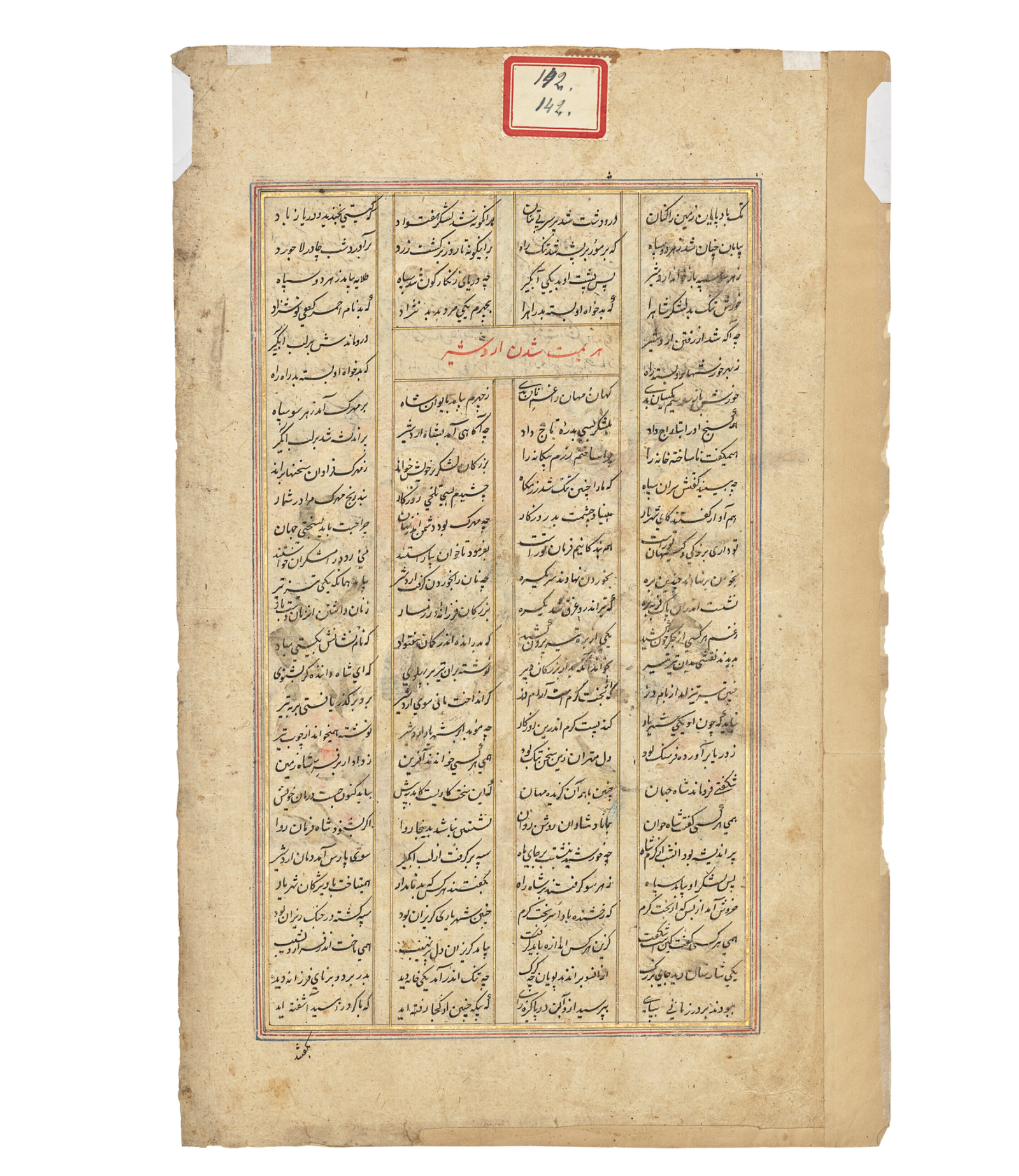 An illustration from the Shahnama of Firdawsi, opaque pigments heightened with gold on paper, with 13ll. of black nasta'liq above and below arranged in four columns, verso with 27ll. with section heading picked out in red, set within gold and polychrome rules, the margins plain, catchword, mounted.
