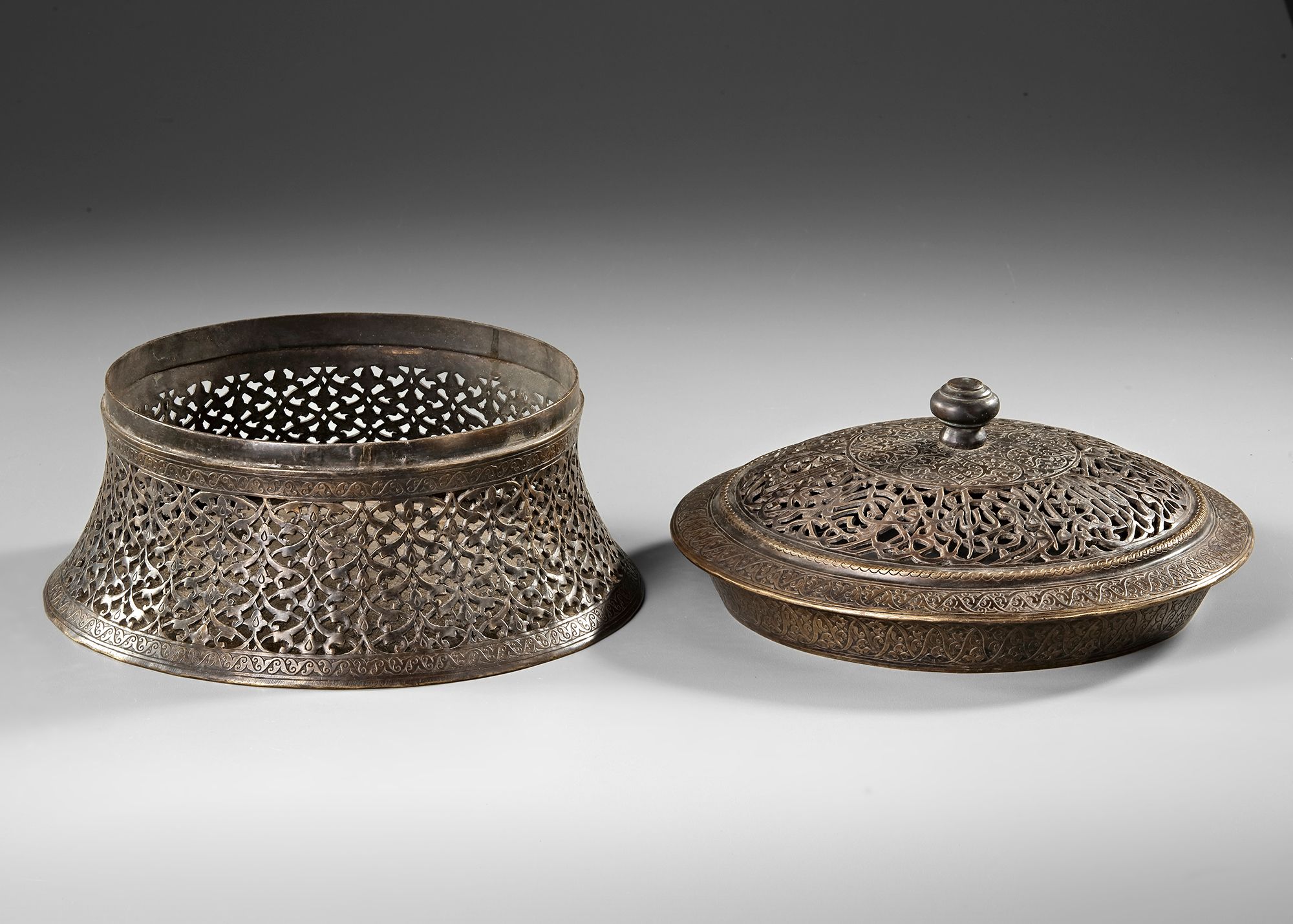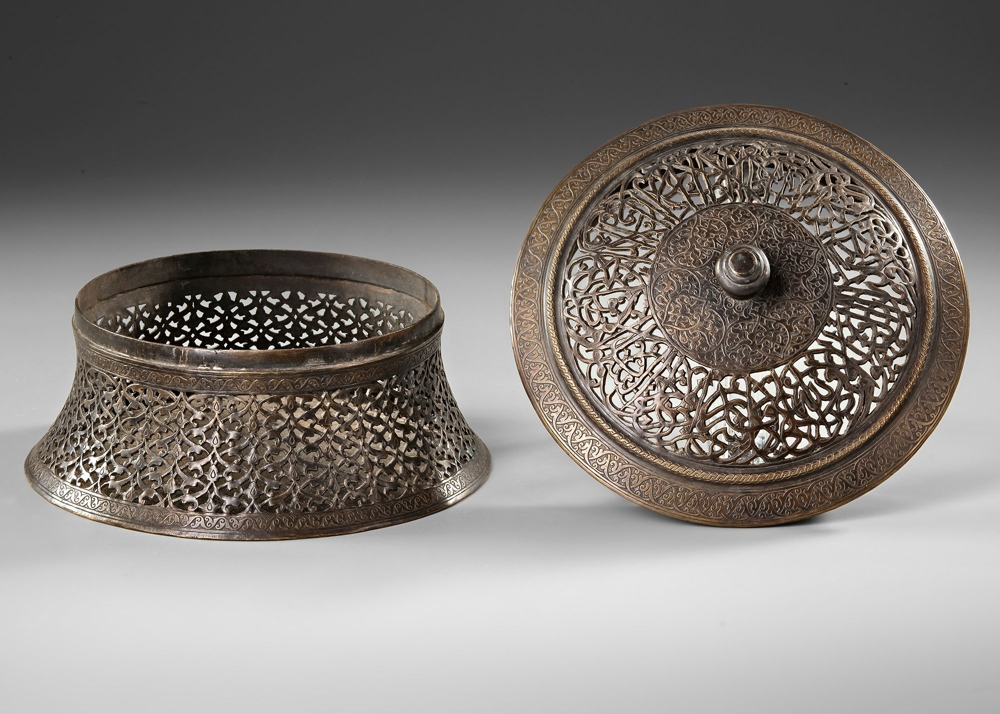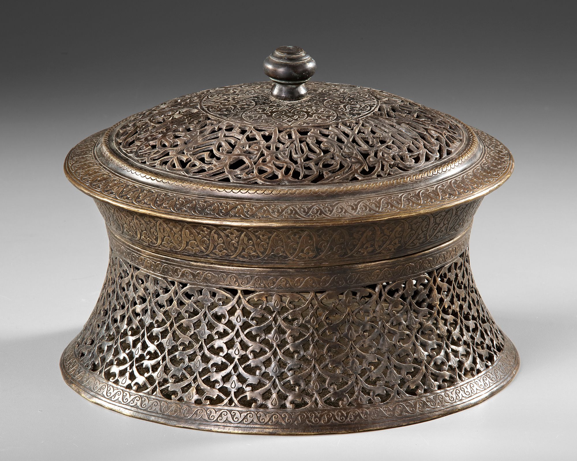 A tinned-copper pandan of splayed form, the lid flaring to a shoulder surmounted by a dome with raised central boss, profusely around the convex sides engraved and decorated in openwork with a repeat design of split-palmette interlace and floral and foliate motifs, the cover decorated with a pierced band of v.-189 and v,190 from surah Al-Imraan. Diam: 25 cm Height: 18 cm