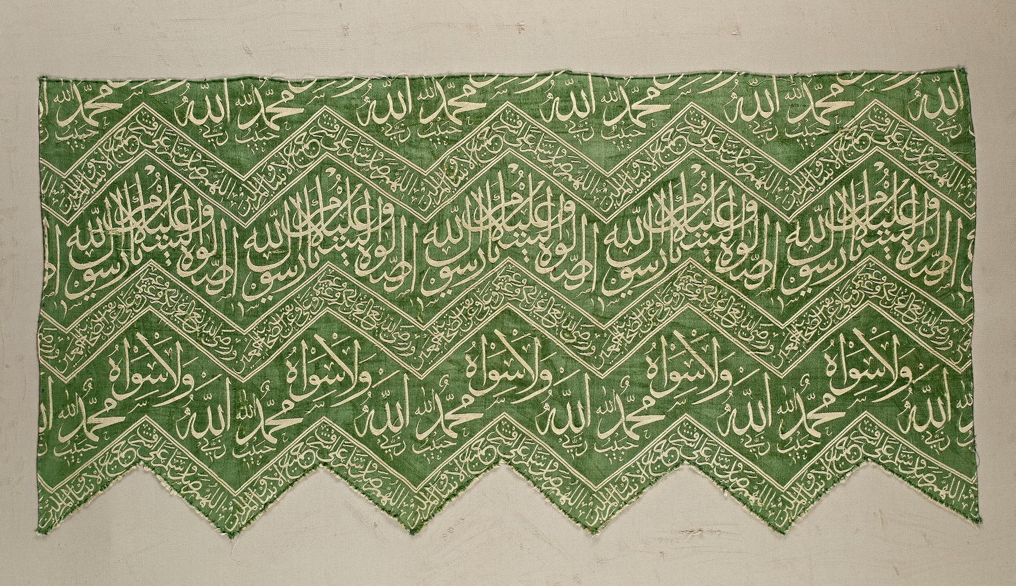 A fragment of hanging panel of the inner kiswa, with an inscribed weave in cream color over a light green silk ground. Embellished with a prominent inscription within a broad border in thuluth script of praise of the prophet ‘Prayer and peace be upon you, O Messenger of Allah’. Below with a narrow band containing prayers for the four righteous caliphs Abu Bakr, ‘Umar, ‘Uthman and ‘Ali as well as for the companions of the Prophet. At the top with a narrow band enclosing ‘O Allah, bless the Prophet Muhammad, the Seal of Prophets and Messengers’.