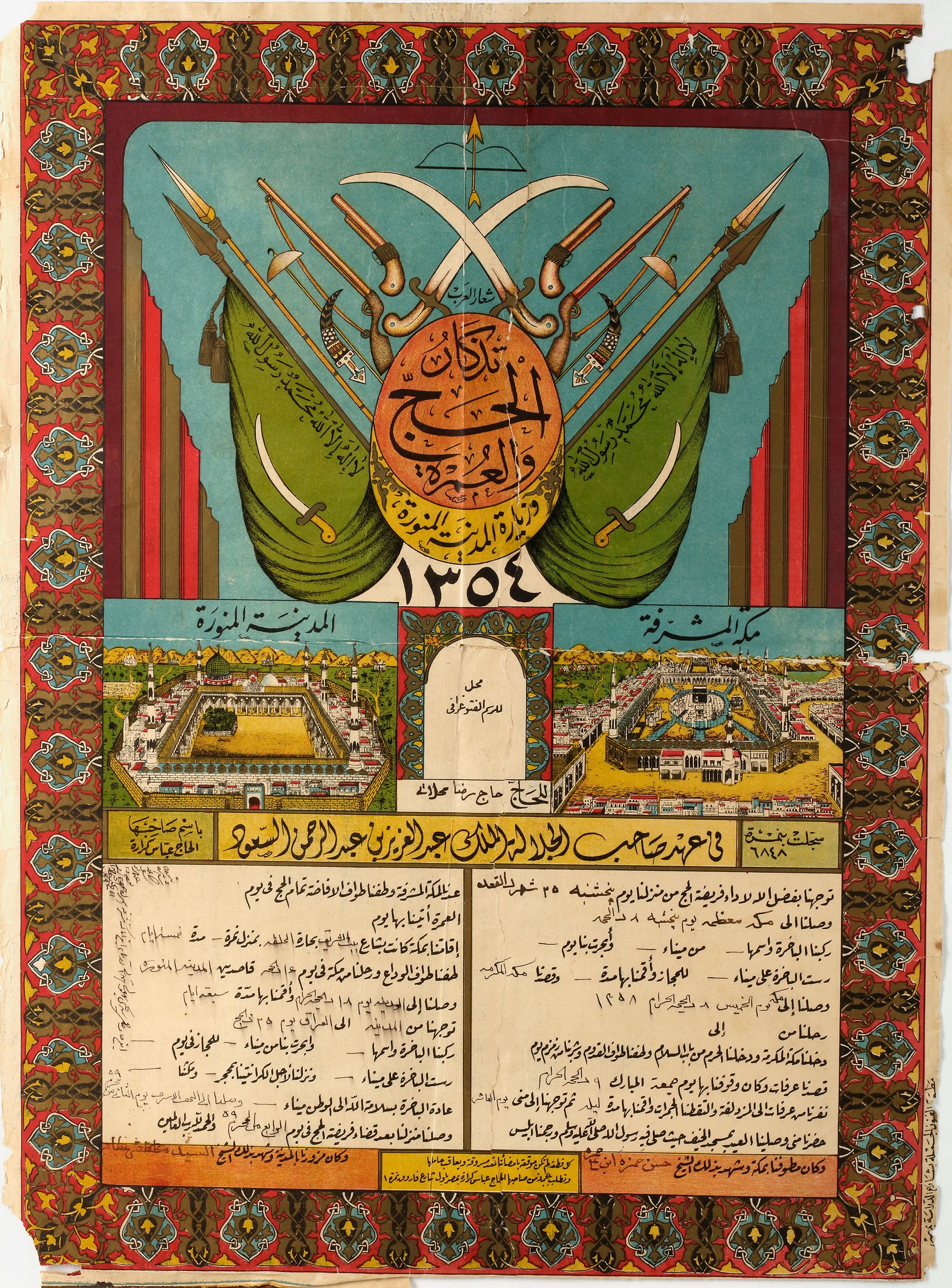 A printed Pilgrimage Certificate of Hajj ‘Abbas Kararah, dated 1354 AH/1935 AD, 40 by 55 cm.