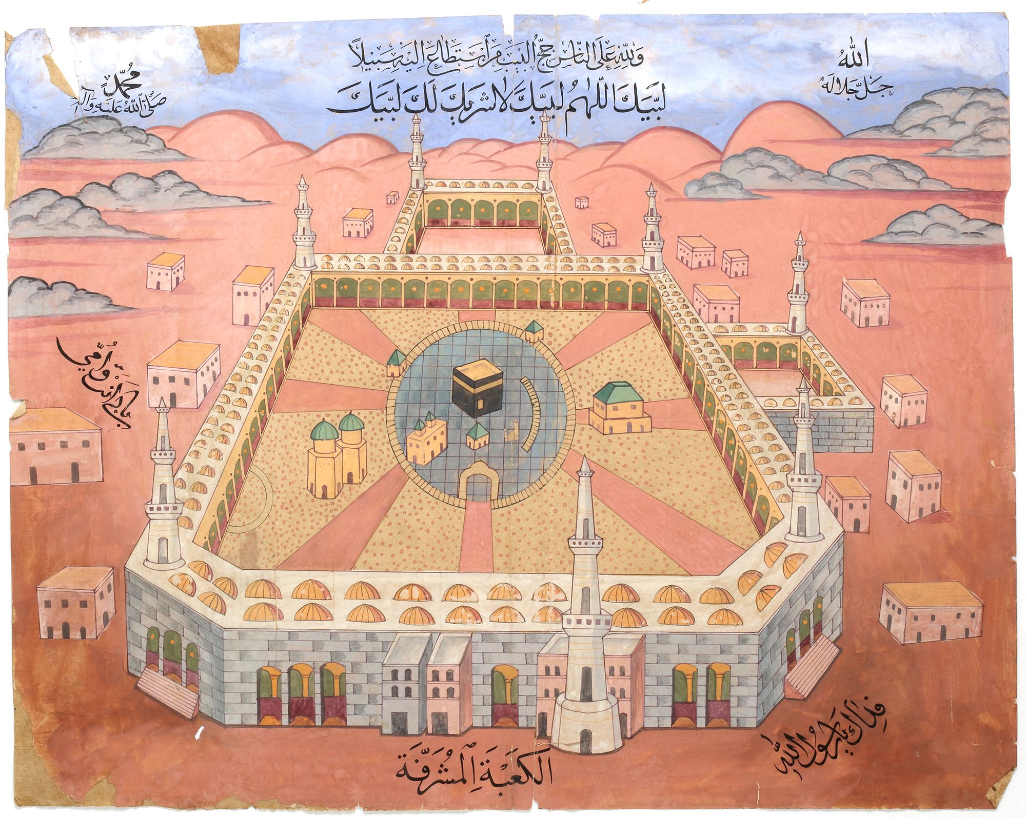 A view of al-Masjid al-Haram, watercolor heightened with gold paper, 35 by 44 cm.