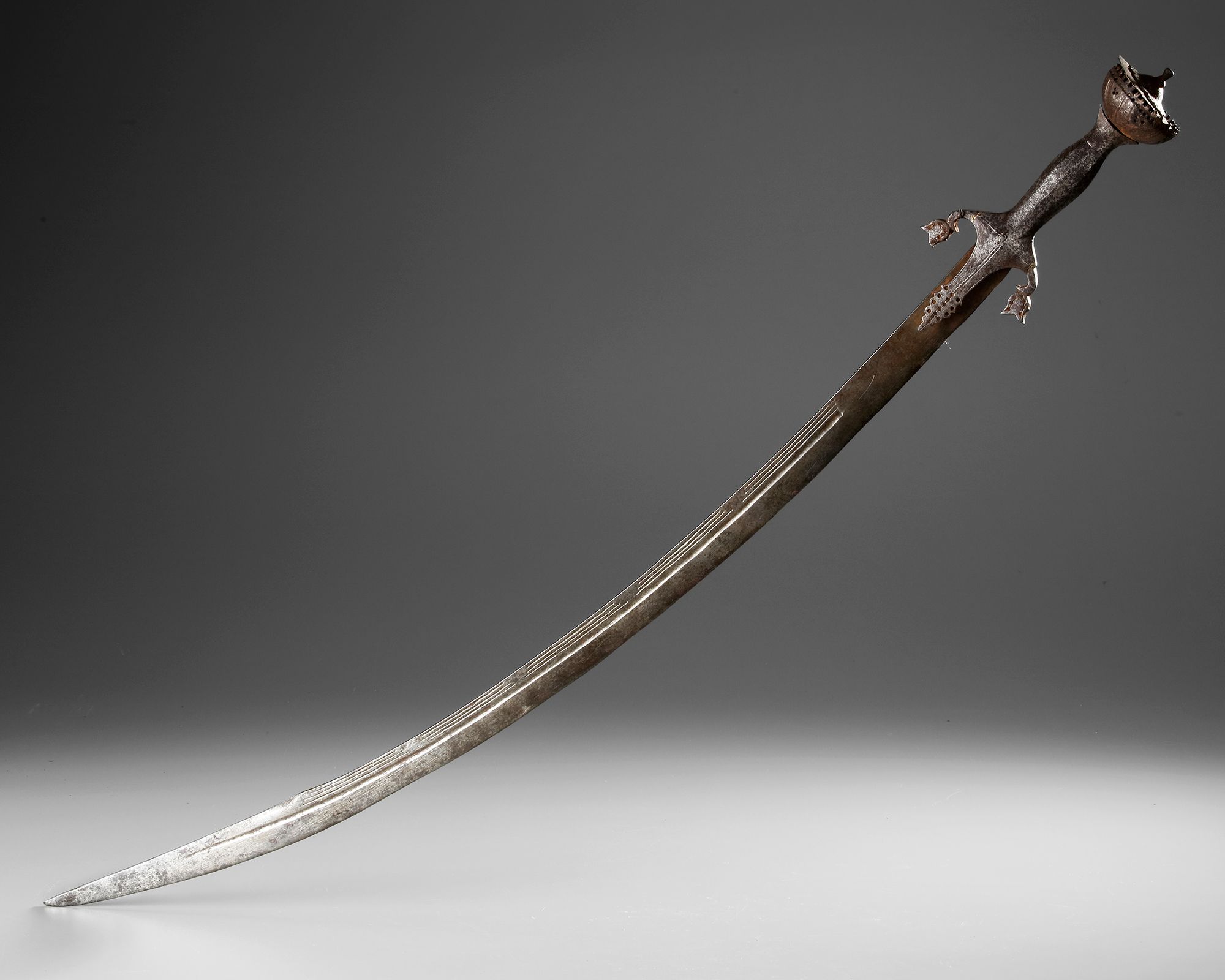An Indian sword with curved single-edged blade, stamped and inscribed. The iron hilt with shaped langets and integral grip, and a large disc pommel.