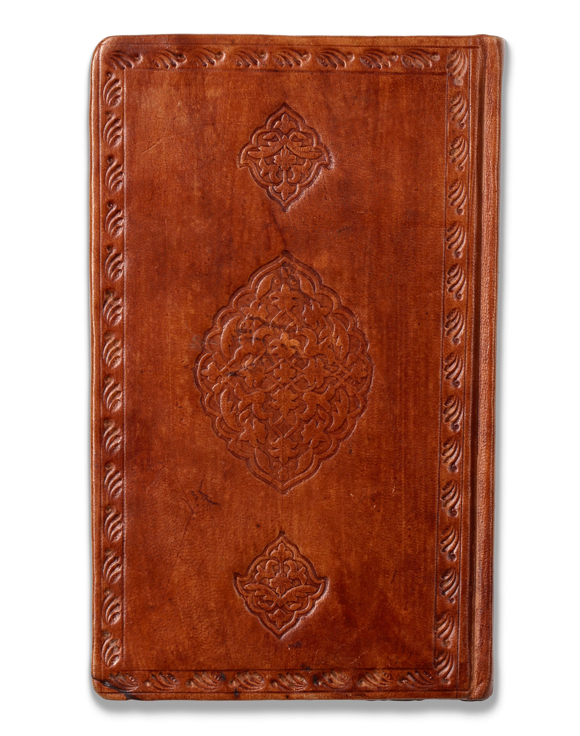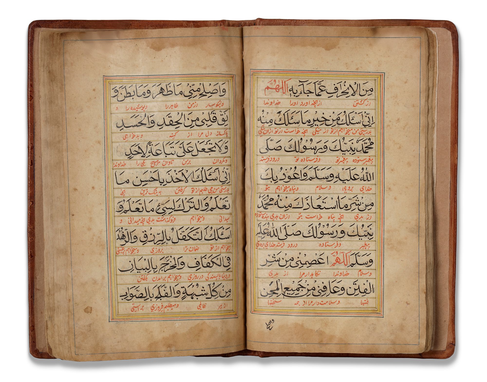Arabic manuscript on paper depicting prayers in honour of the Prophet Muhammad, each folio with 8 lines written in elegant black naskh script, interlinear translations in red, some words picked out in red, text within polychrome rules, an opening biofolio with royal gold and blue decoration.