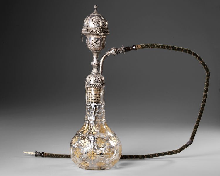 Featuring intricate silver embellishments. The ornate designs on the glass body, likely hand-painted or gilded in gold, display traditional motifs that are often found in decorative arts from this era. The silver work on the top and mouthpiece has a finely filigreed design, showcasing the craftsmanship typical of high-quality luxury items from this period.