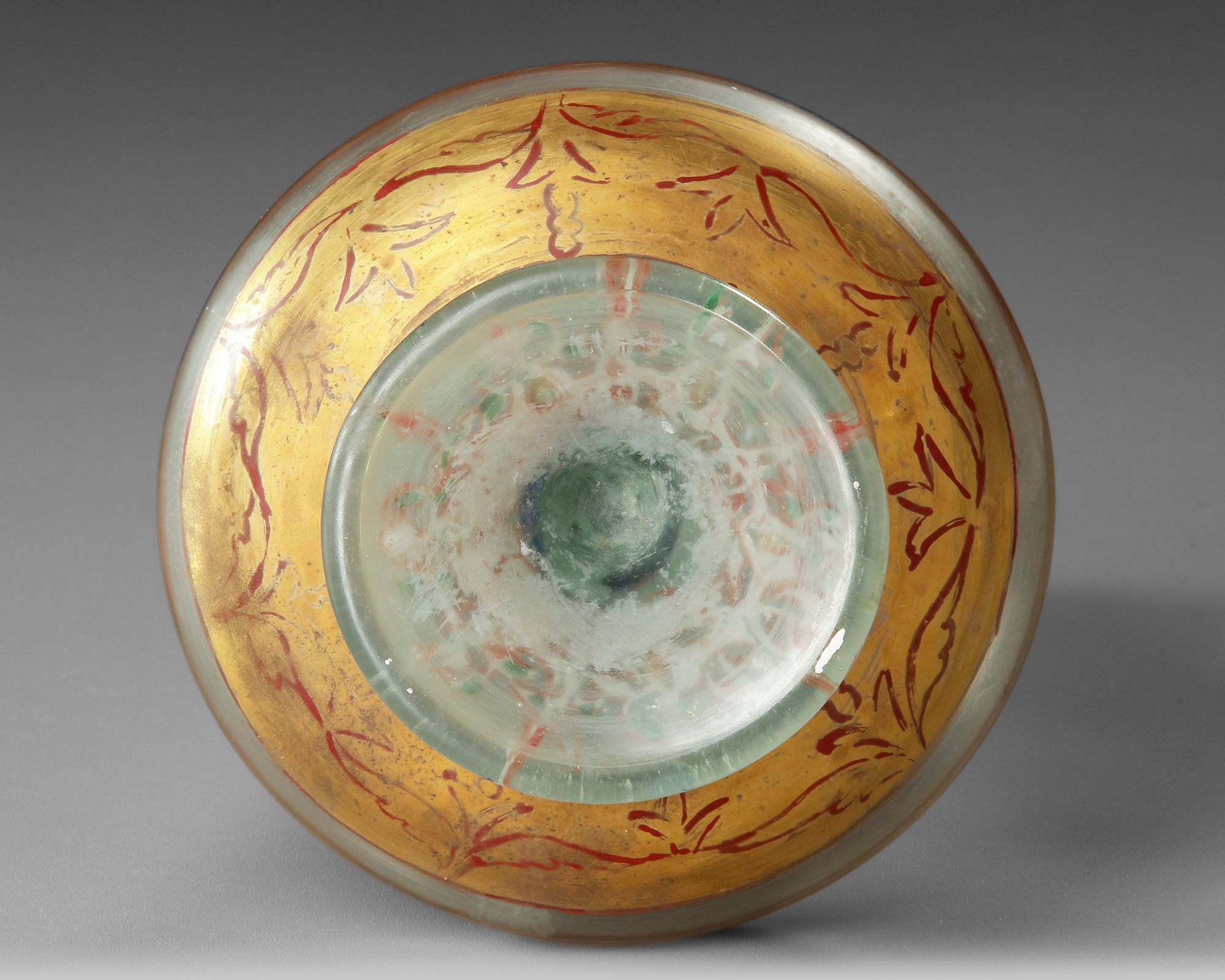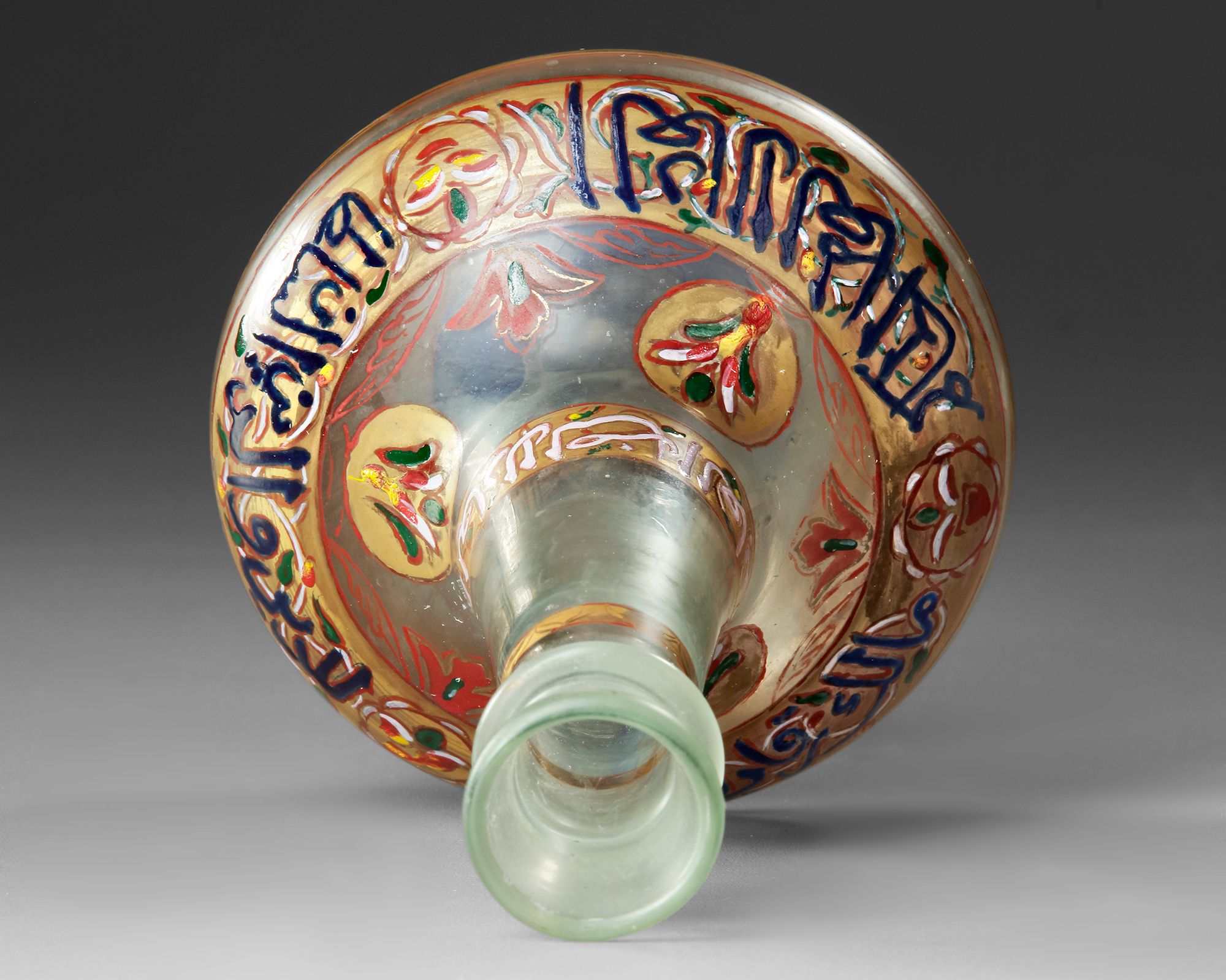 A glass flask of compressed globular form with a long, slender, tapering neck and collar with an everted lip, on a high conical flared foot, panited in blue and white around the body and the neck with bands enclosing Arabic inscriptions in thuluth script on gilt ground, further roundels and bands containing foliage, and polychrome enameled floral details.