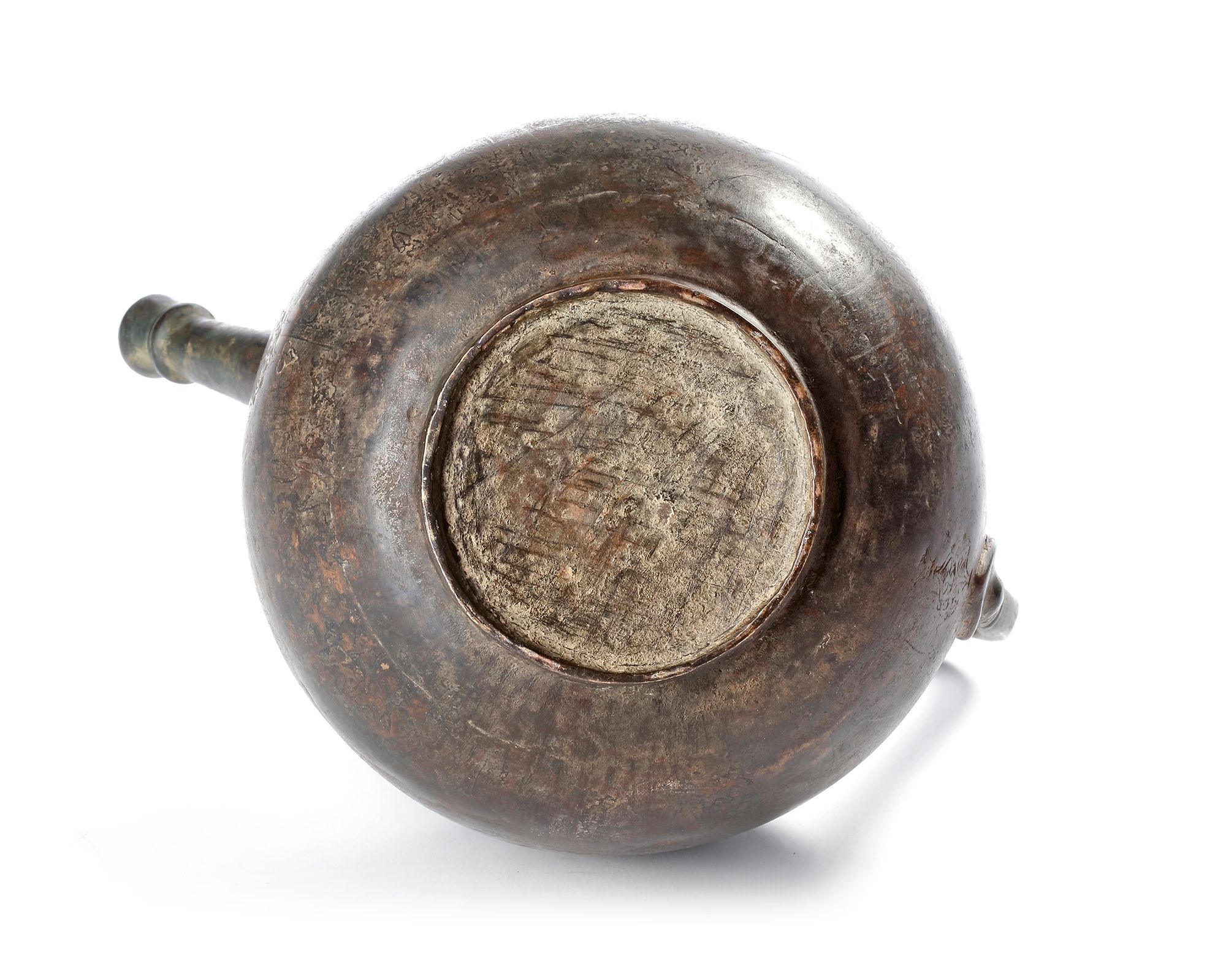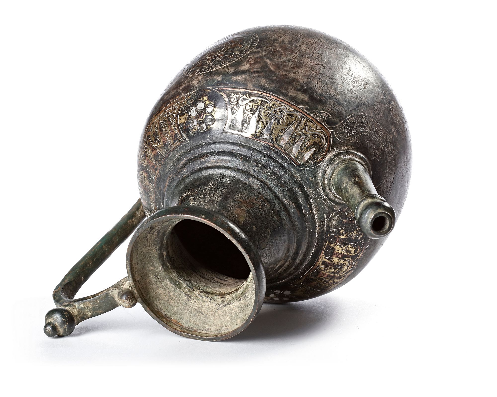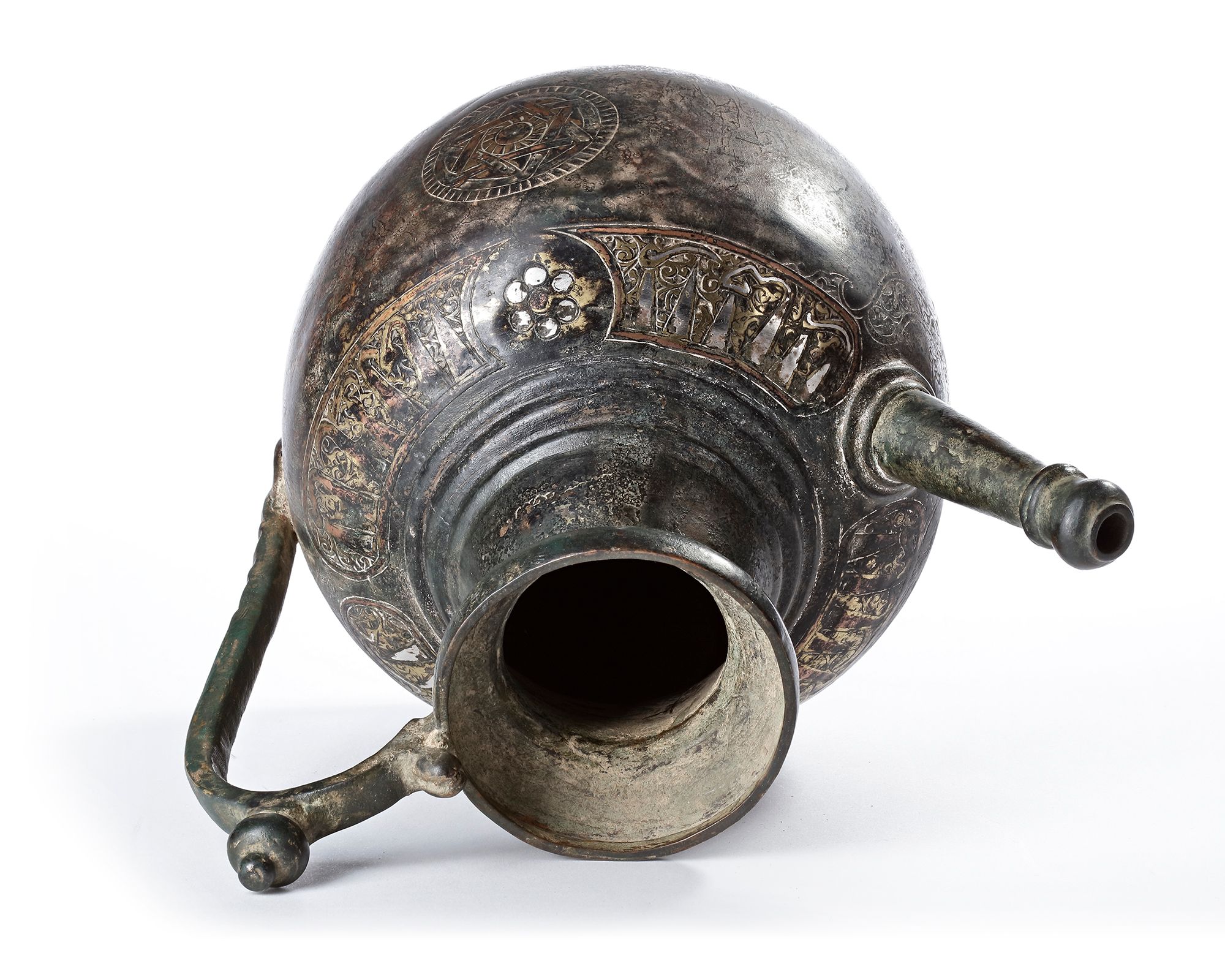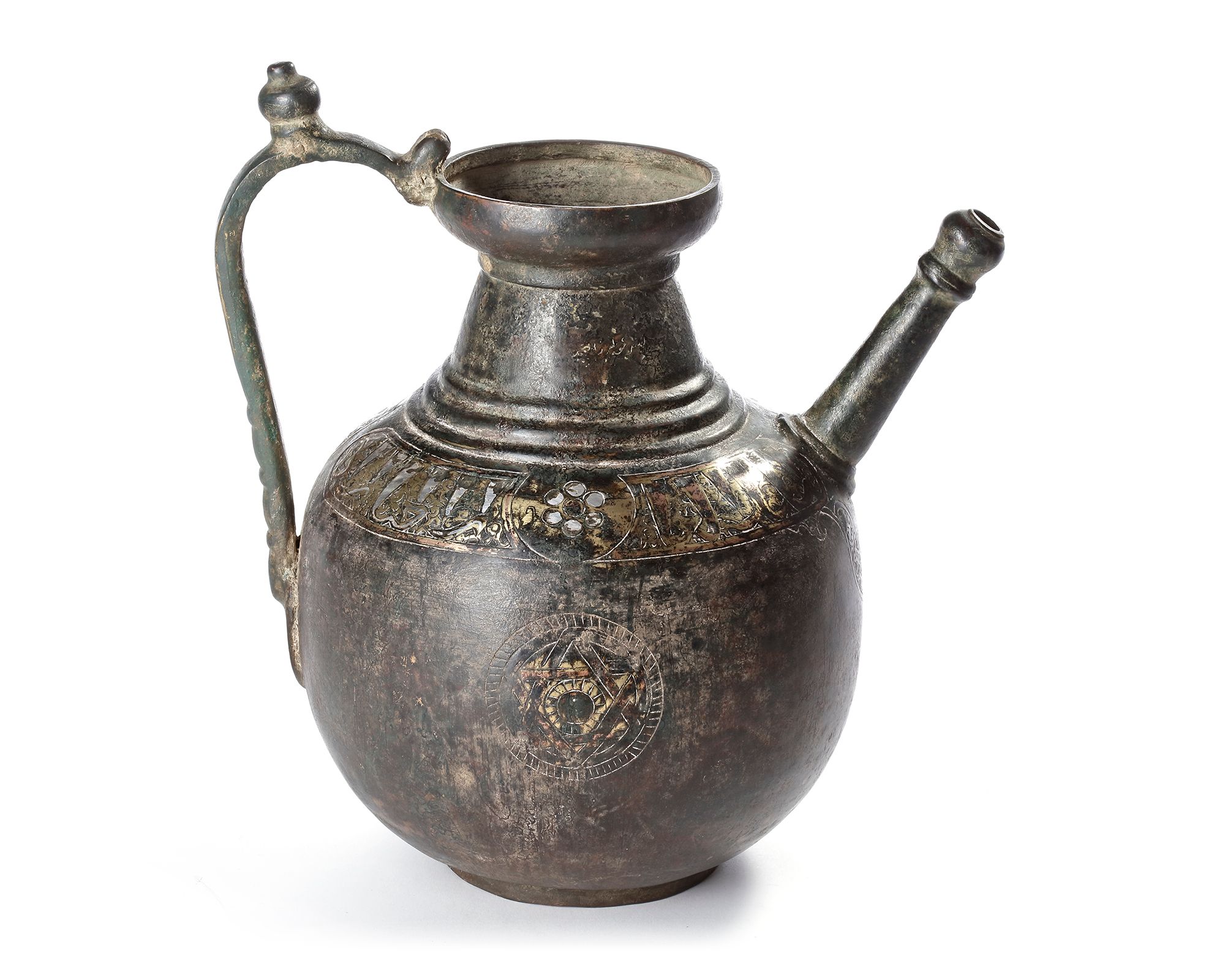 A Persian bronze ewer with spherical body and tapering cylindrical neck, a simple spout with a straight handle connecting the body with the mouth. The body decorated with two roundels enclosing six-sided stars, under the spout a band of floral motifs, around the shoulder trapezoid cartouches of inscriptions in naskh script separated by roundels containing each a cluster of silver-inlaid dots.
