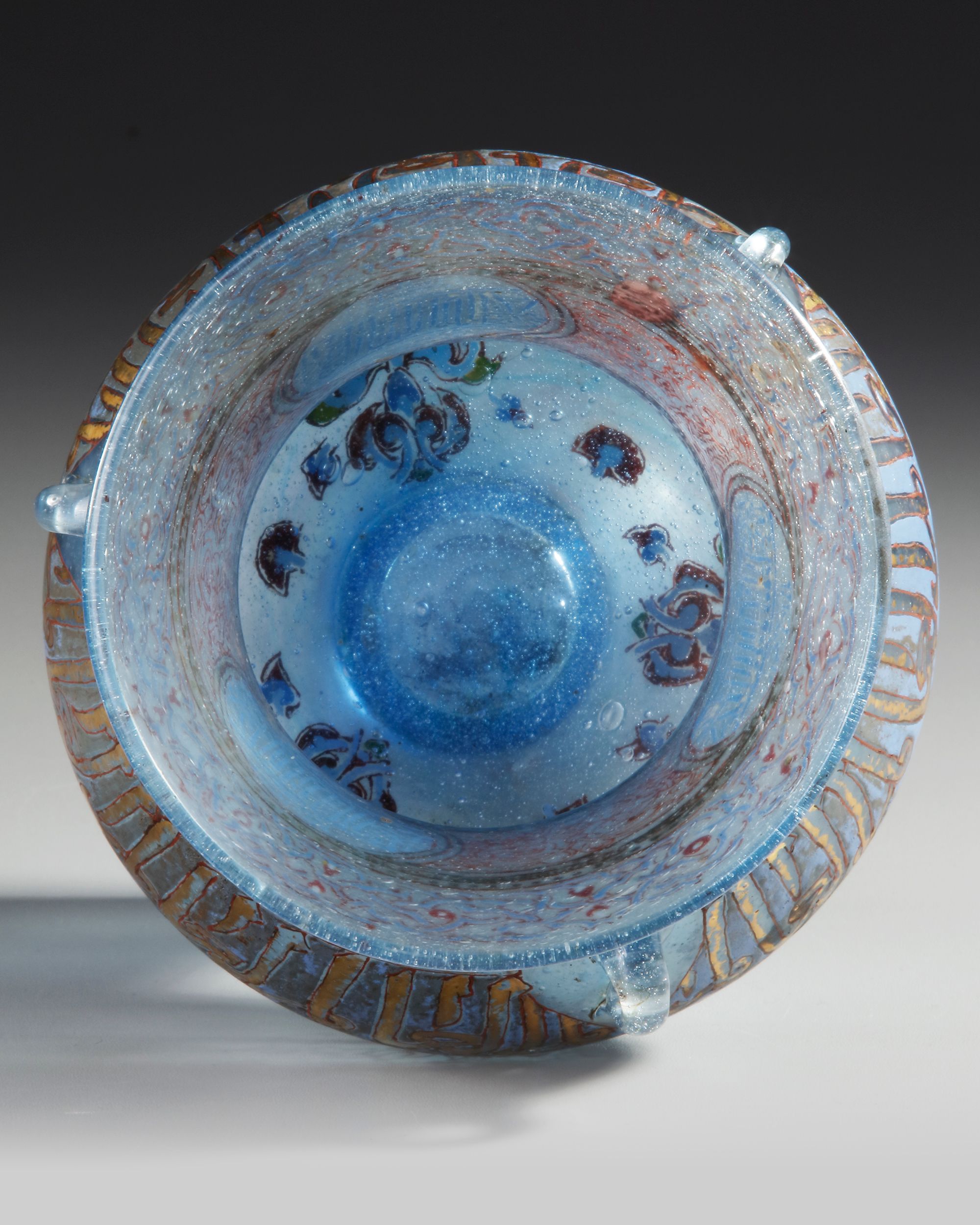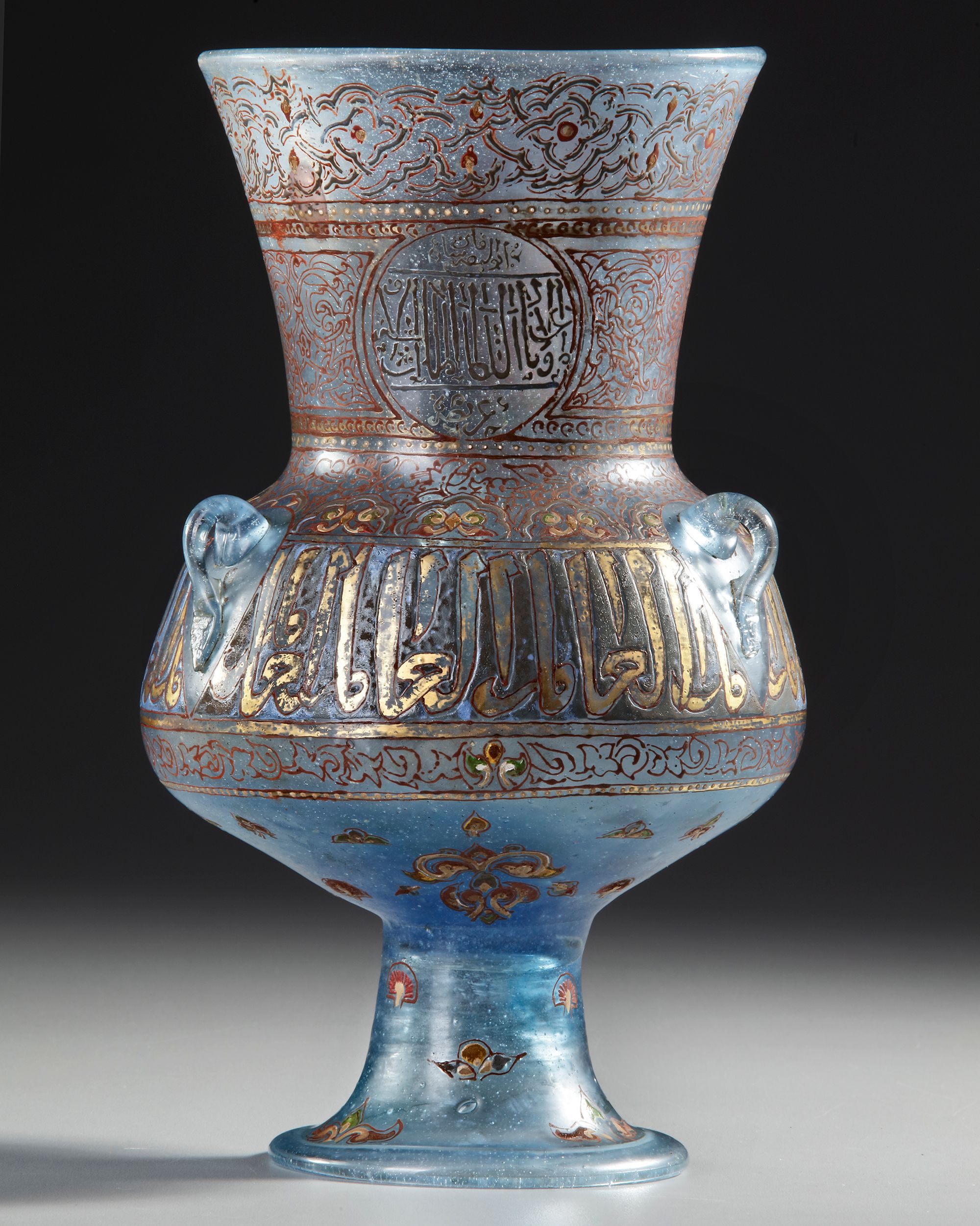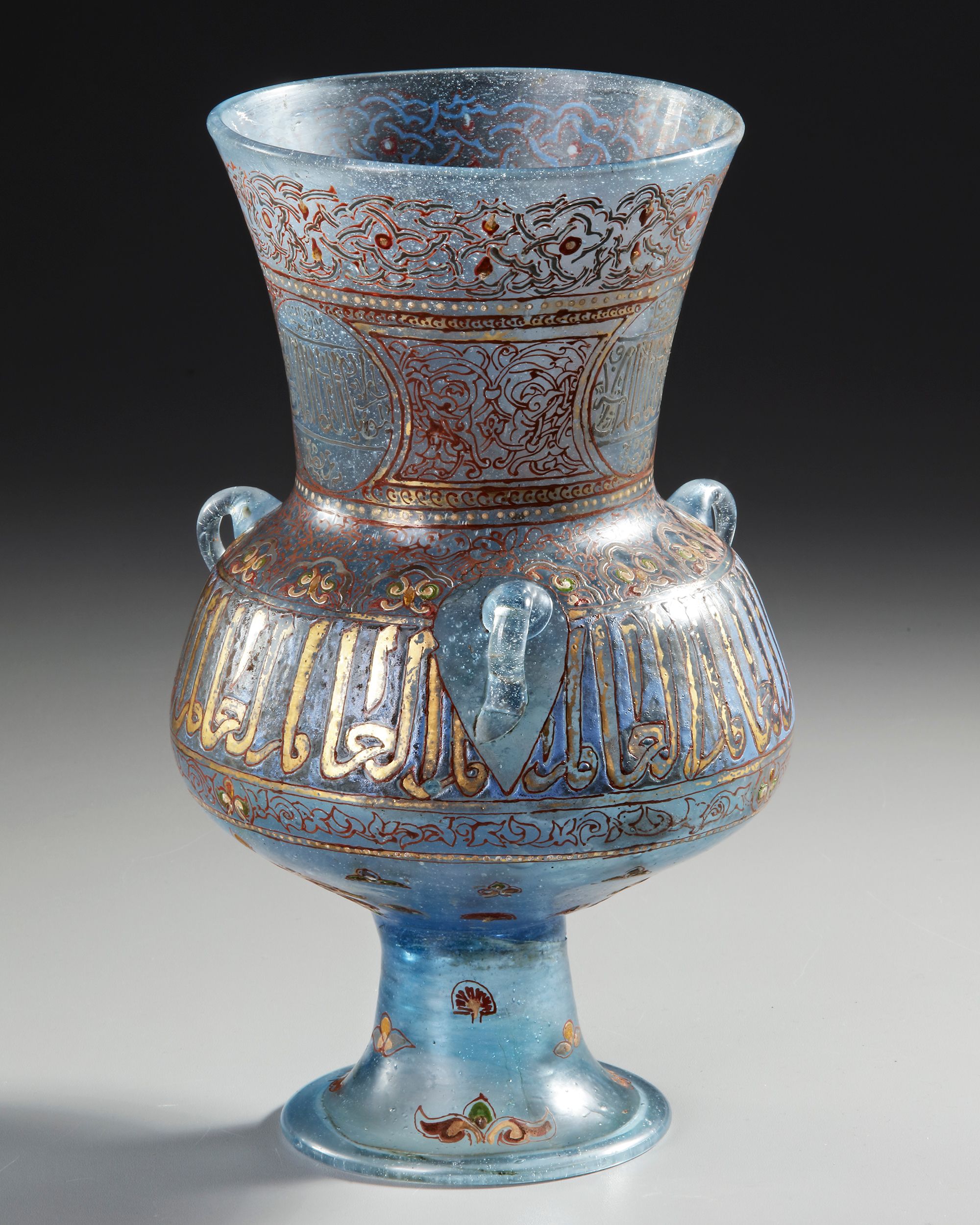 A glass mosque lamp of typical form, the rounded angular body with flaring conical mouth, three applied loop handles around the body, decorated in red, gold and blue enamel with a band of inscription in gold thuluth outlined in red, the neck with scrolling tendrils overlaid with inscriptions in thuluth all interspersed by three roundels enclosing inscriptions, further stylized with a band of vegetal interlace. Inscriptions: Around the body: a repetition of the word "Al-Alim, Learned," in large, thuluth script. Around the neck within roundels: "Mawlana, al-sultan al-malik al-ashraf, Glory to our lord, the Sultan, the King, the Learned". Height: 24 cm