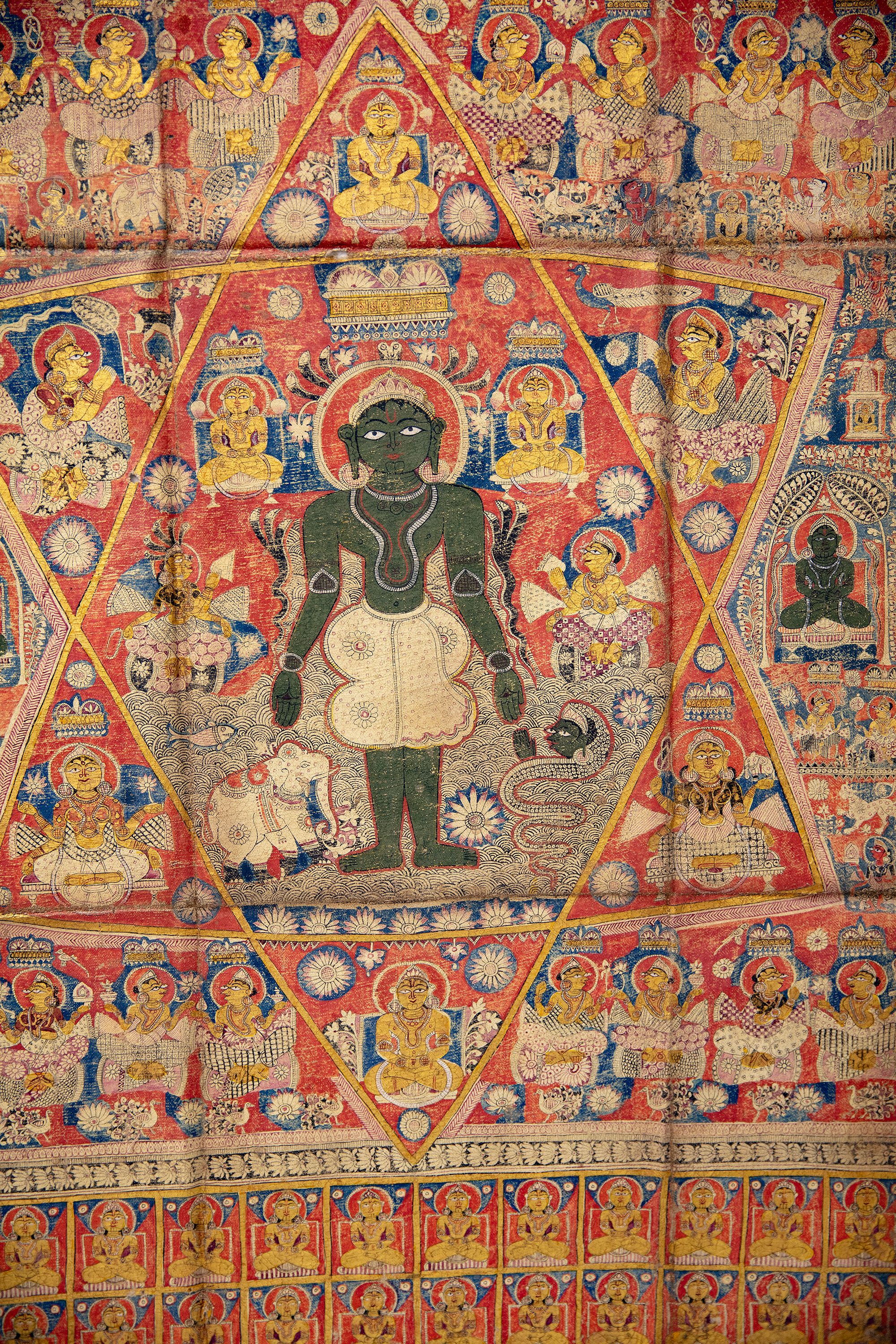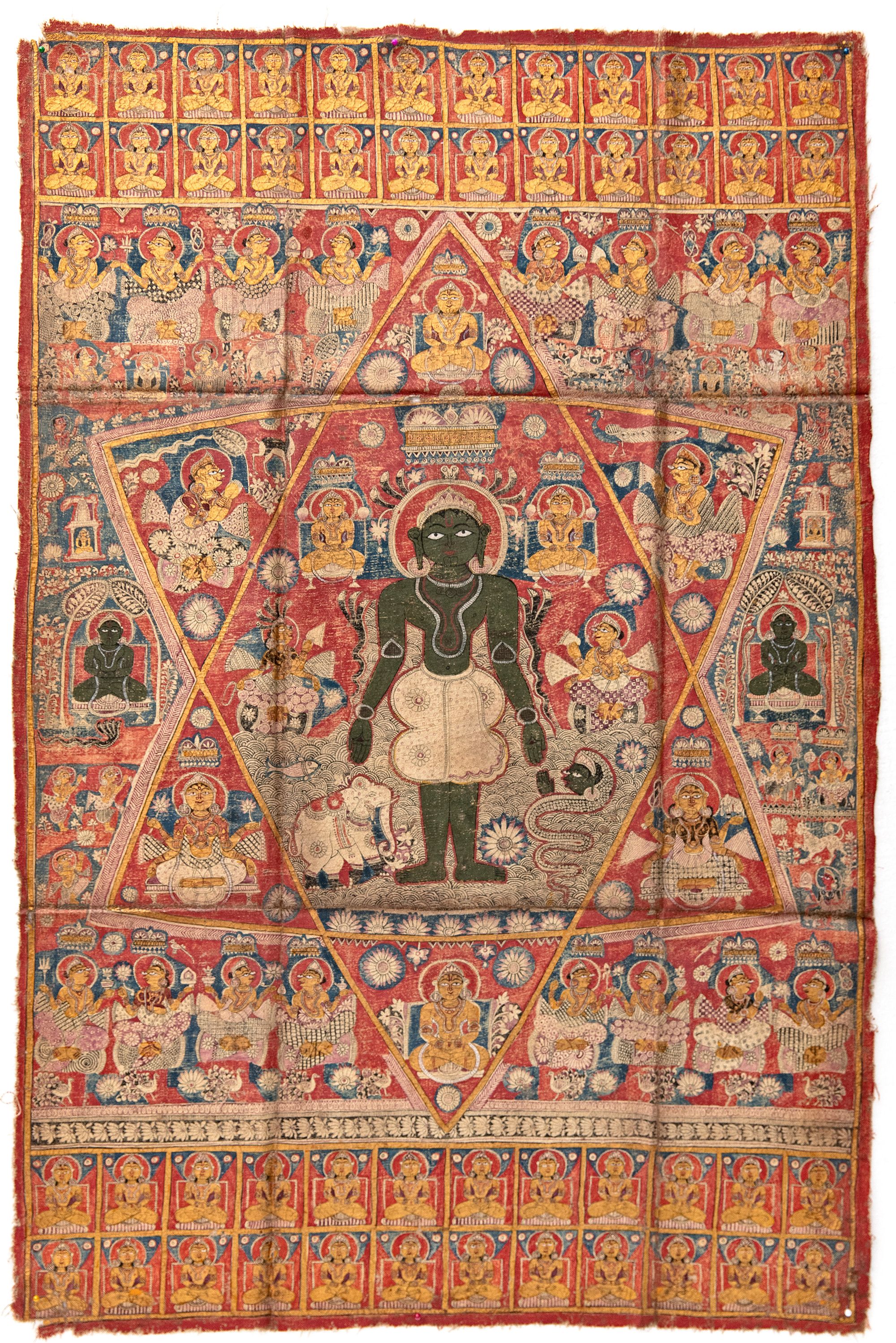 Opaque pigments and gold on cloth. Parshvanatha is depicted in the center standing protected by a hood of nagas issuing from his golden crown, draped in a white dhoti with foliate designs, his body adorned in jewelry, all above a smaller figure of the tirthankara above a lotus. The central deity surrounded by several lobed and star-shaped panels (satkonas) representing the cosmos and its phenomena . 80 by 53 cm.