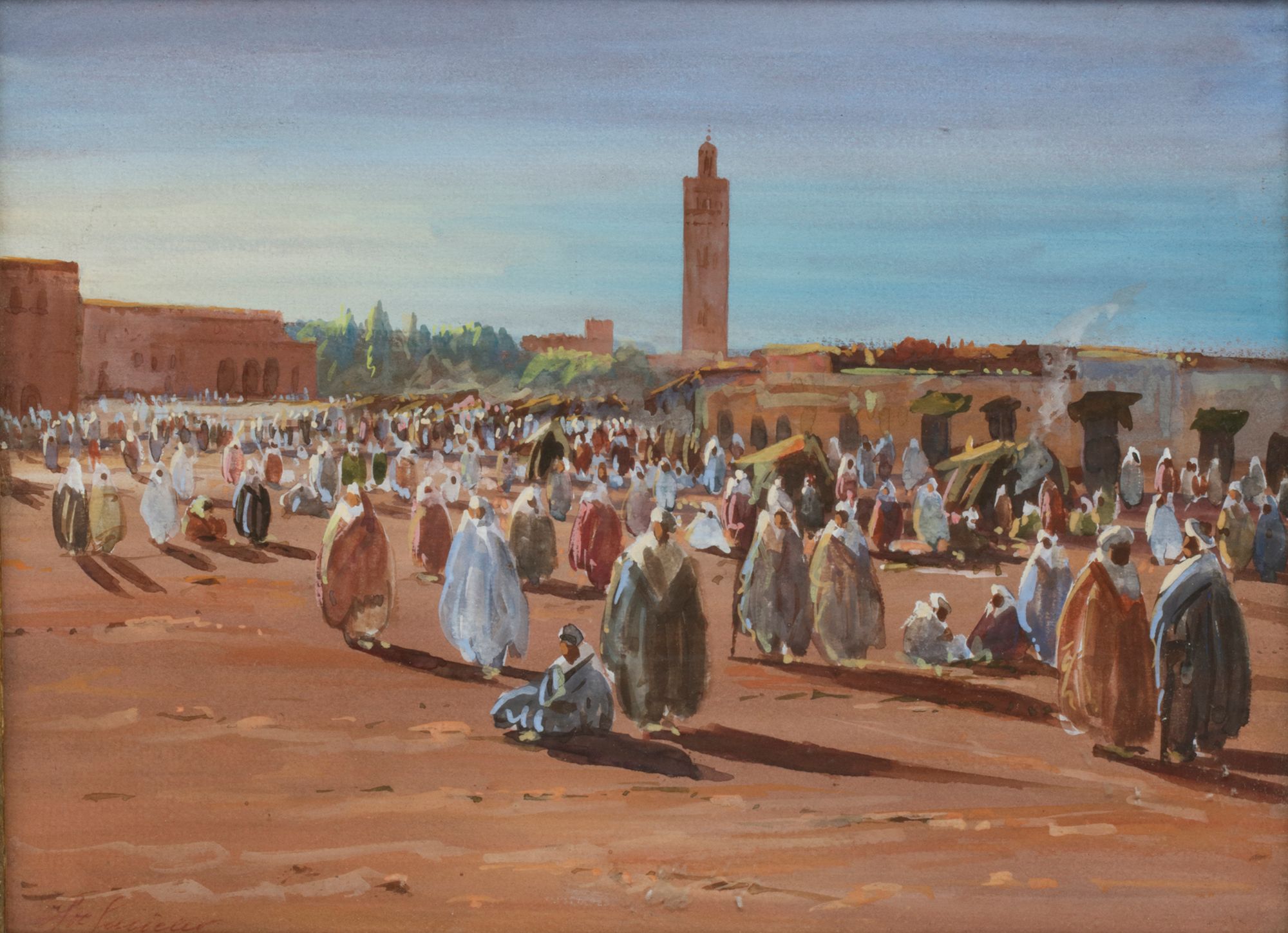 Marketplace Djemaa el-Fna in Marrakech. Signed indistinctly lower left Favieur (?). Gouache on paper. 23,5 by 32 cm.