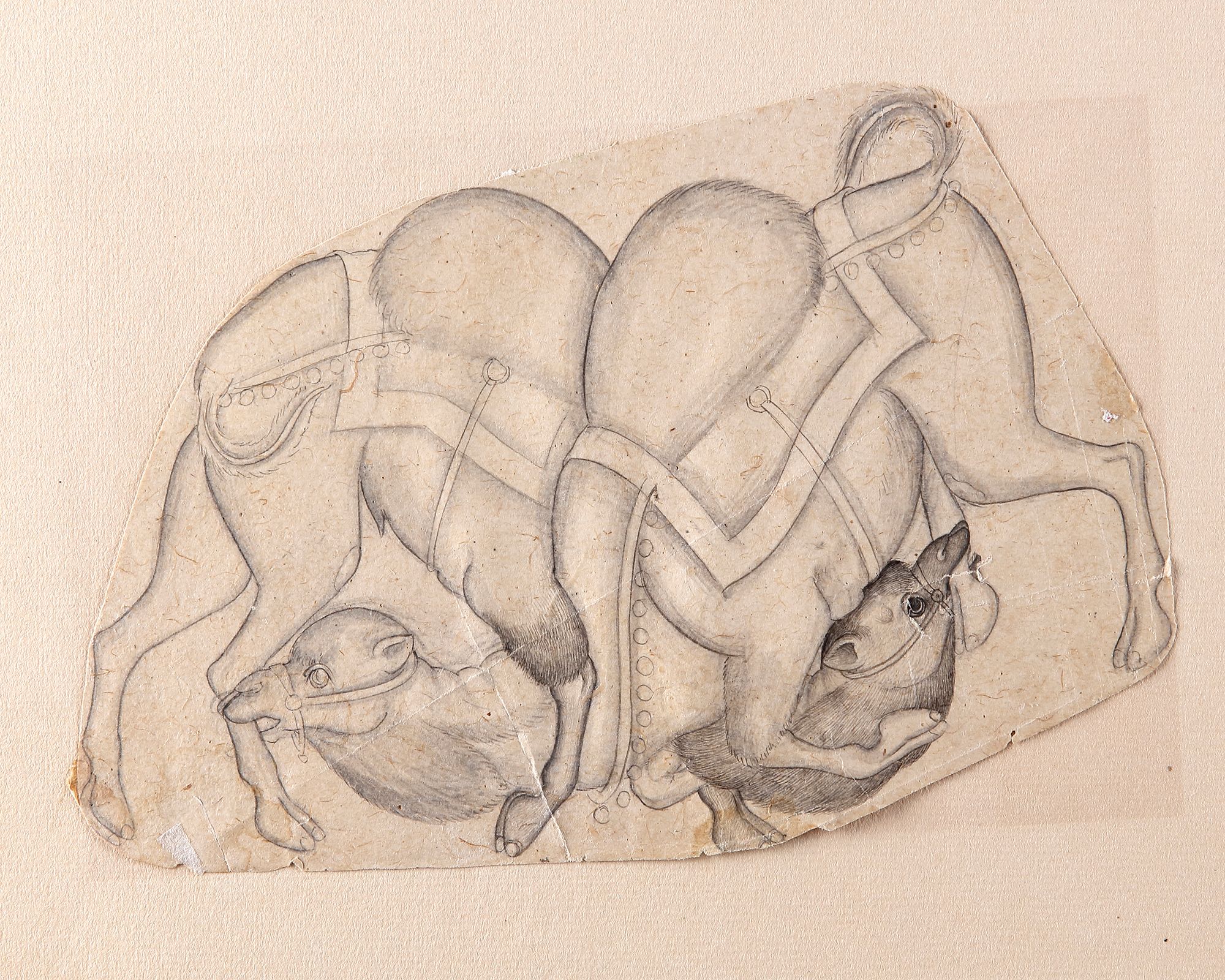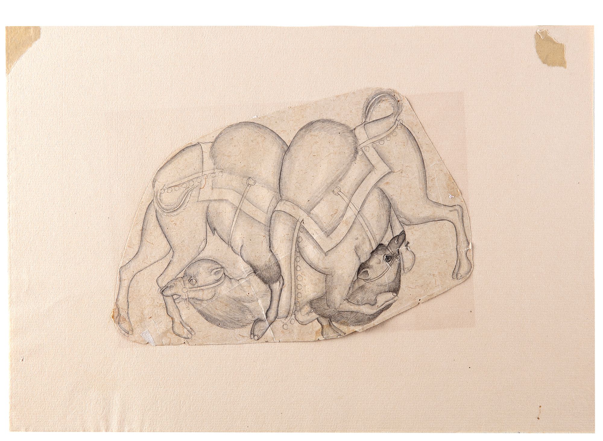 Ink on paper, depicting a finely executed drawing of two camels engaged in combat, their bodies tightly interlocked in a dynamic, almost knot-like composition. Delicate linework and subtle shading articulate the musculature and movement, while decorative harnesses indicate that the animals are domesticated. 12 by 18 cm