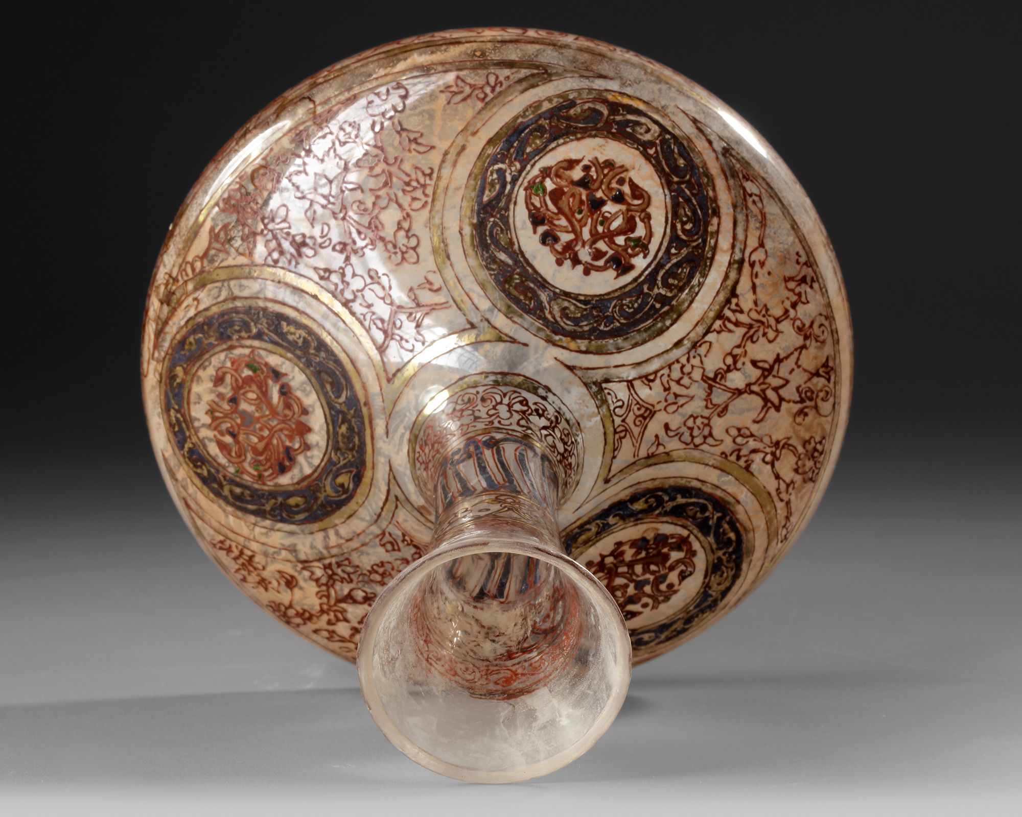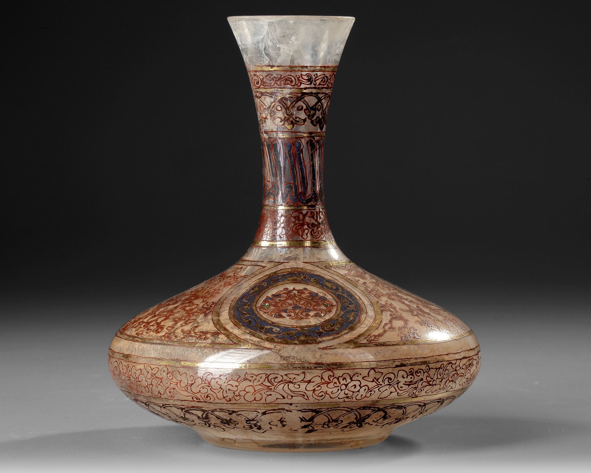 An Islamic glass bottle vase with a compressed body rising to a long, tapering neck, enamelled in blue, red, and gold. The design features a wide band around the body containing roundels enclosing floral motifs, interspersed with red and adorned with a dense pattern of floral scrolls, positioned above two bands of vegetative motifs. The neck is stylized with a band enclosing inscriptions in large thuluth script, set between bands of classic scrolls.