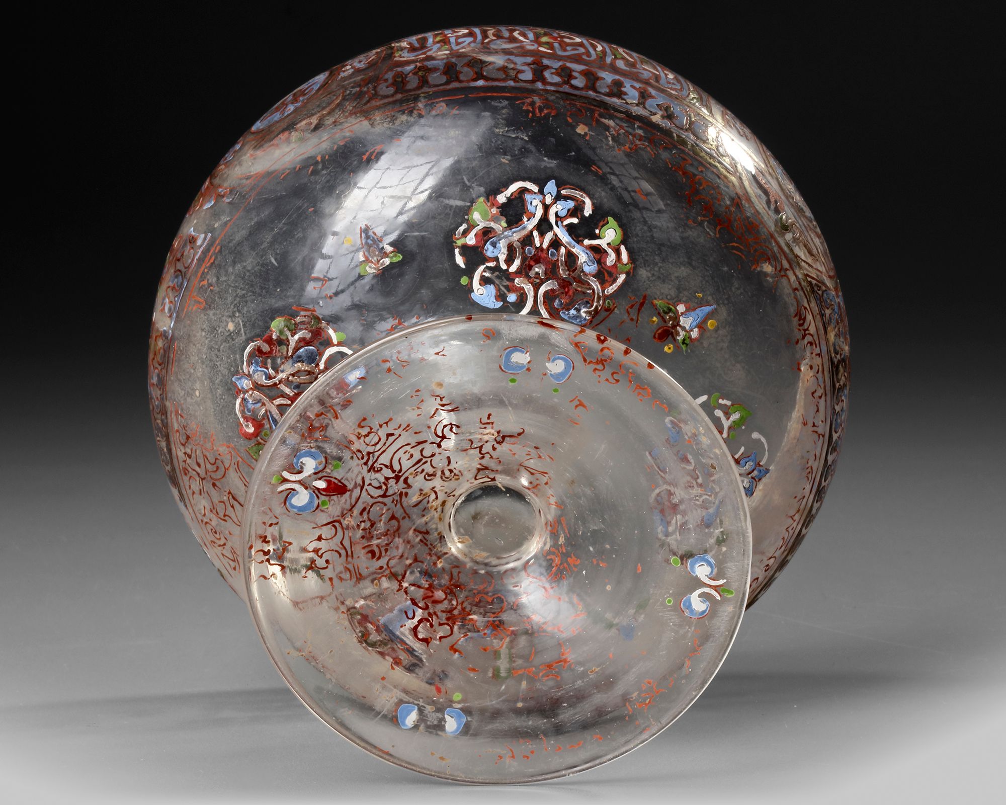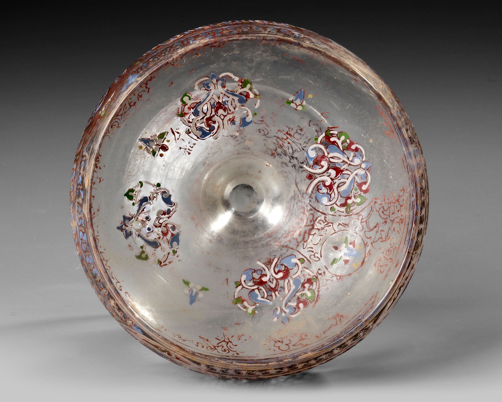 An Islamic glass footed bowl: a rounded bowl with conical sides, standing on a pronounced, tall foot. It is enamelled in red, green, blue, and traces of gilding. The bowl features a wide band containing four roundels enclosing vegetative motifs and four bands of inscriptions in large thuluth script, placed between two narrow bands of floral scrolls. The spreading foot is decorated in red with stylized floral motifs.