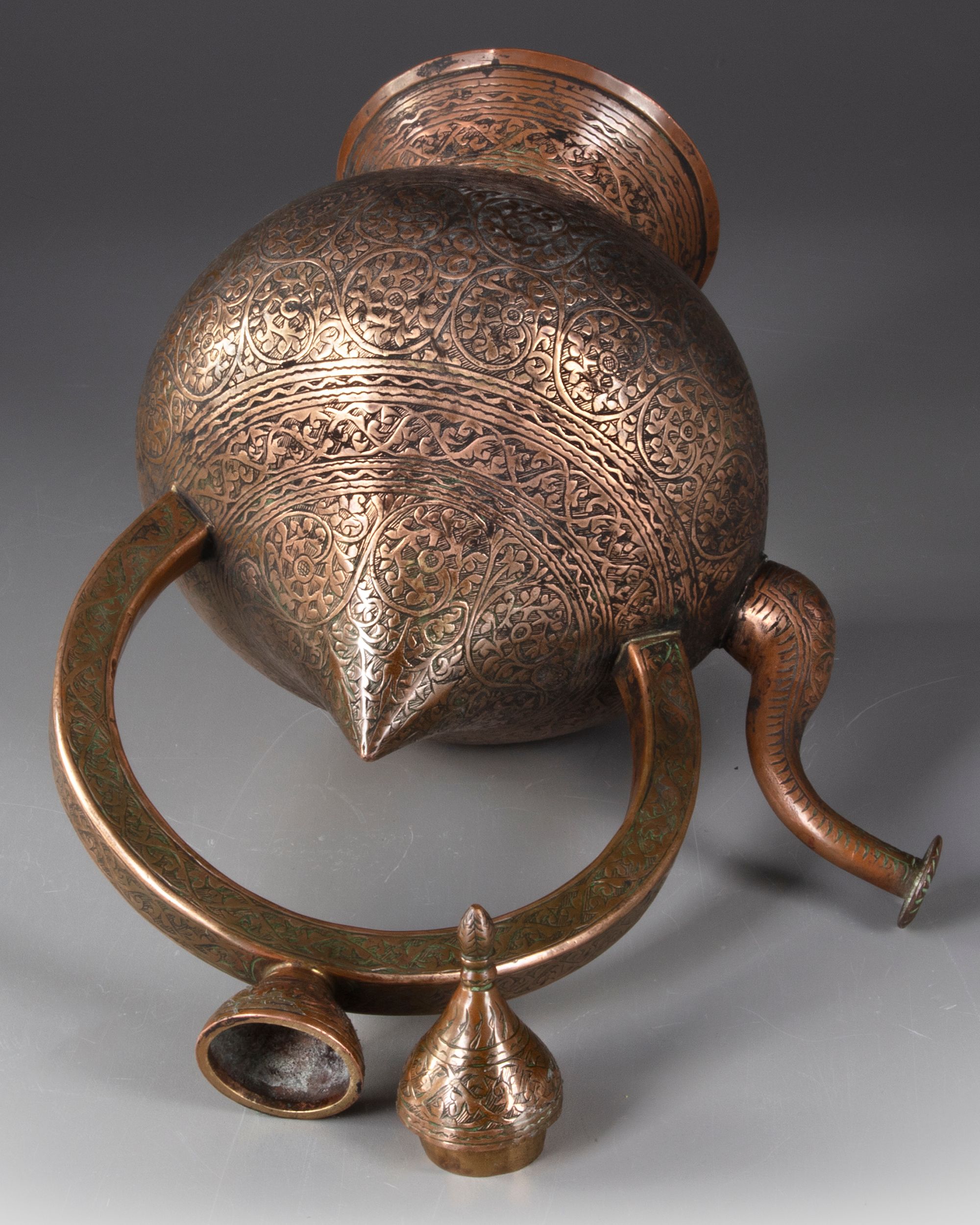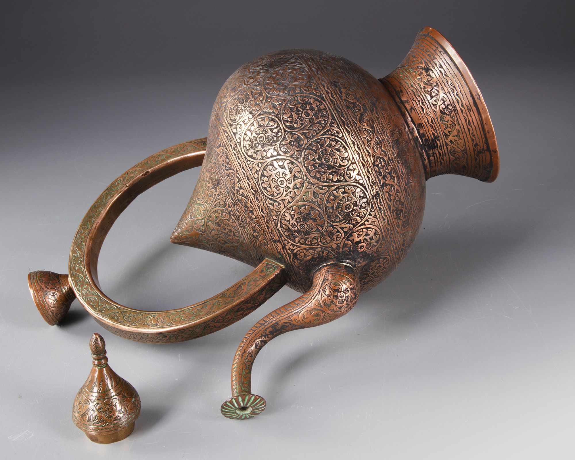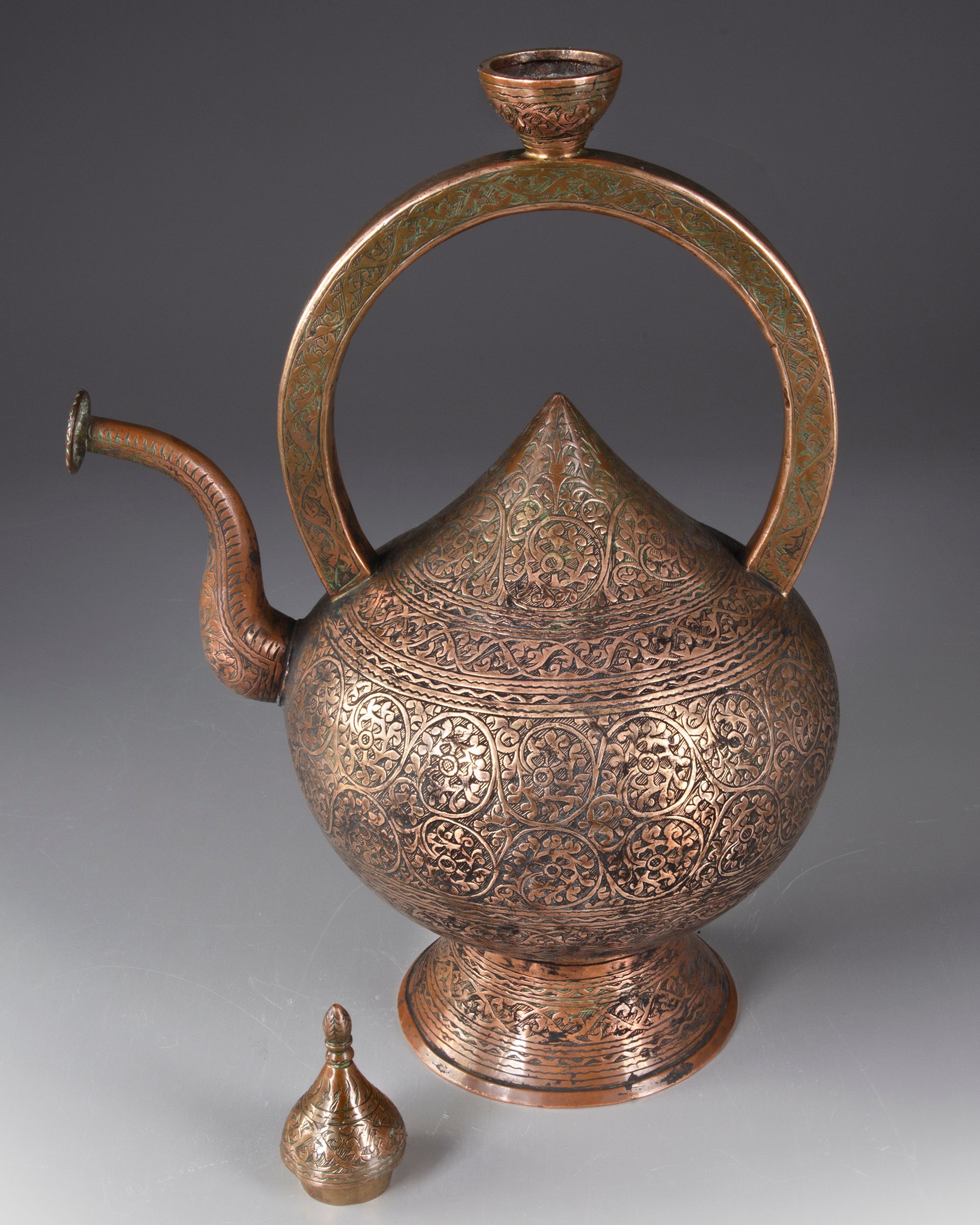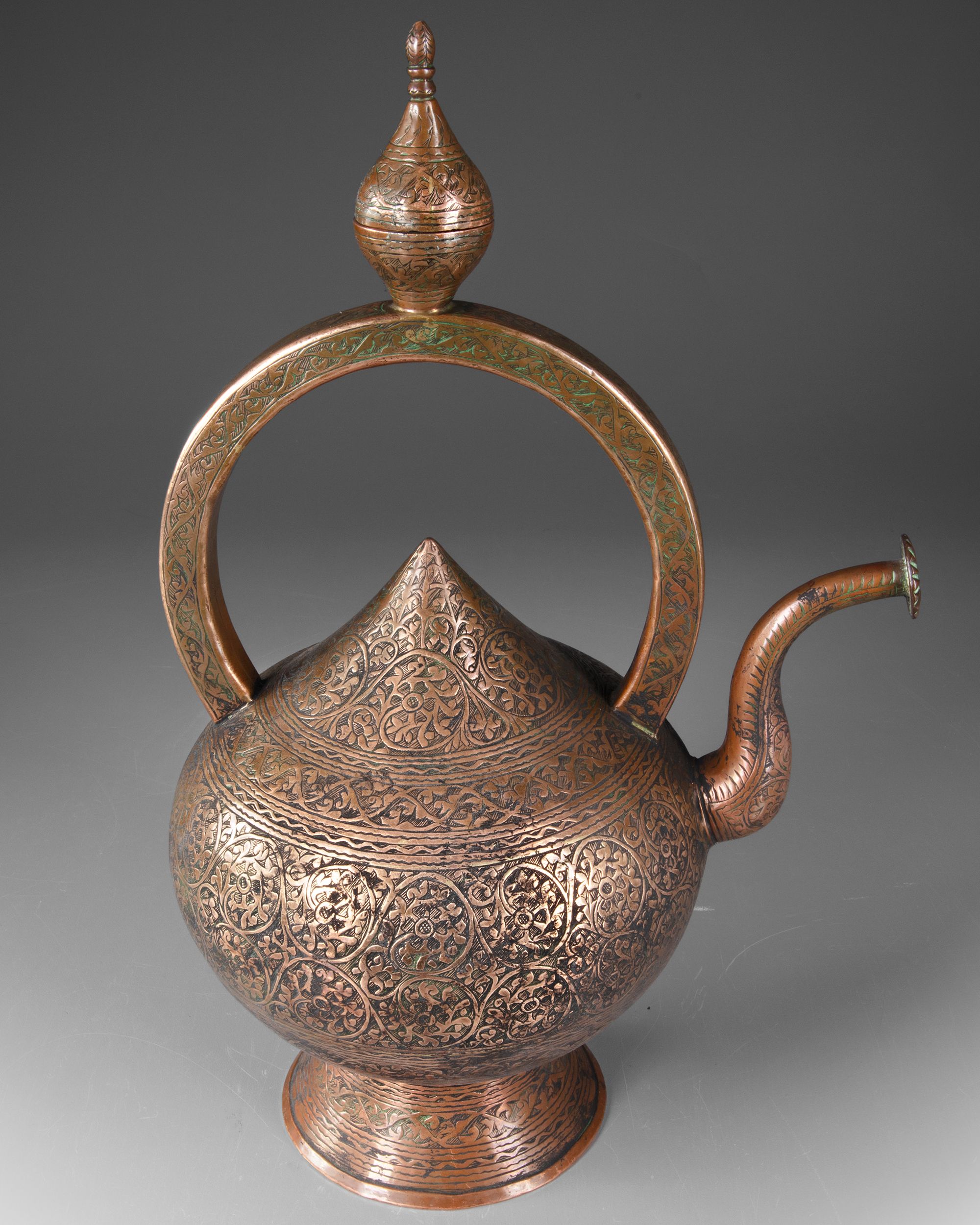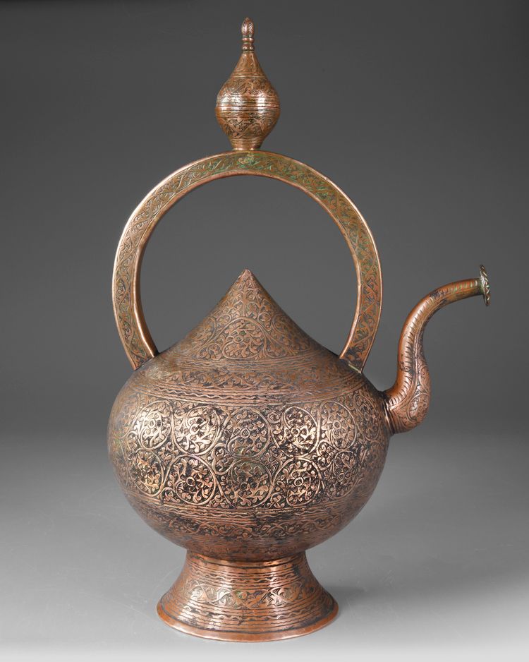 It is generally believed that "kettle" ewers with their centrally placed curved handles and onion dome bodies evolved first in Persia. The form is then said to have spread to India in the 16th Century. With the number of Indian examples which have been located, it has also been suggested that the form may have originated in India and then spread westwards to Persia in the 15th and 16th Centuries. For a discussion and illustrations of comparable Indian examples dating from the 16th and 17th Centuries, see M. Zebrowski, Gold, Silver & Bronze from Mughal India, London, 1997, pp. 152 - 155.