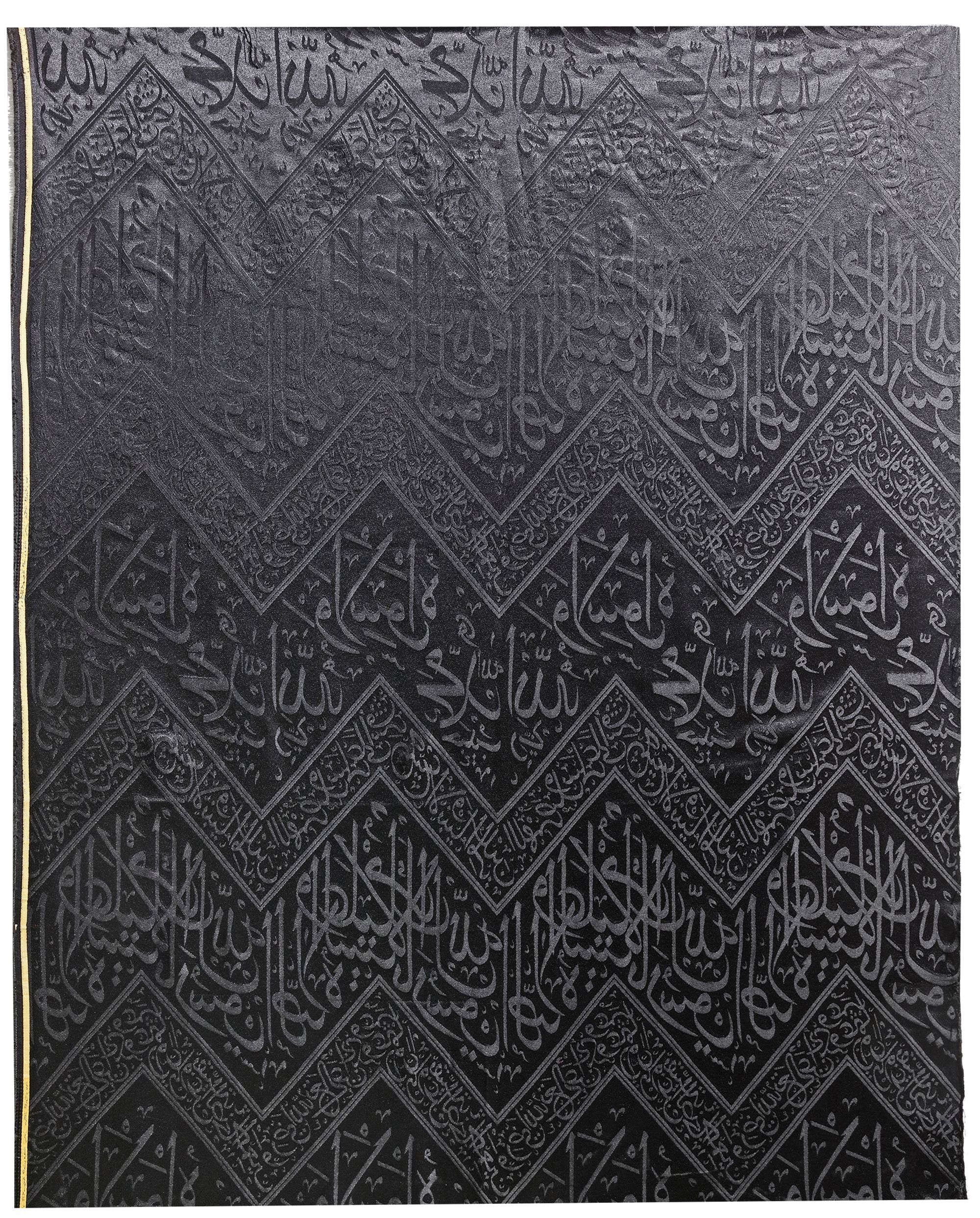 A fragment of the inner curtain of sacred kiswa for the inner wall of the Kabaa with an inscribed weave in silver-colored silk over a dark black ground. Embellished with a prominent inscription within a broad border in thuluth script of praise of the prophet ‘Prayer and peace be upon you, O Messenger of Allah’. Below with a narrow band containing prayers for the four righteous caliphs Abu Bakr, ‘Umar, ‘Uthman and ‘Ali as well as for the companions of the Prophet. At the top with a narrow band enclosing ‘O Allah, bless the Prophet Muhammad, the Seal of Prophets and Messengers.
