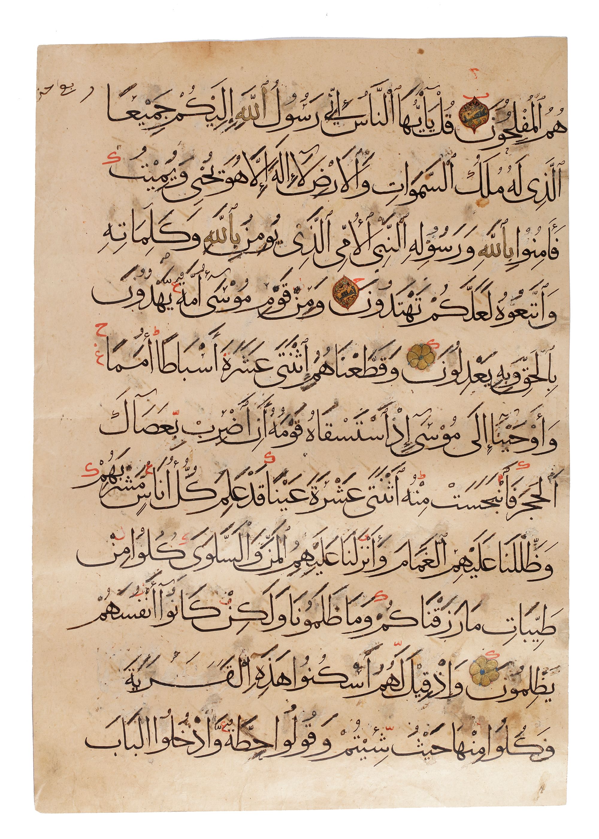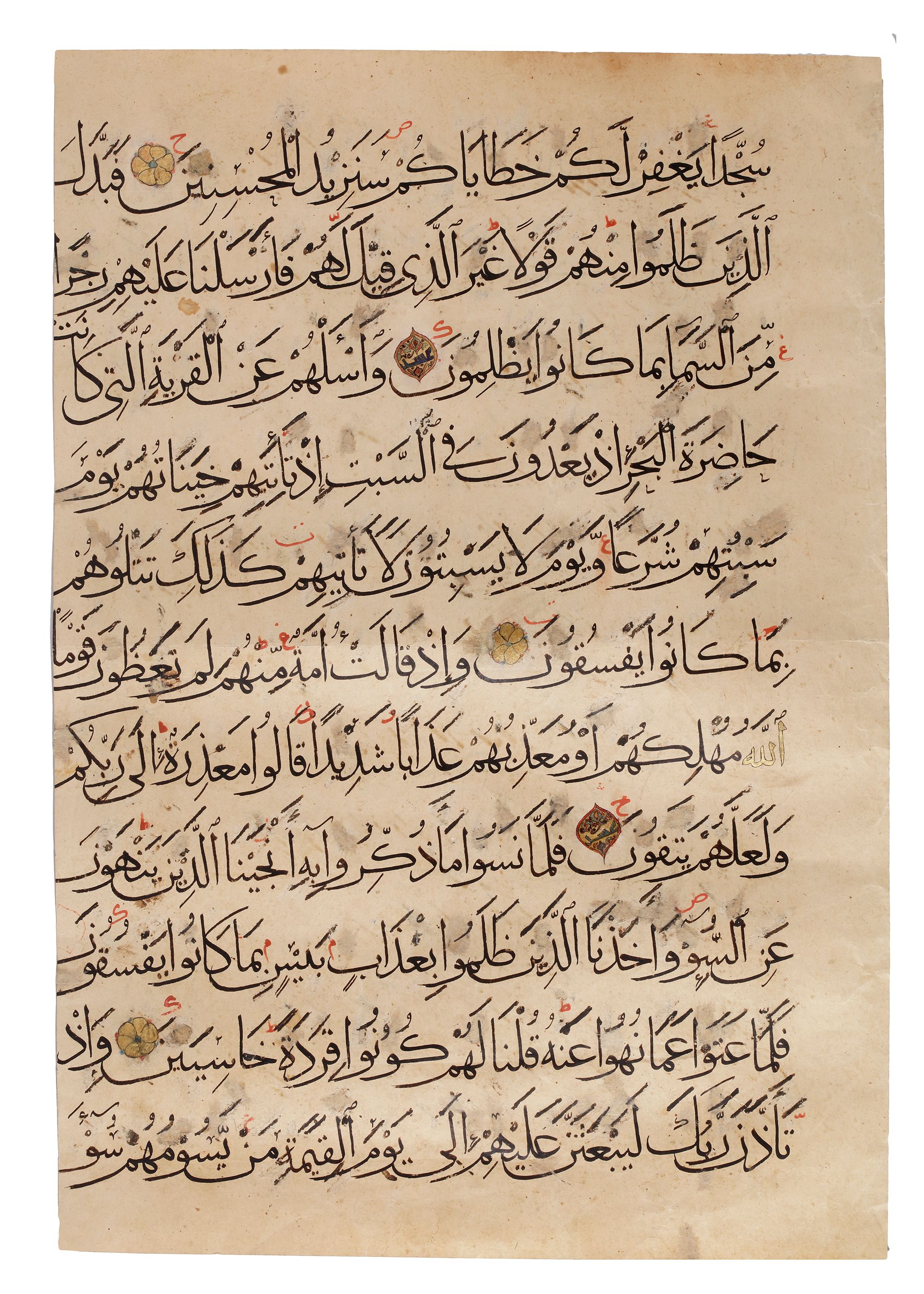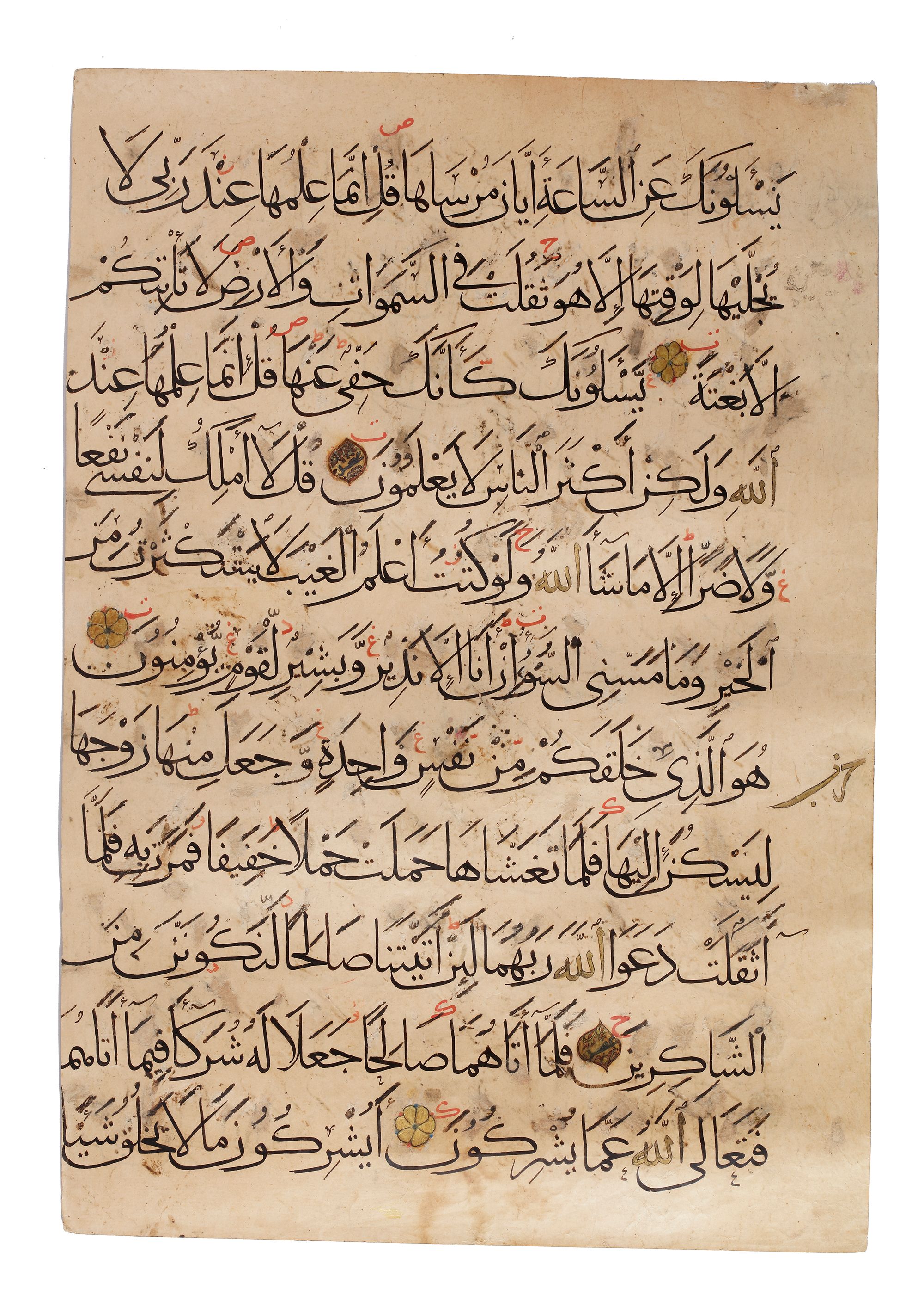 Arabic manuscript on paper, 2ff., each with 11 lines written in elegant black muhaqqaq script, gold and polychrome roundel verse markers, marginal gold 'Hizb' notes outlined in black, diactries or tajwid is in red ink, gold and polyhcrome ''ashur and khums'' markers.