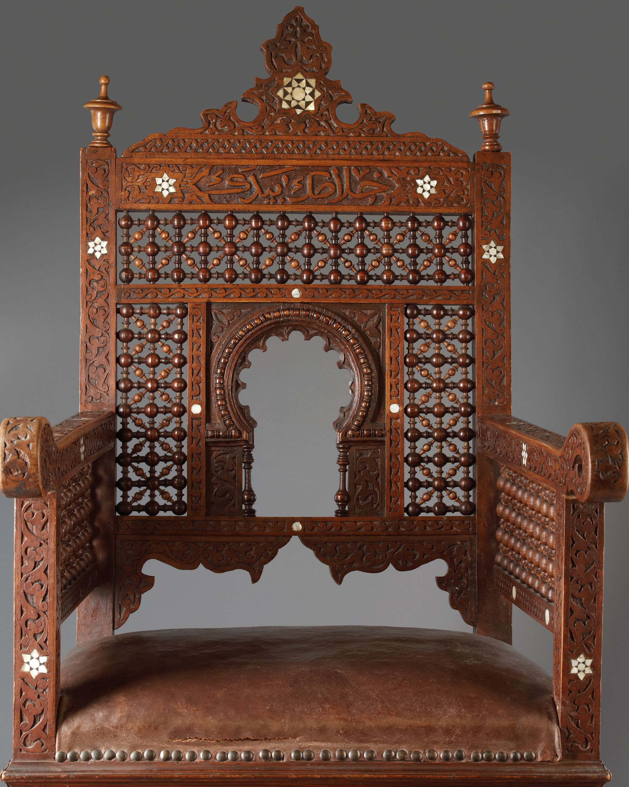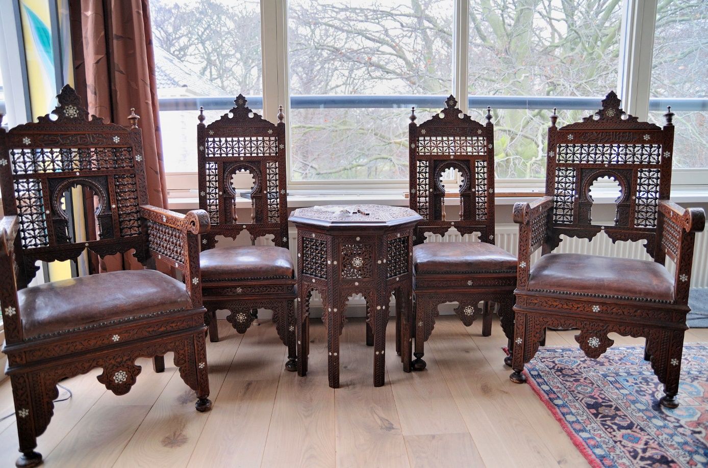 Four Damascus chairs and an octagonal table, pierced and inlaid with mother-of-pearl, decorated and engraved with Islamic Arabic calligraphy.