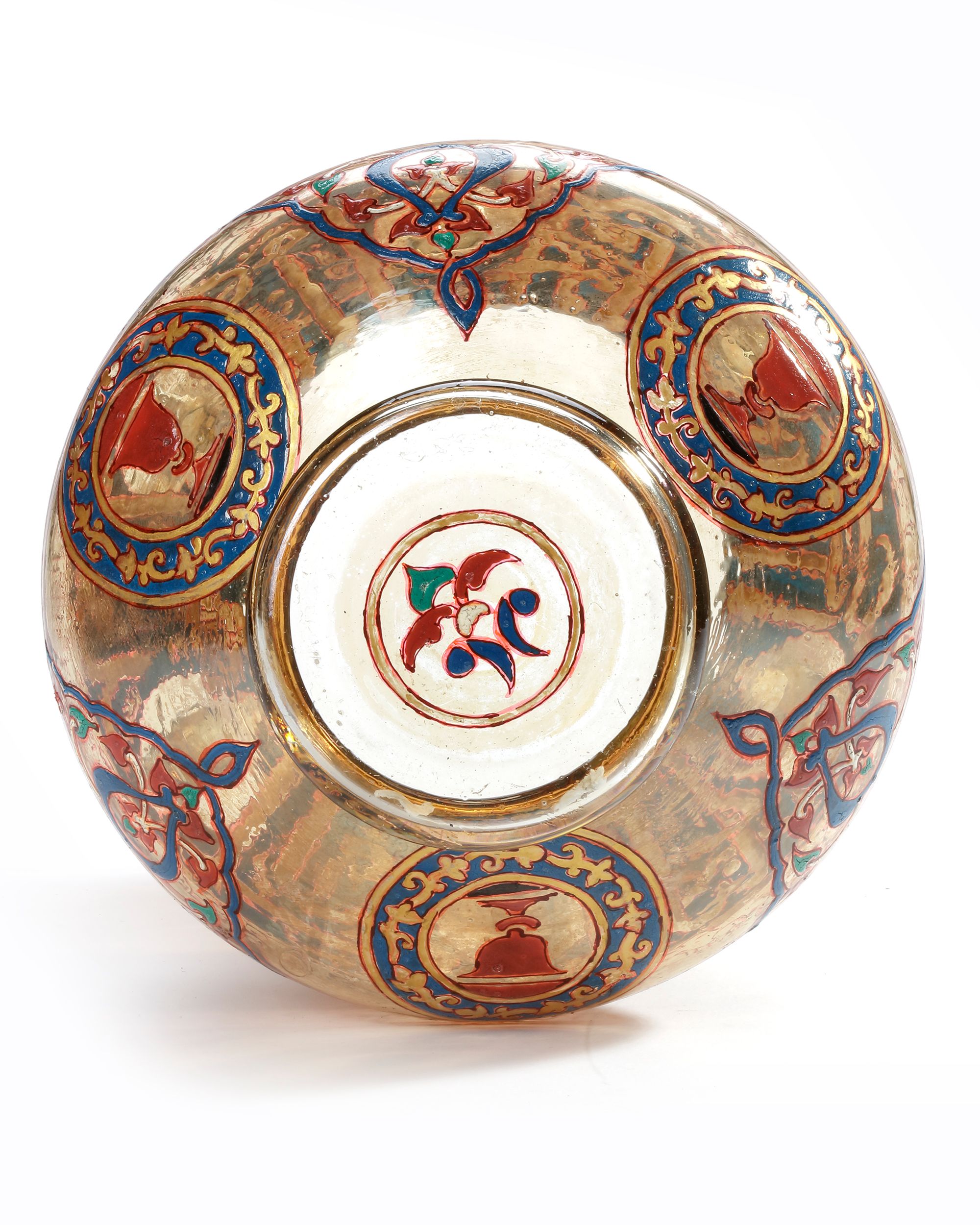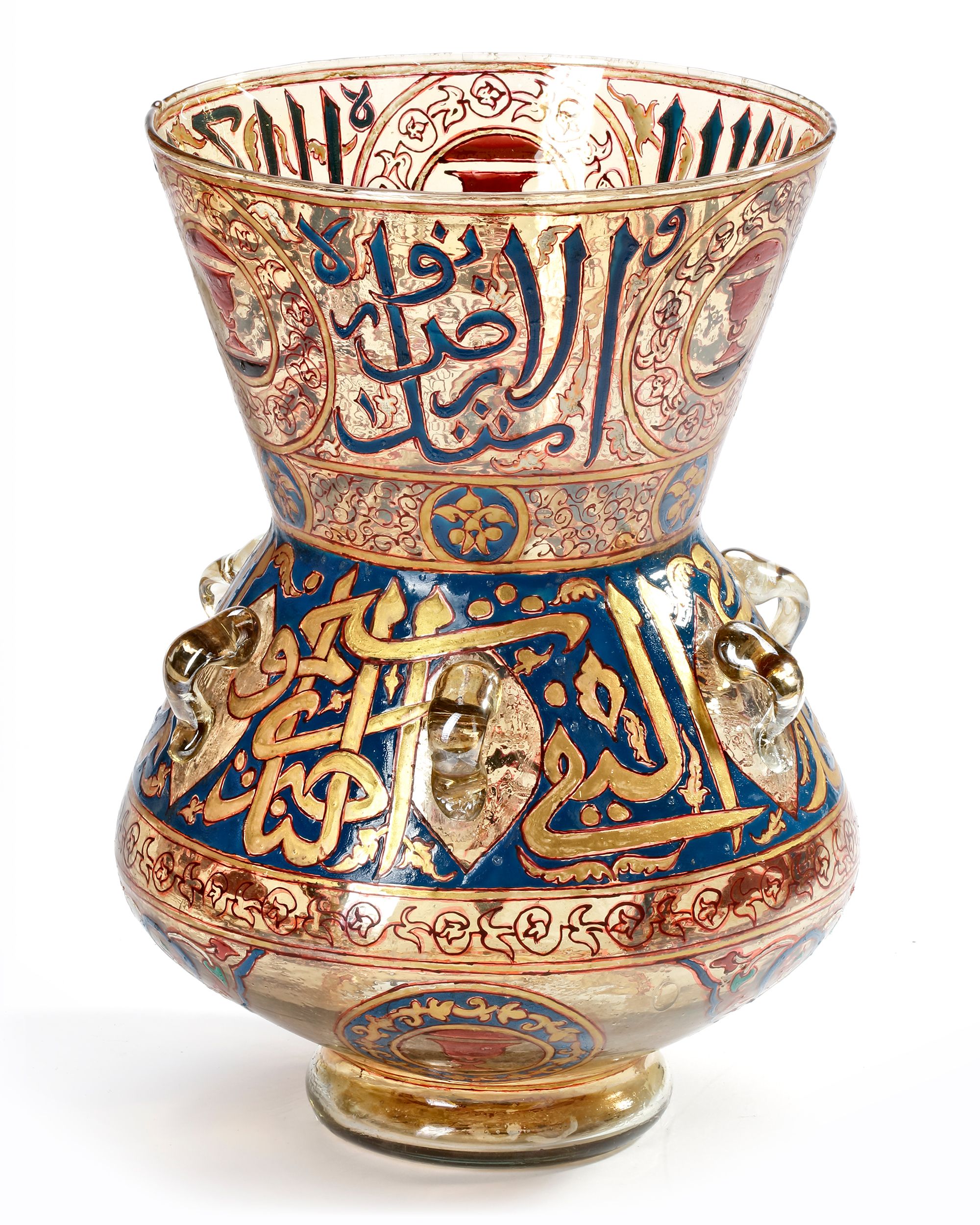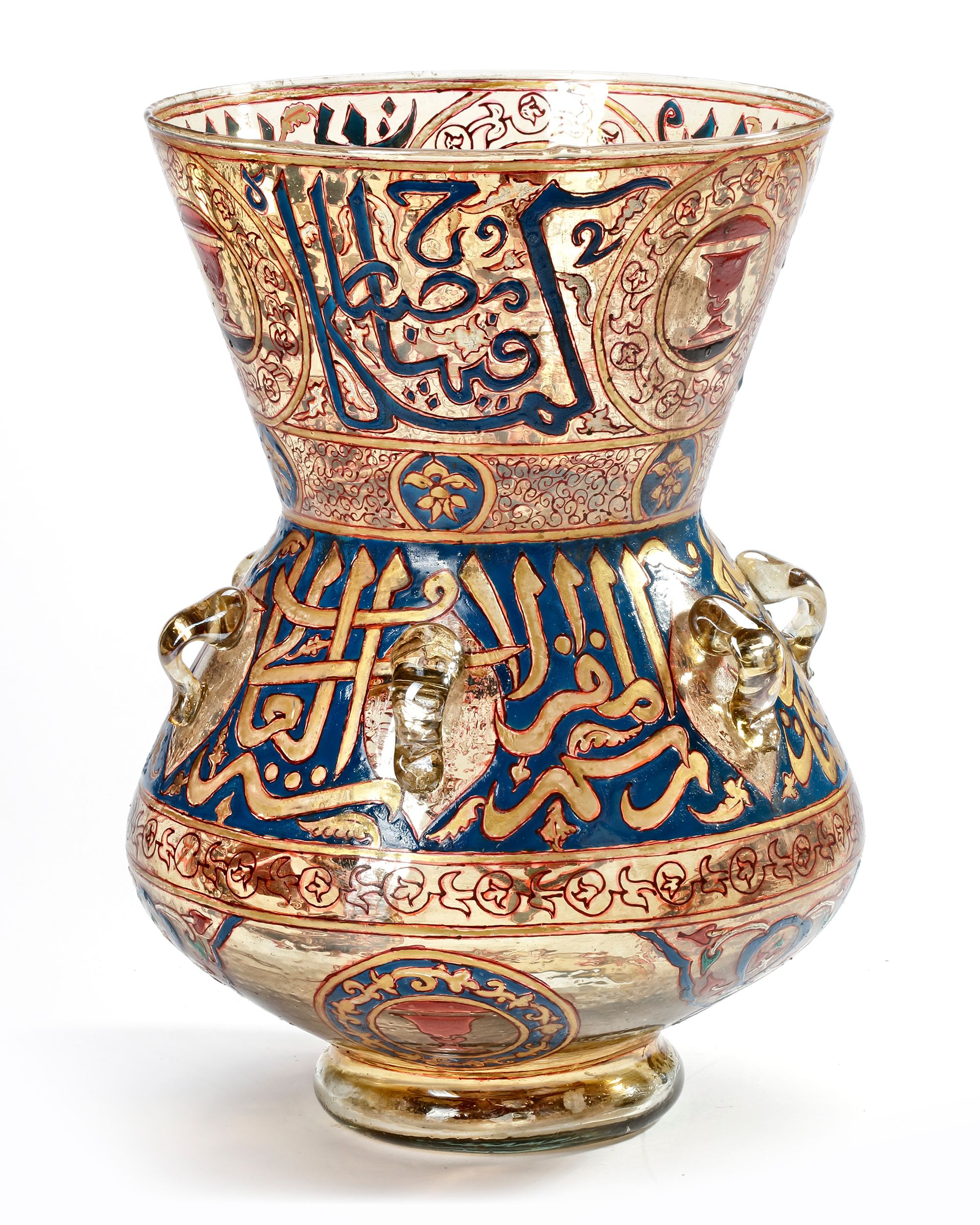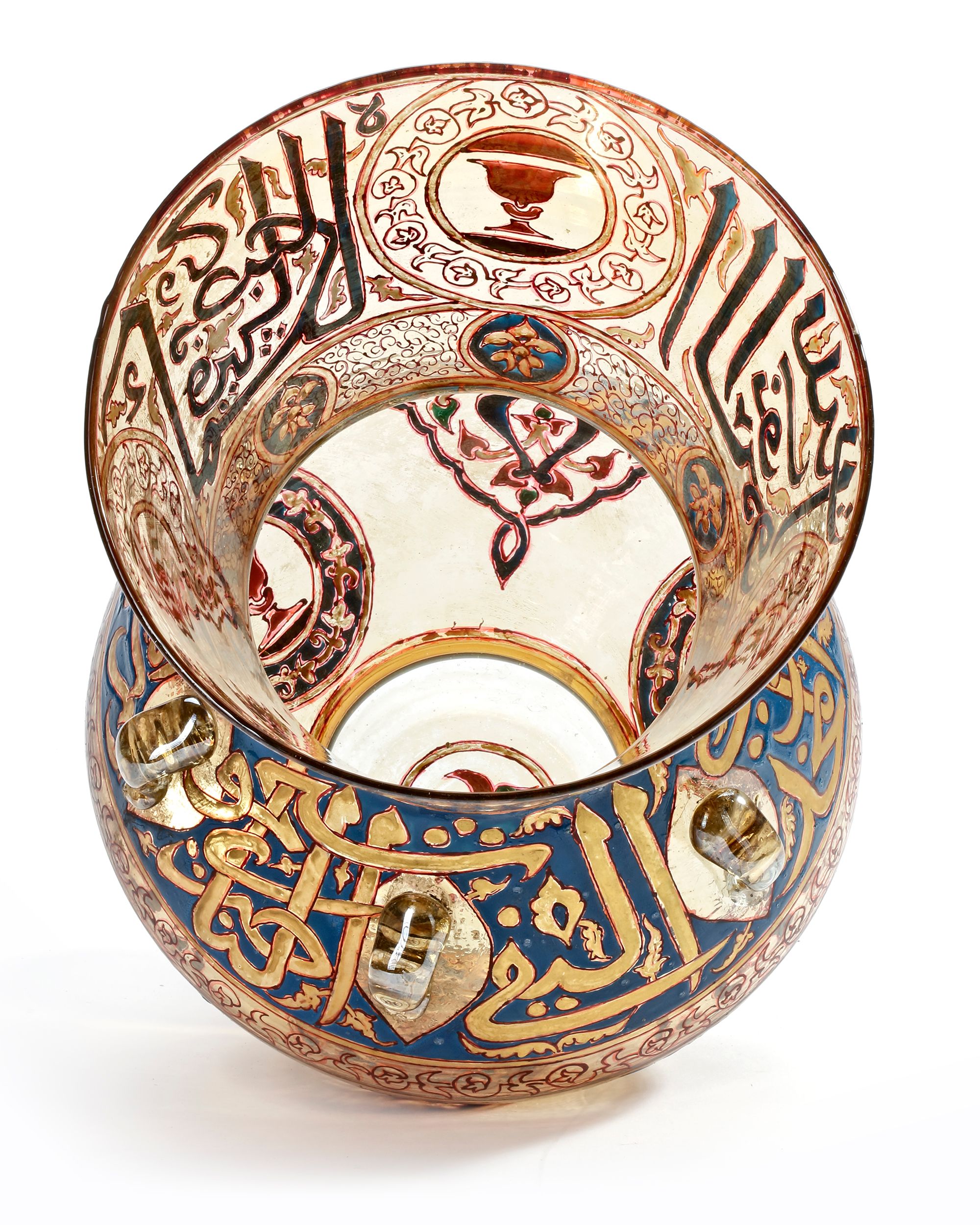 A large glass gilt and enameled mosque lamp, of typical form, set on a short foot with six loop handles around the shoulder. The rounded, angular body features a flaring conical mouth, decorated in polychrome and gold with inscriptions over a ground of vegetal interlace. The neck bears inscriptions interspersed with roundels filled with stem-cup and floral motifs. The lower body is adorned with floral designs and roundels filled with stem-cup and floral motifs.