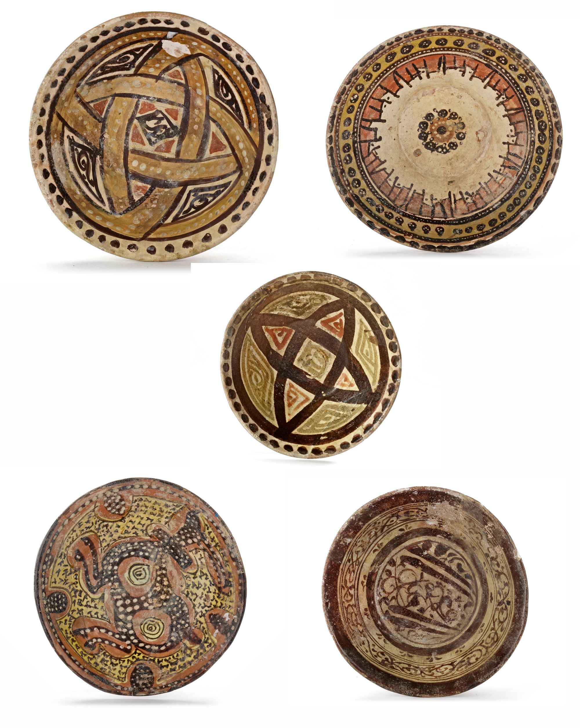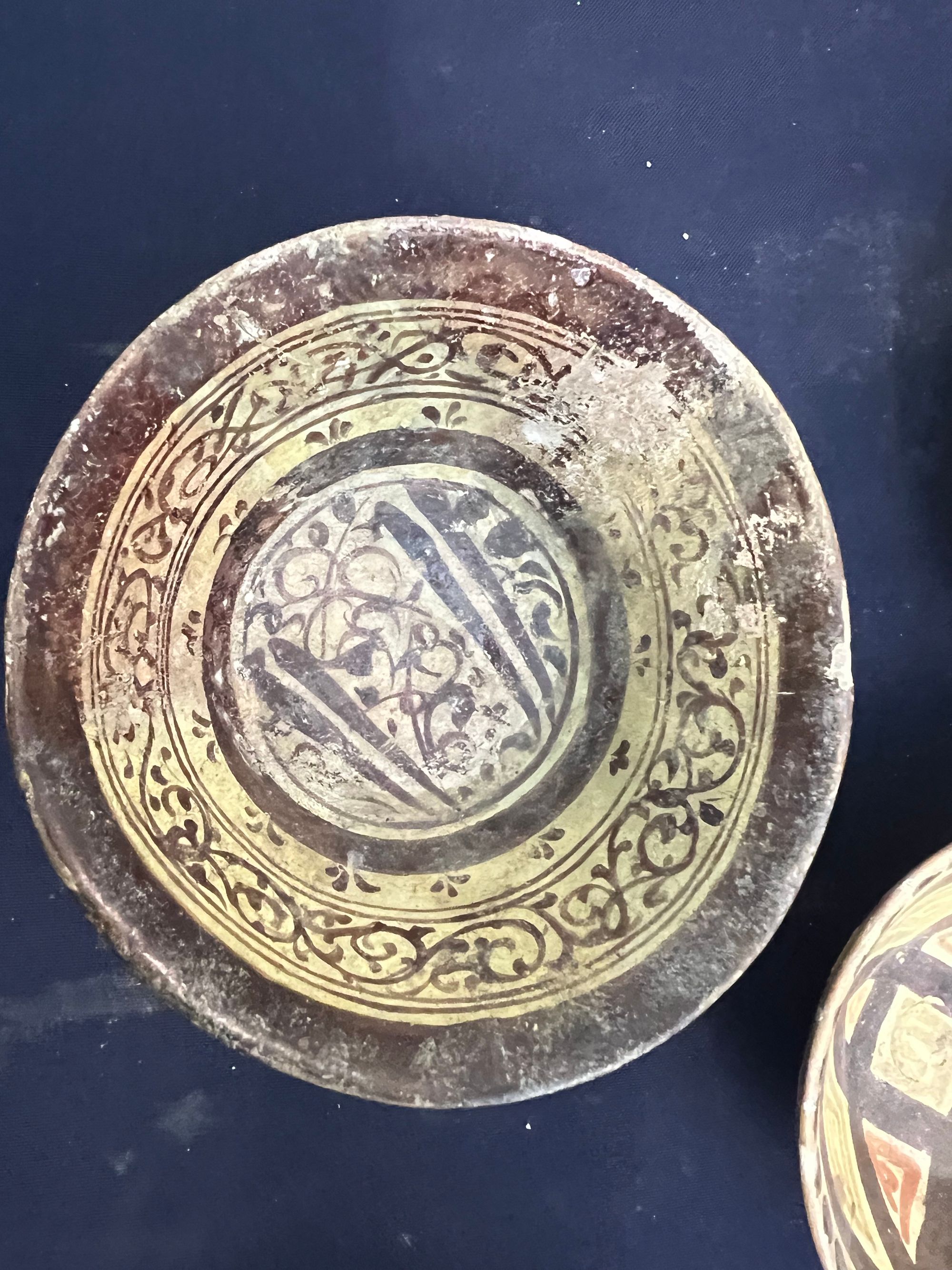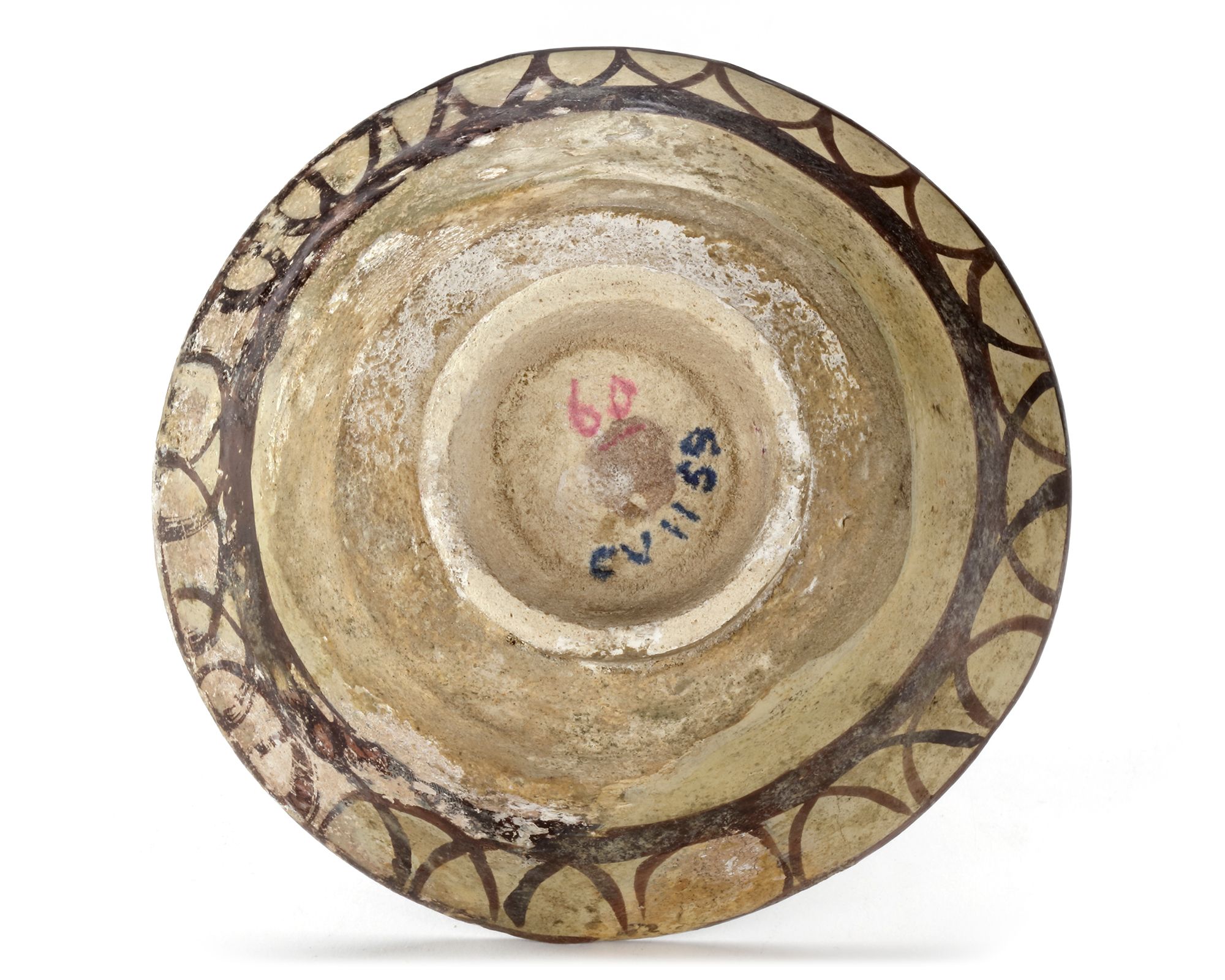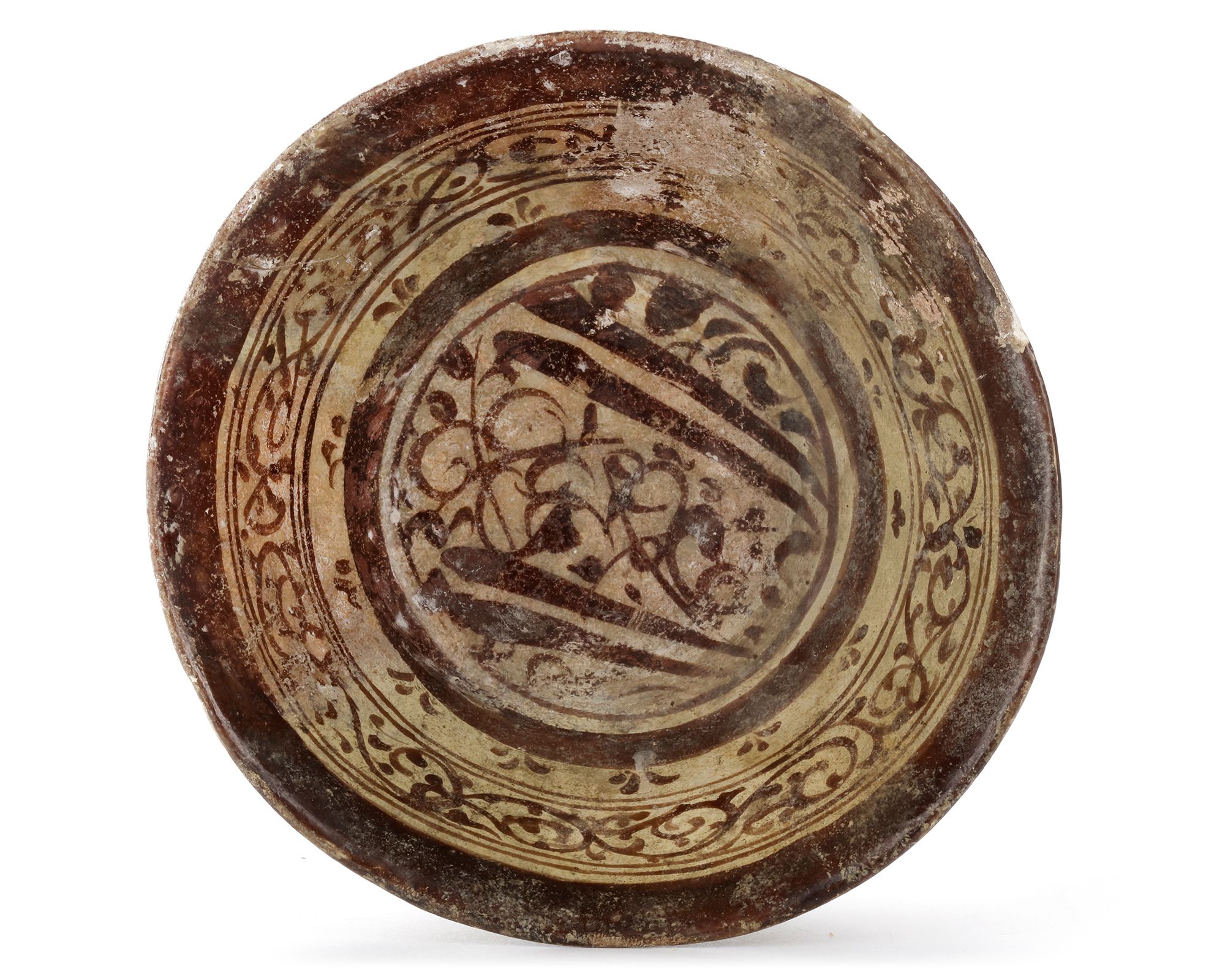 A Persian pottery bowl, resting on a small foot ring with a slightly flared rim, decorated to the centre and the sides with floral motifs and scrolls. 12.5 by 6 cm.