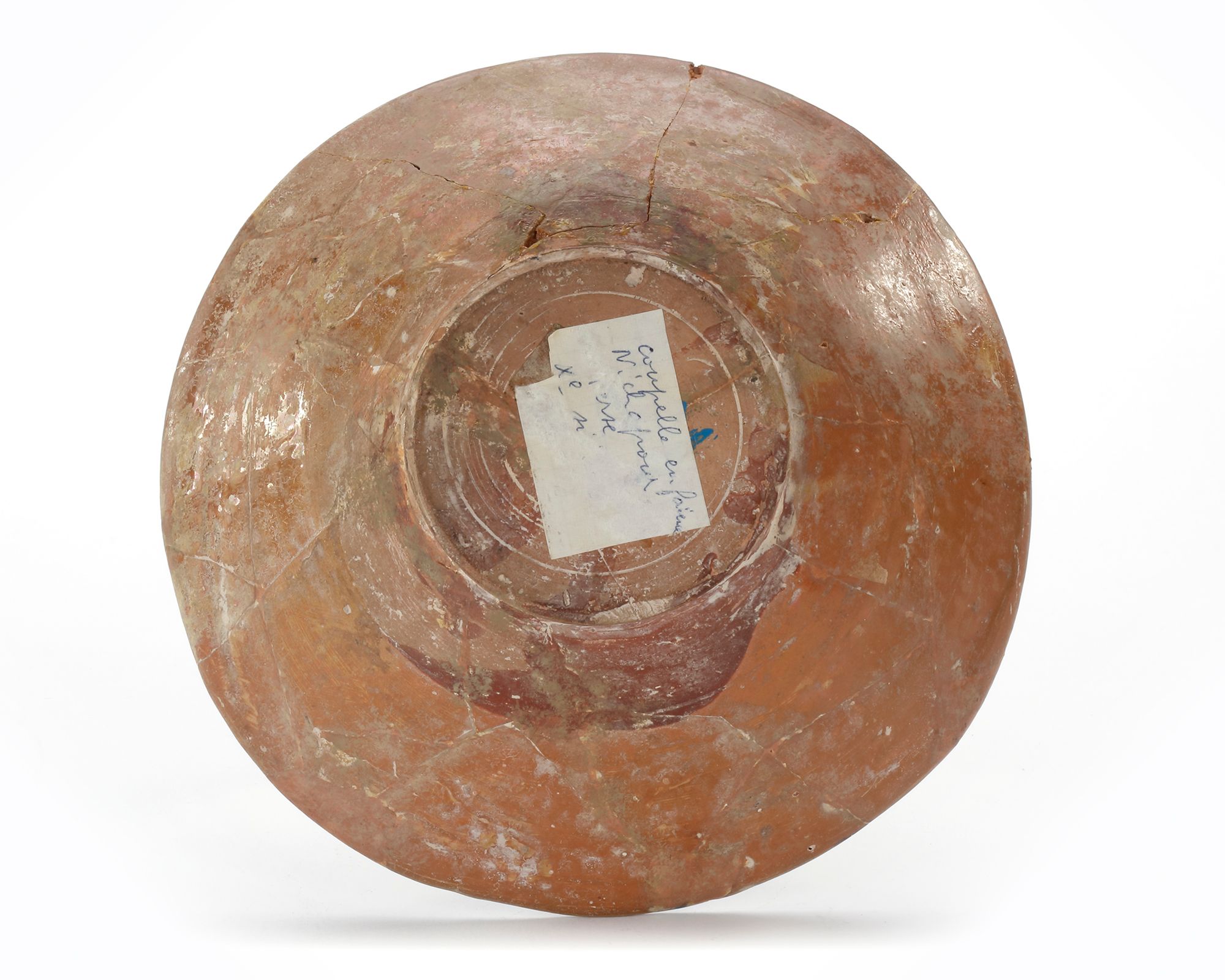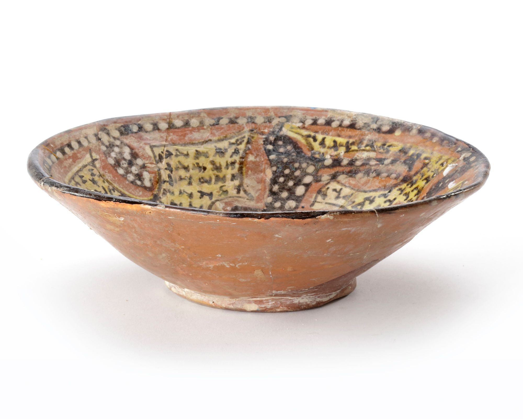 A Persian pottery bowl, resitng on a small foot with slightly flared sides, the reddish-slipped surface bears a painted decoration of a long-horned and hoofed quadruped ram or a composite creature. White dots made of a thick slip stand out against the dark-brown color of the animal and in the brown band along the rim.