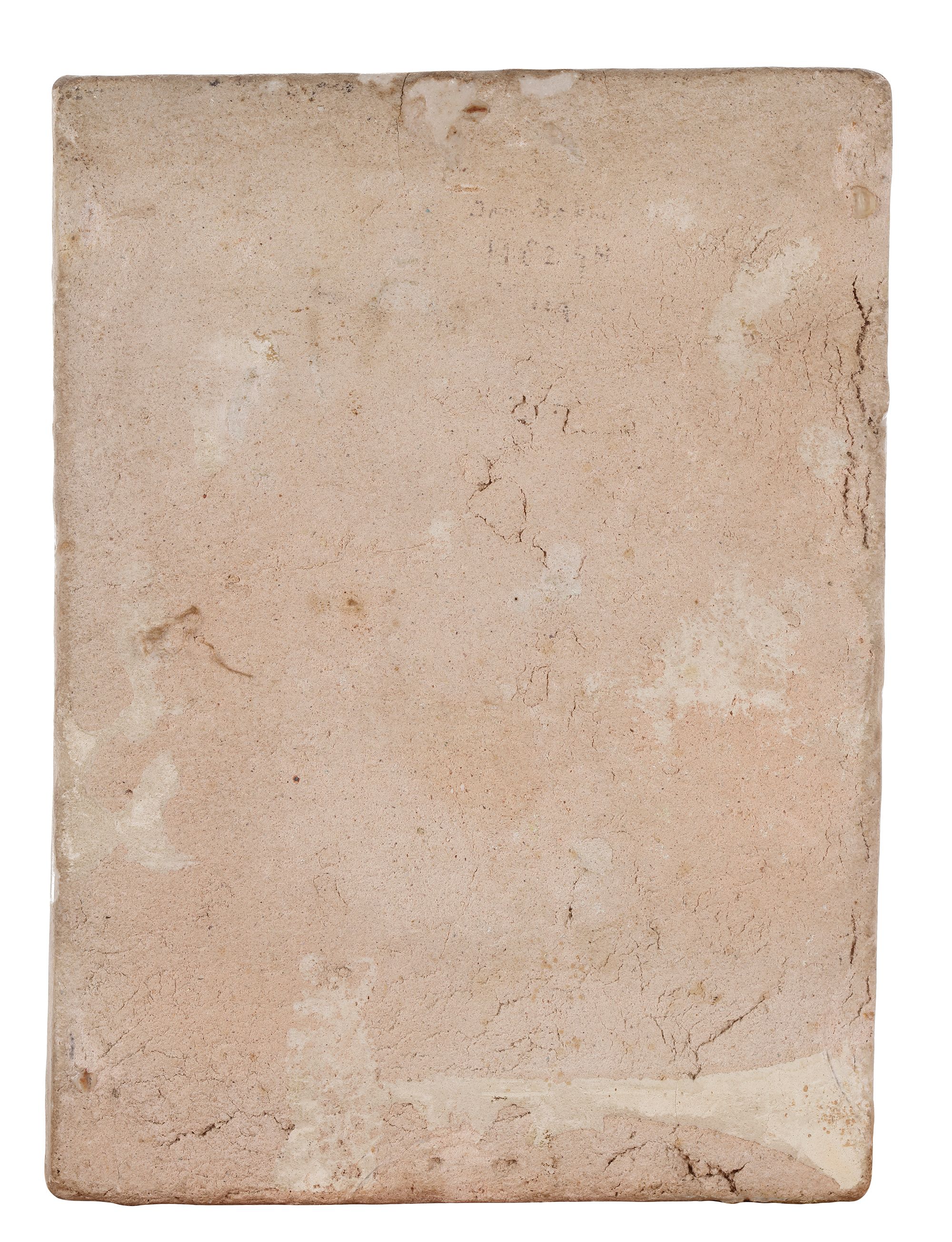 Tile with a horsemen and a falcon in relief, painted in underglaze blue, turquoise and green with a horseman with falcon in a landscape.