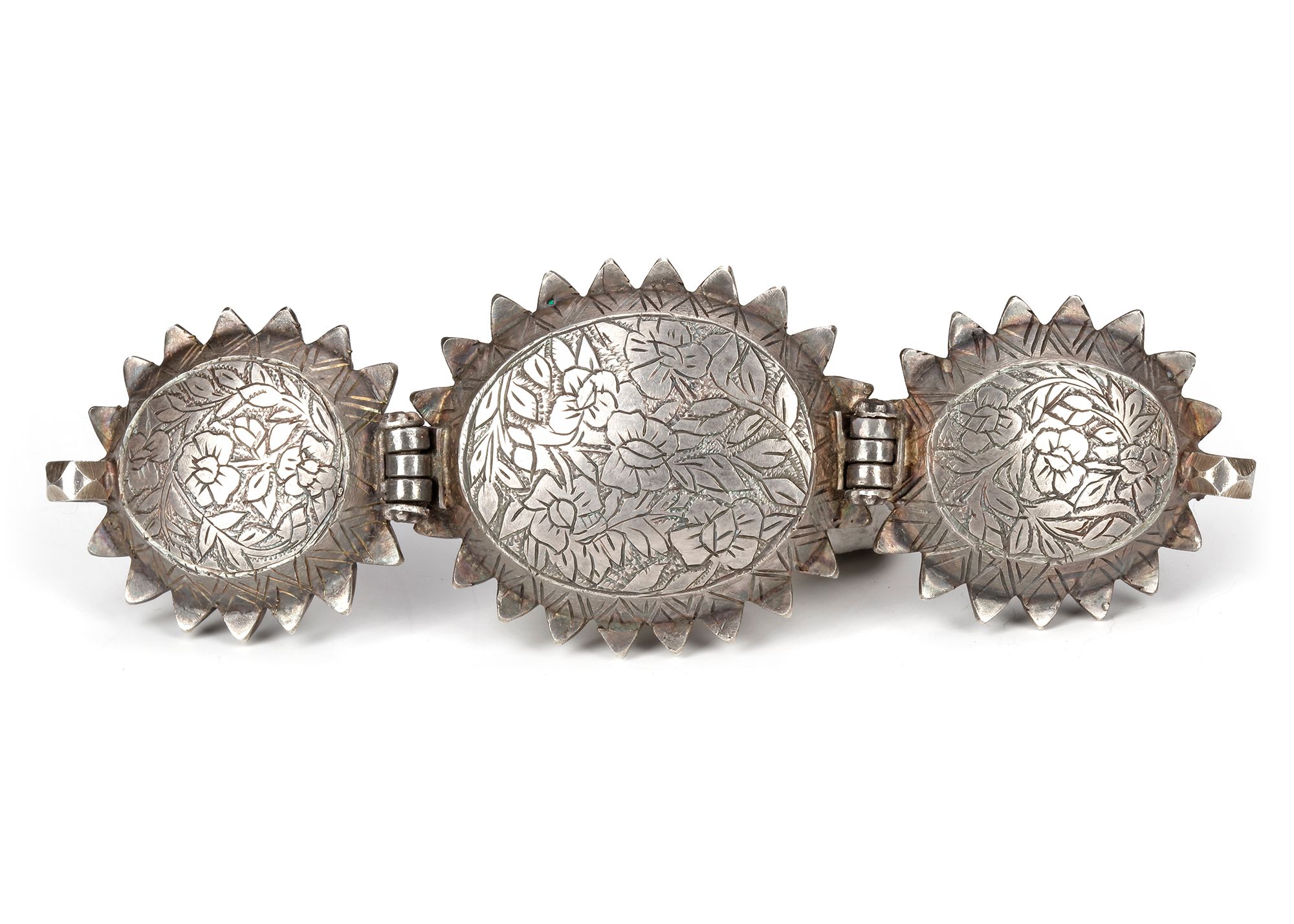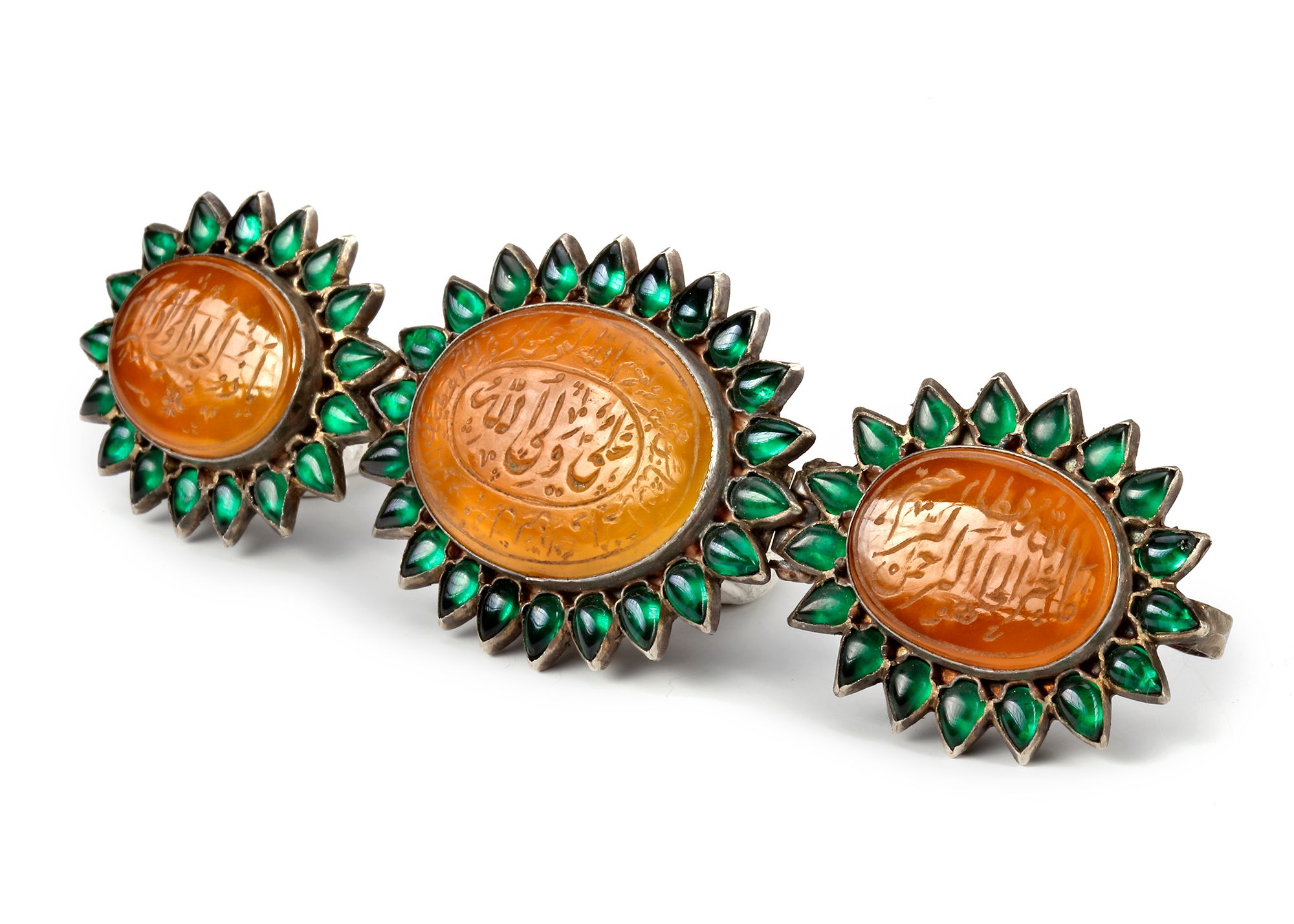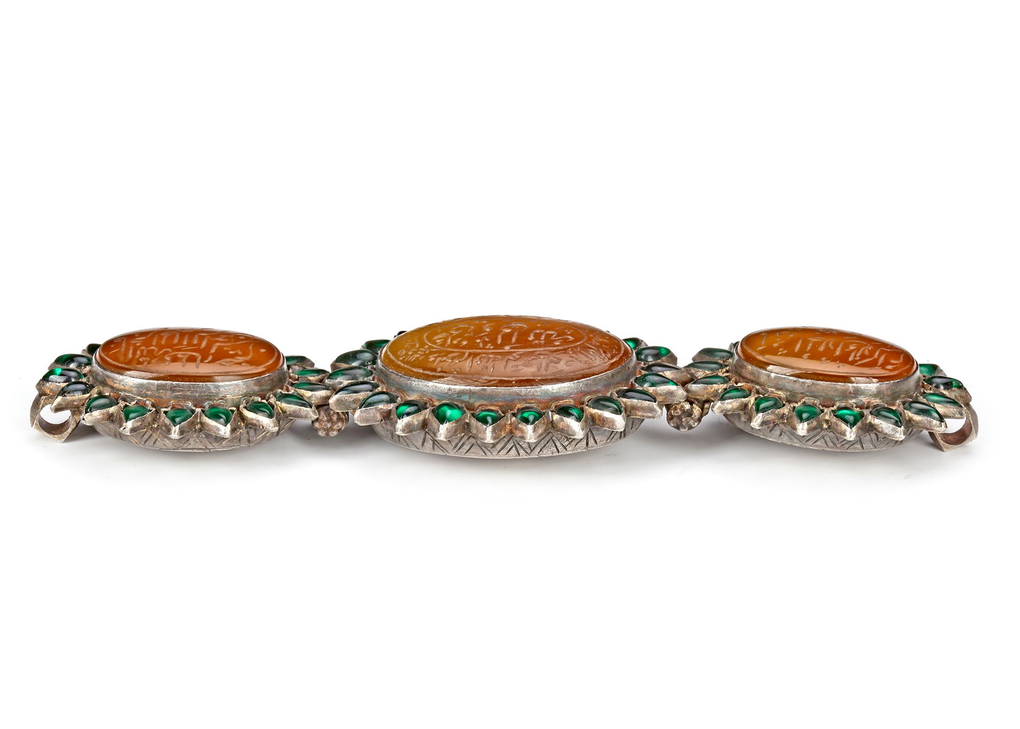 Comprising three rounded panels of agate stones, each engraved with lines of Naskh or Nasta'liq script, set in a hinged silver mount with cusped edges and backs, boldly engraved with flowers and further set with tiny emerald stones.