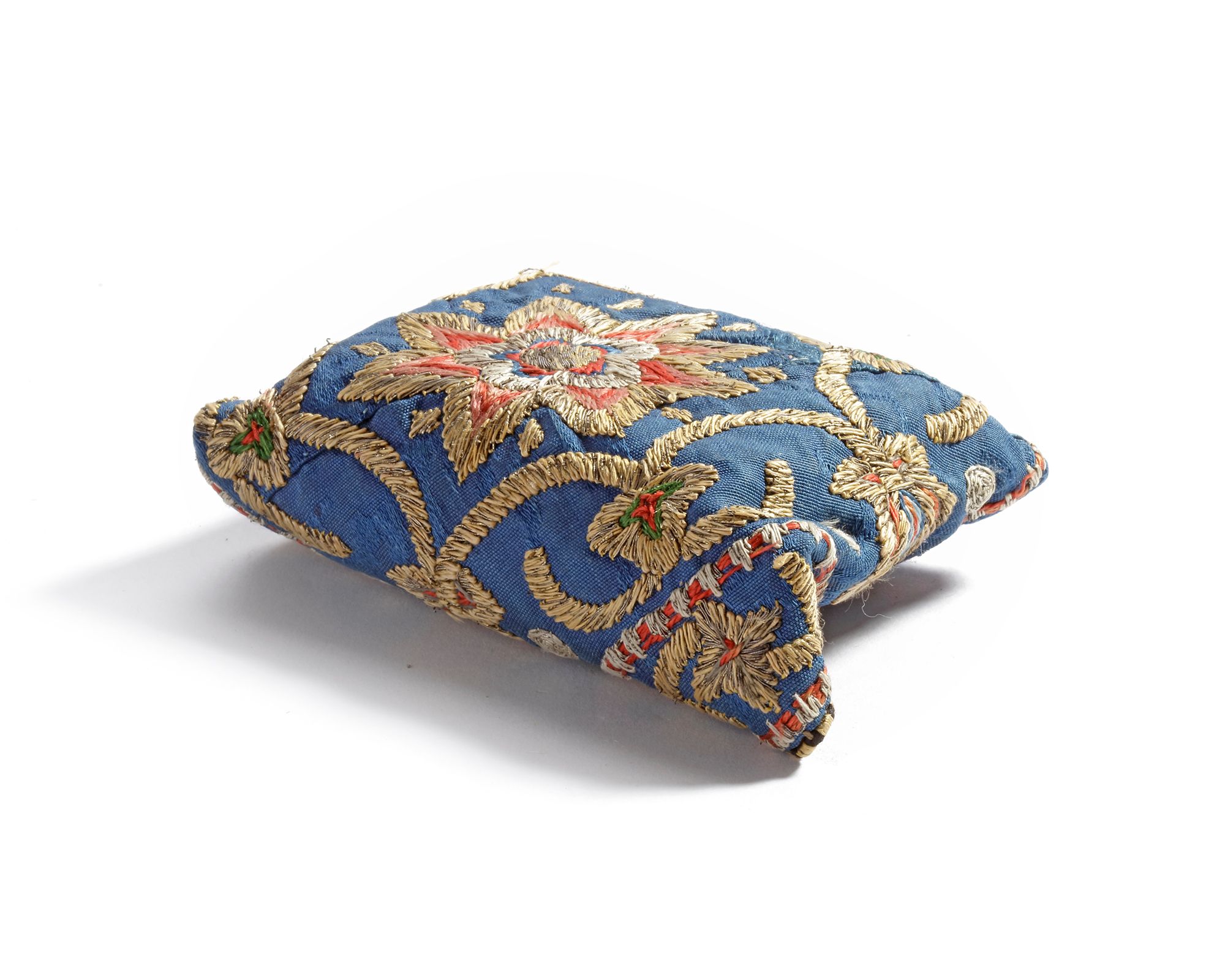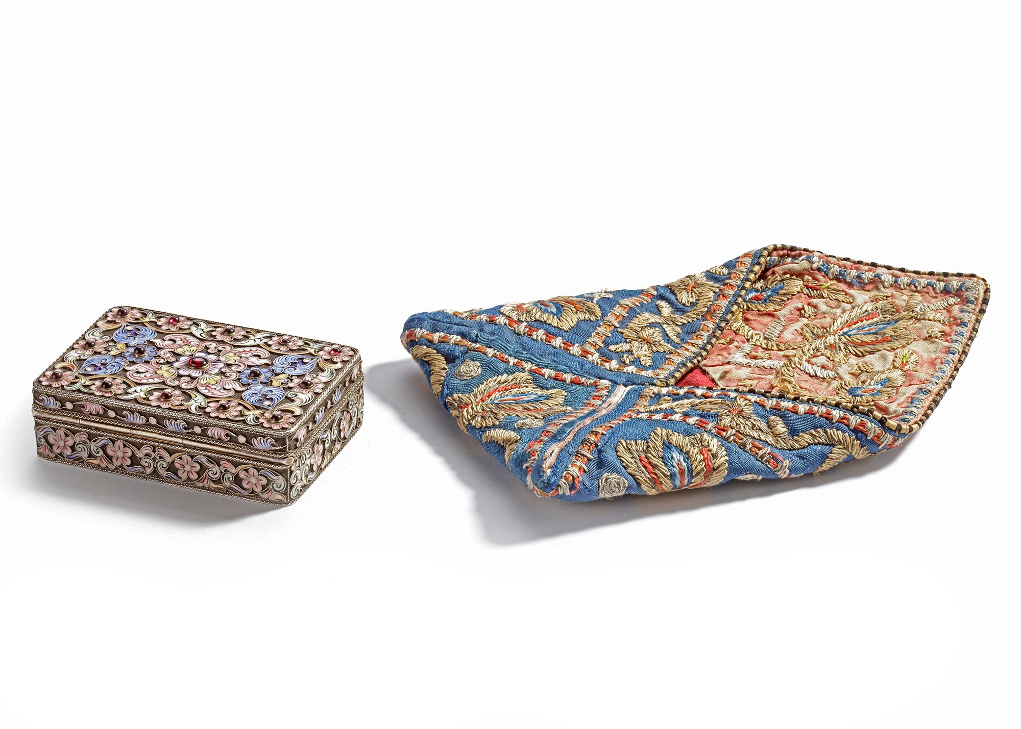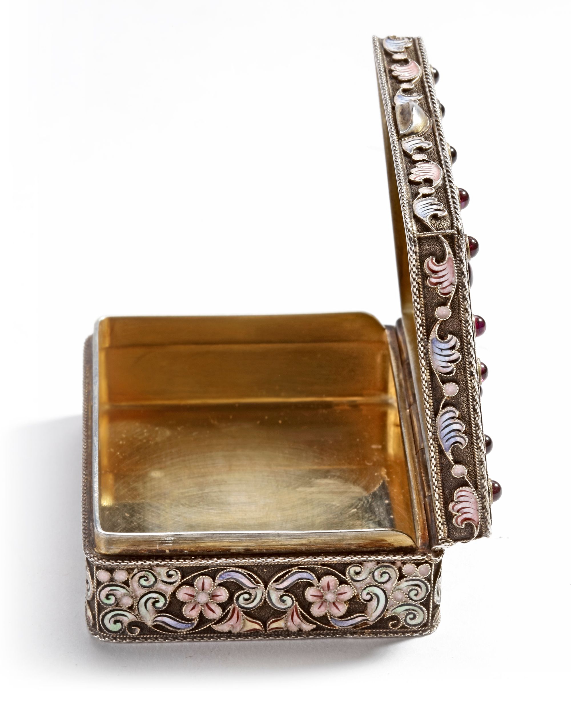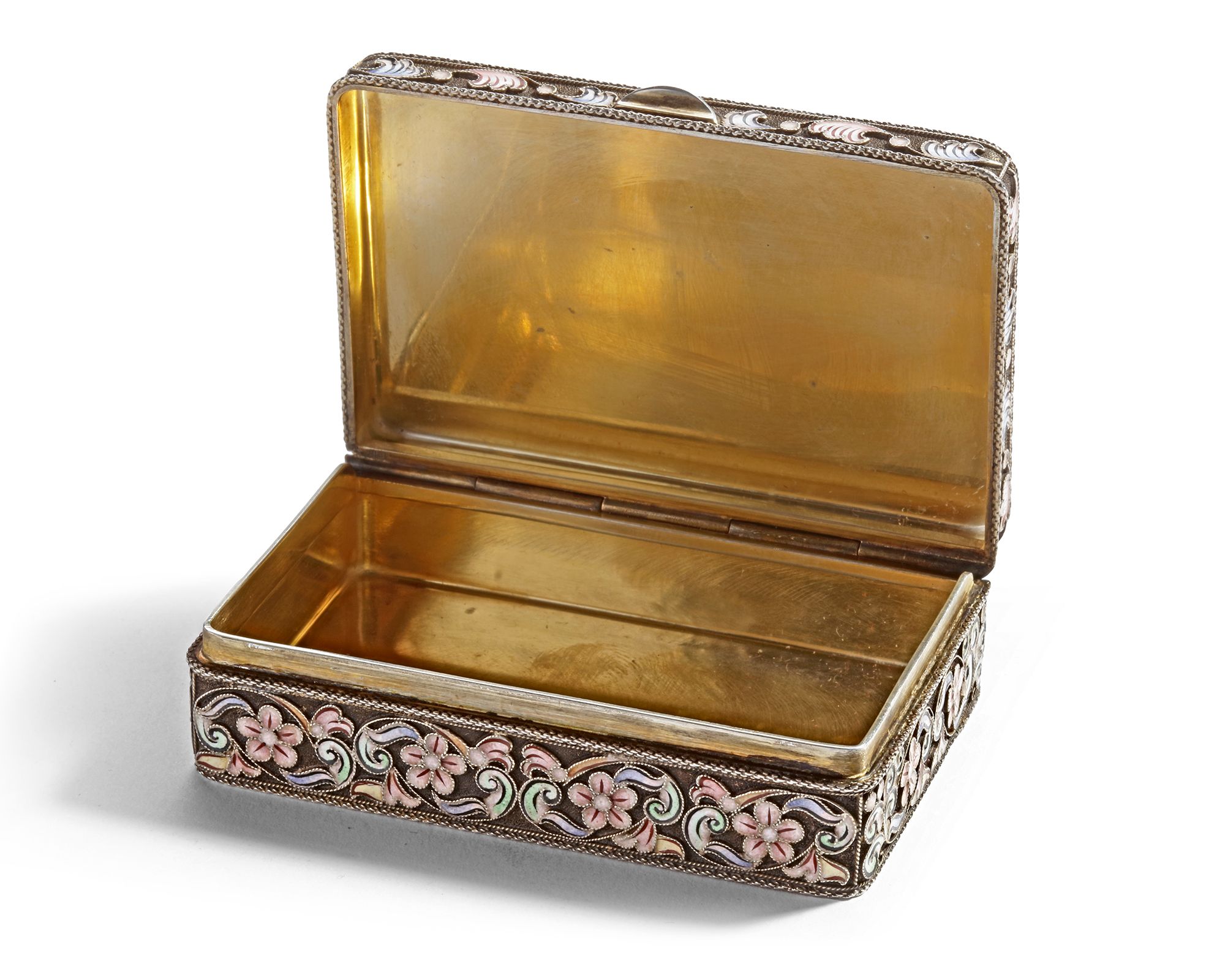 A gilded silver Fabergé box of rectangular shape with a hinged lid, enameled with foliate ornamentation; the lid and sides decorated with flowerheads nestled in arabesques; the base struck Faberge In Cyrillic Beneath Imperial Warrant and '88', in a silver-thread embroidered textile case.