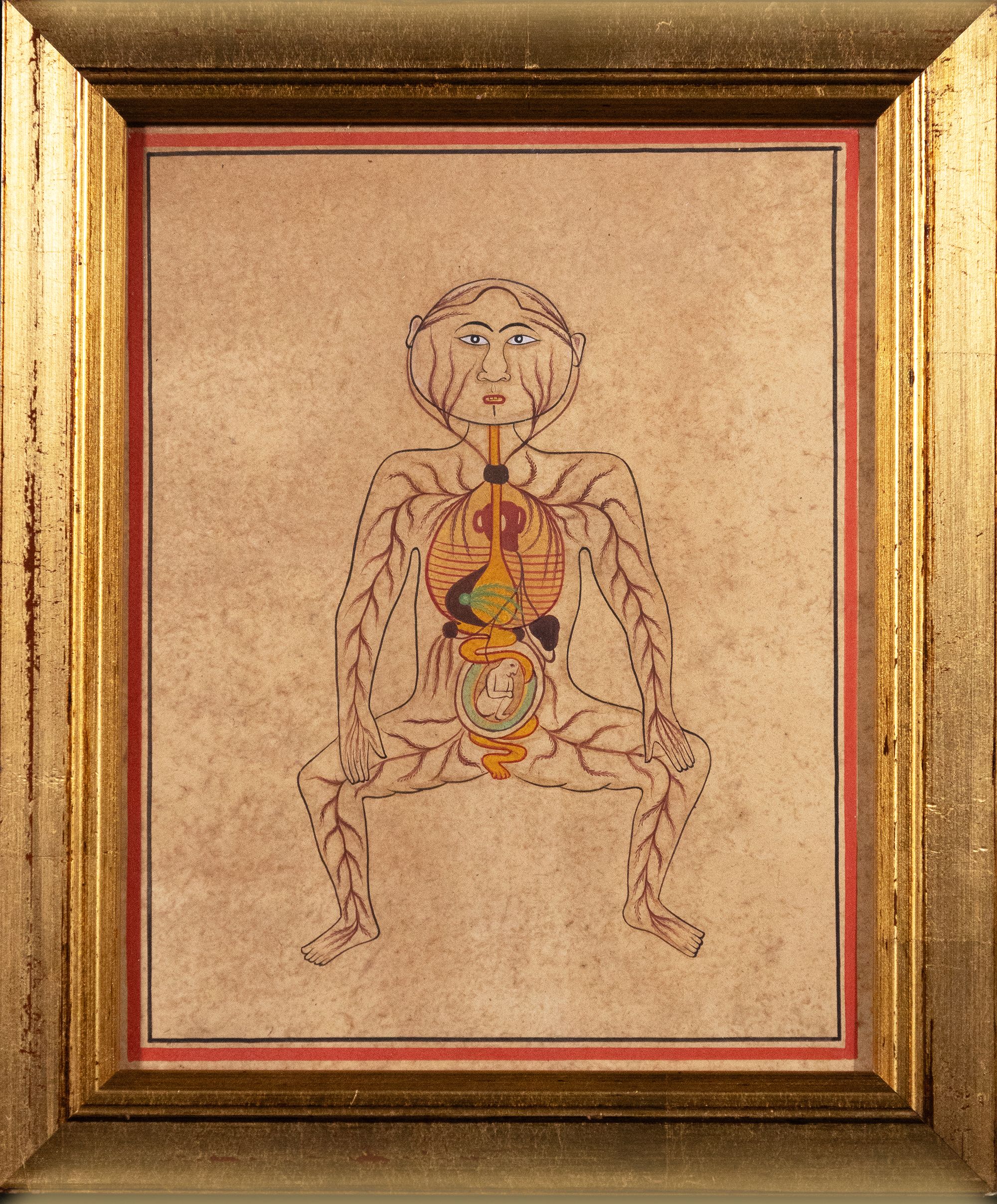A sacred and symbolic depiction of the human form, illustrating the flow of energy, inner organs, and spiritual connections within the body. Rooted in tantric tradition, this artwork reflects the balance of life force, the path of breath, and the cosmic cycle of creation, with a central focus on pregnancy and vitality.