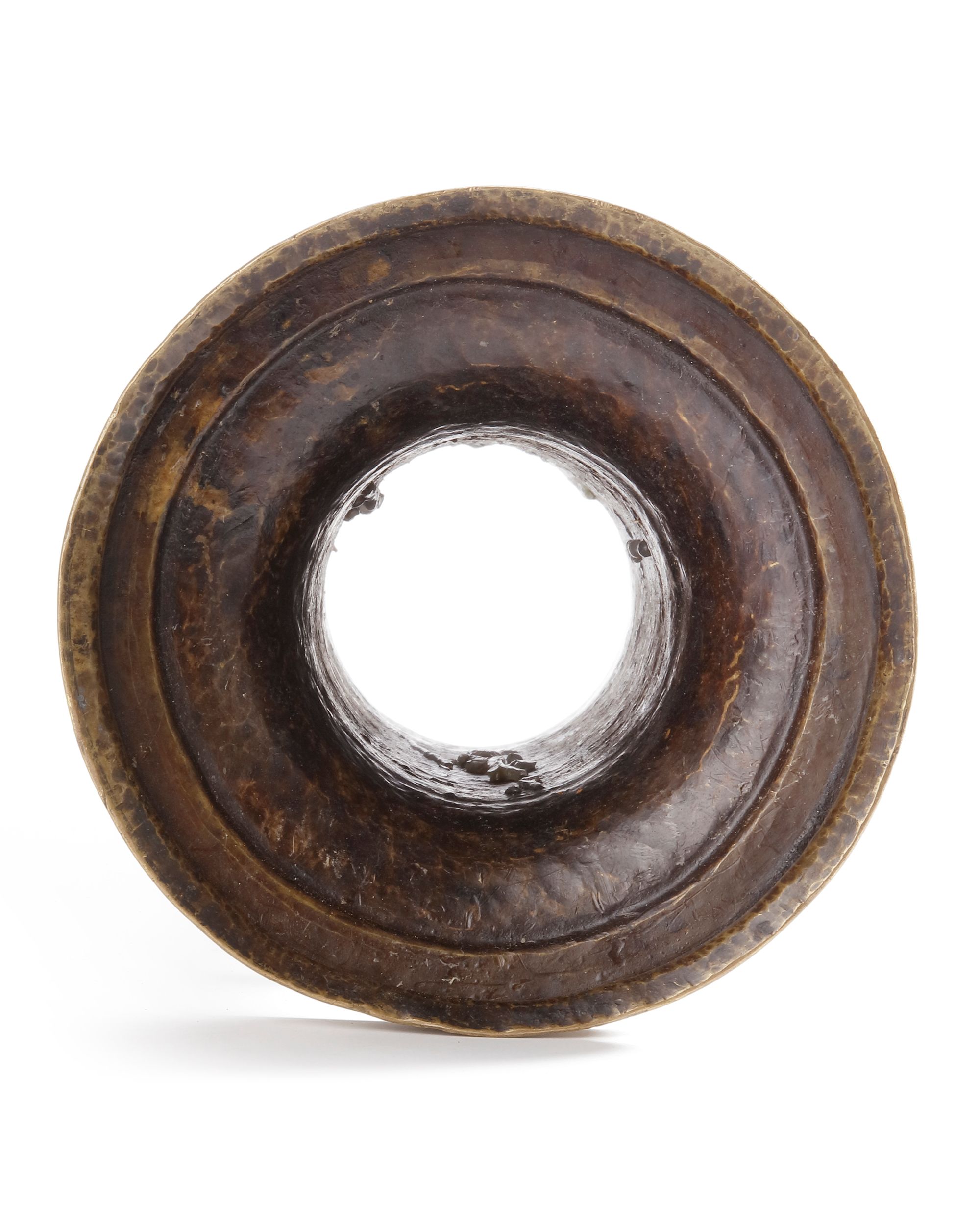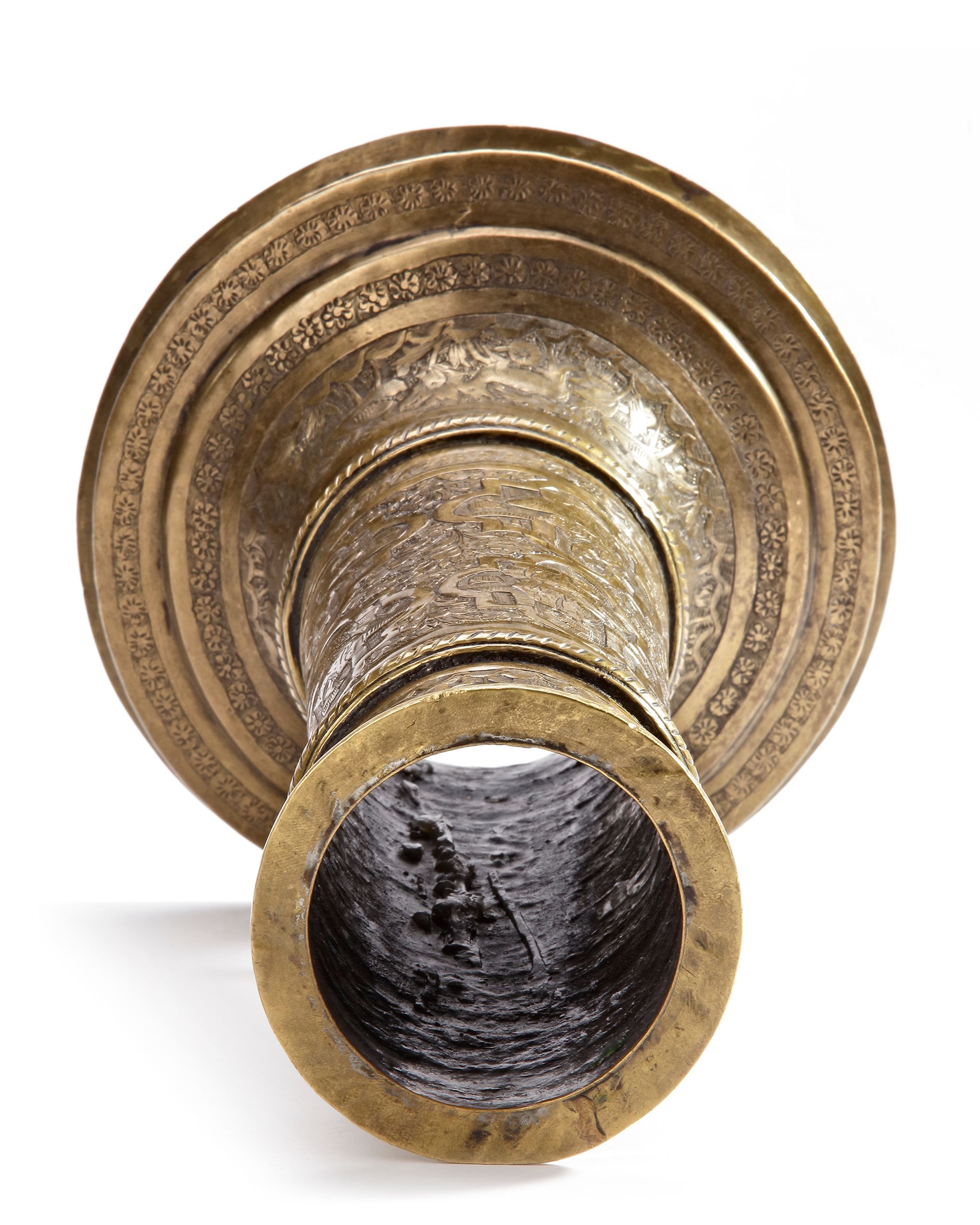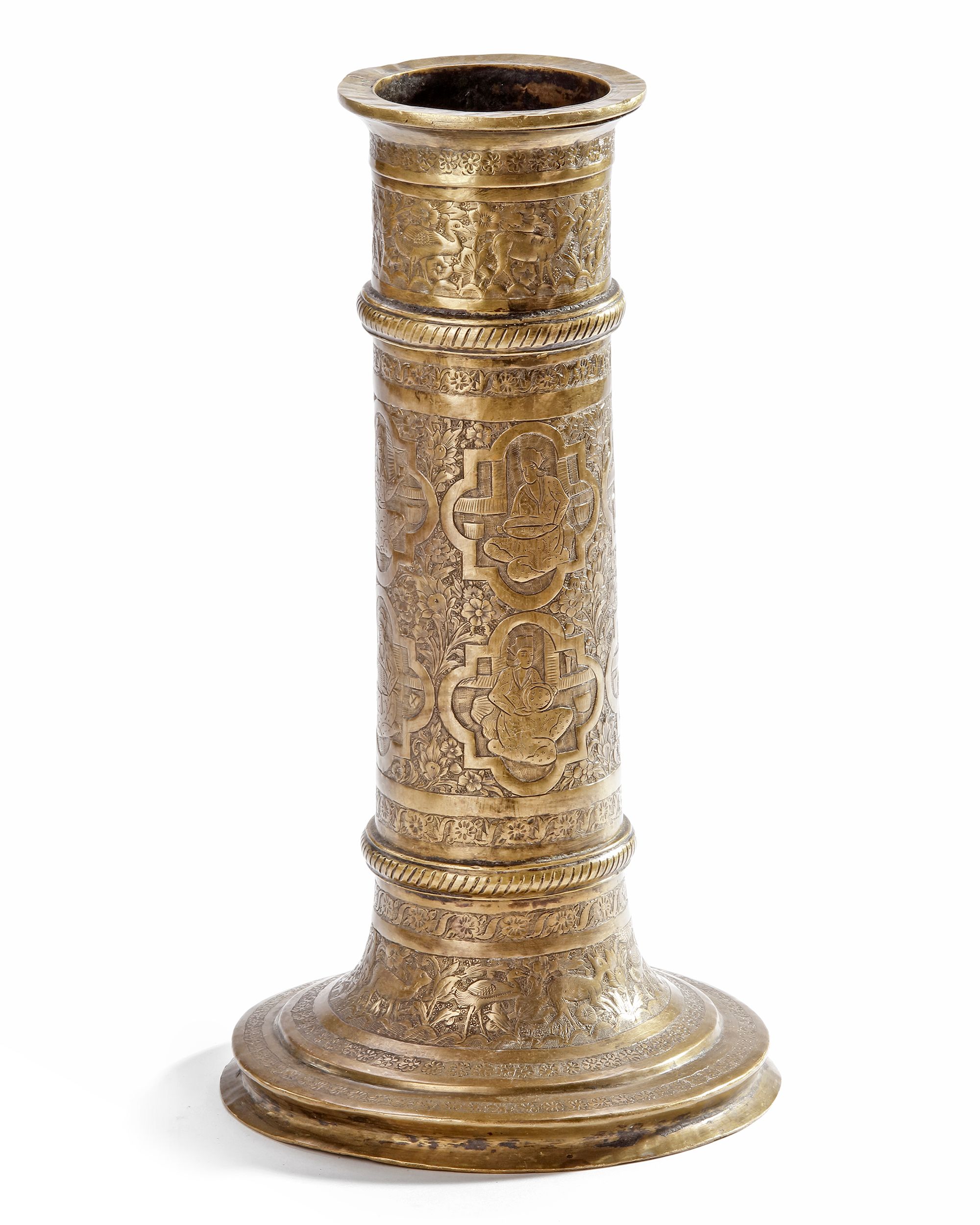 The cylindrical shaft on a flaring foot, with an everted rim, divided into three sections by raised ribs, is profusely engraved and decorated. The central section is engraved with two rows of cartouches enclosing figures playing music on instruments, set against a dense foliated ground. The upper and lower sections are stylized with engraved deer and cranes amidst blossoming branches, under a band of classic flower heads.
