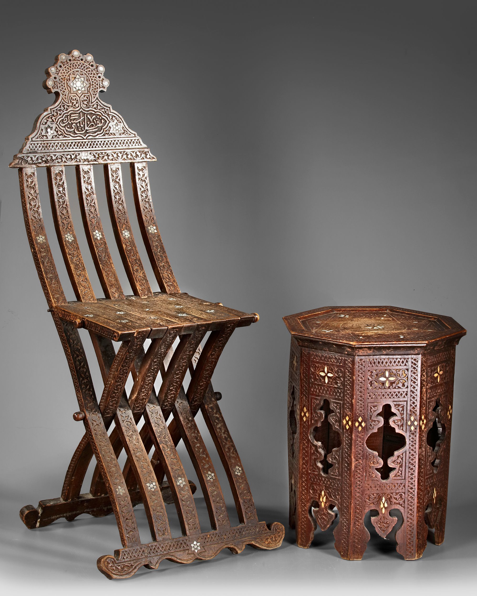 Carved in relief with palmettes and inlaid in mother of pearl with floral motifs. 103 by 45 by 35 cm.