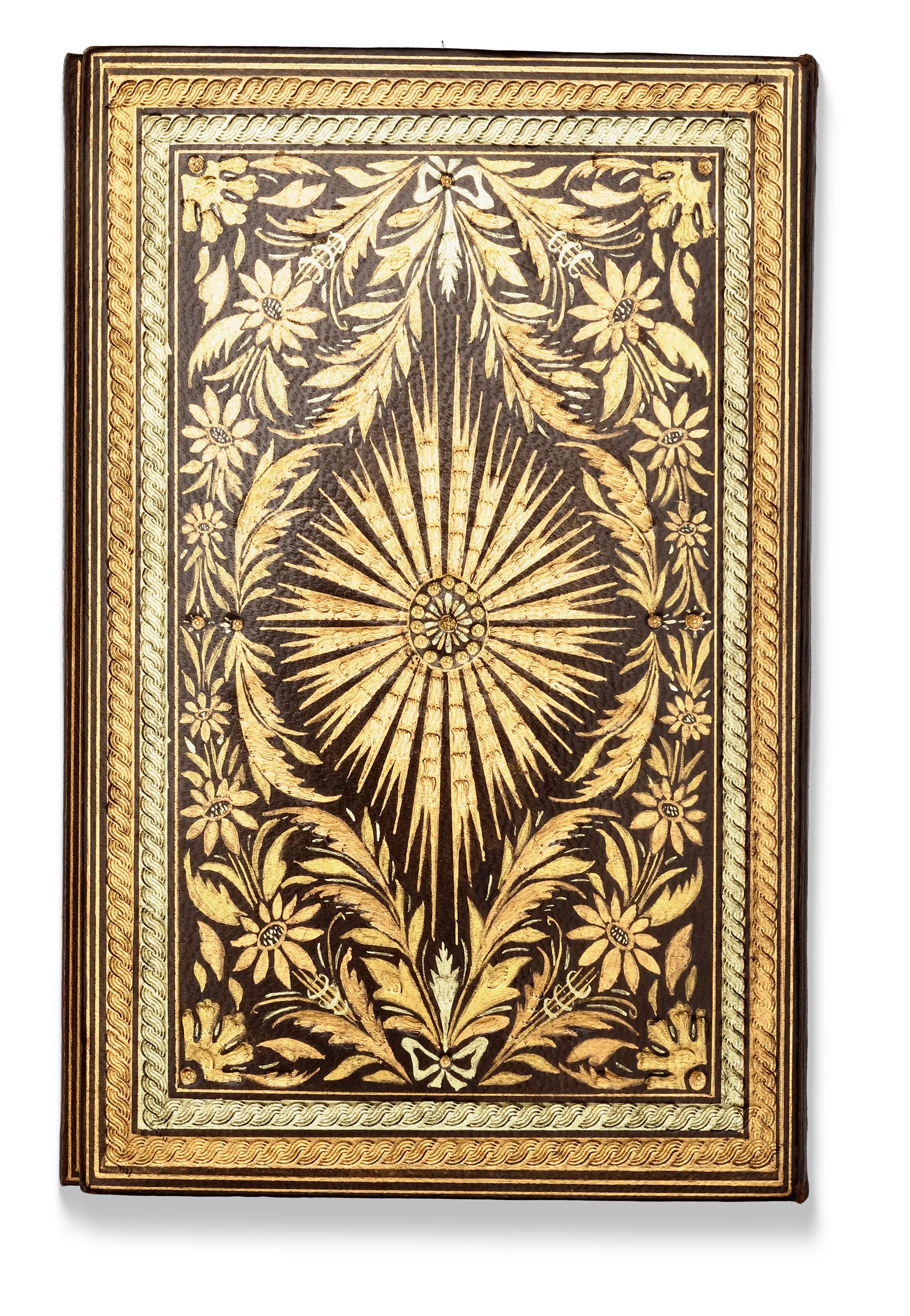 In brown morocco binding with flap decorated with gold painted central medallion and border.