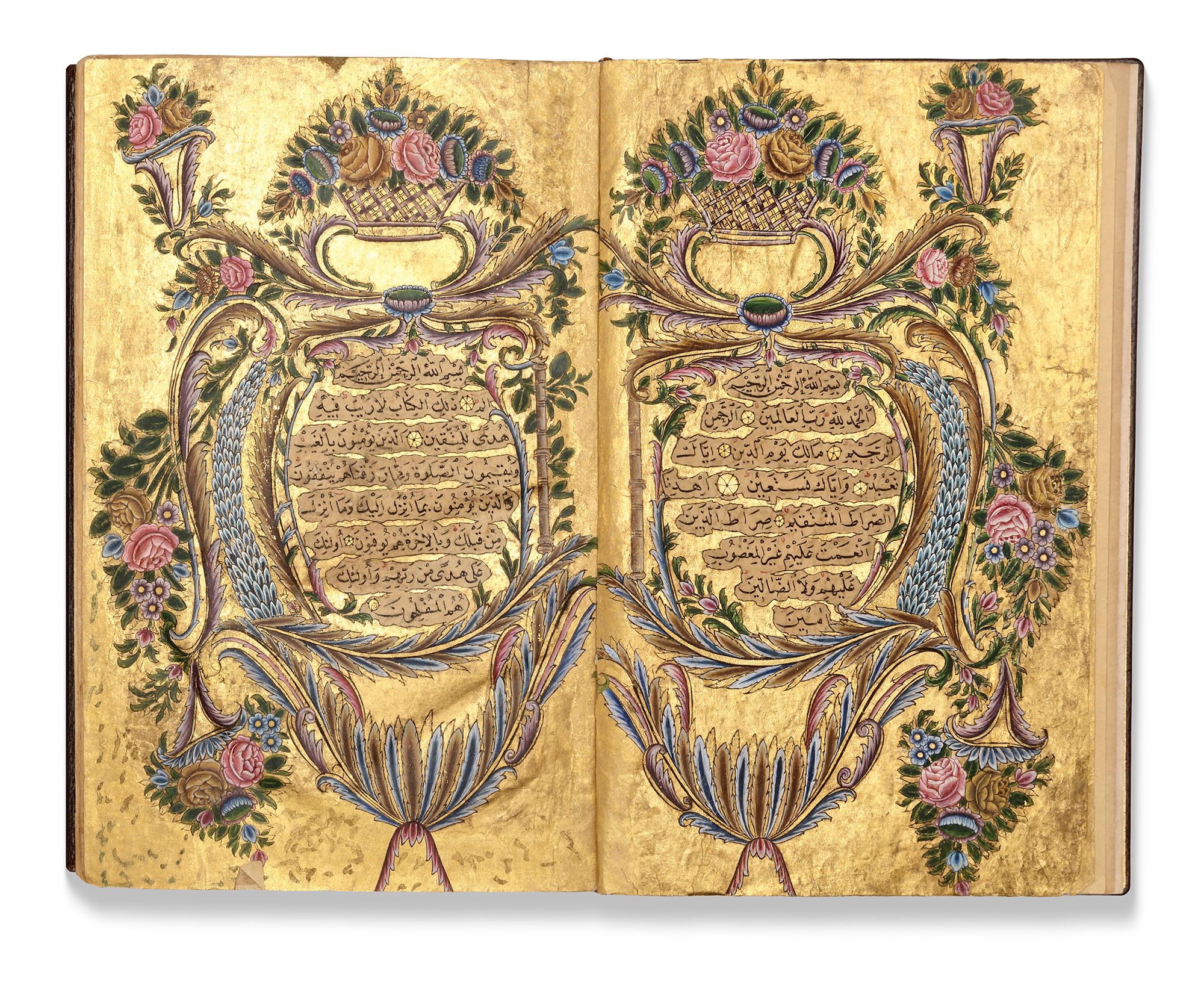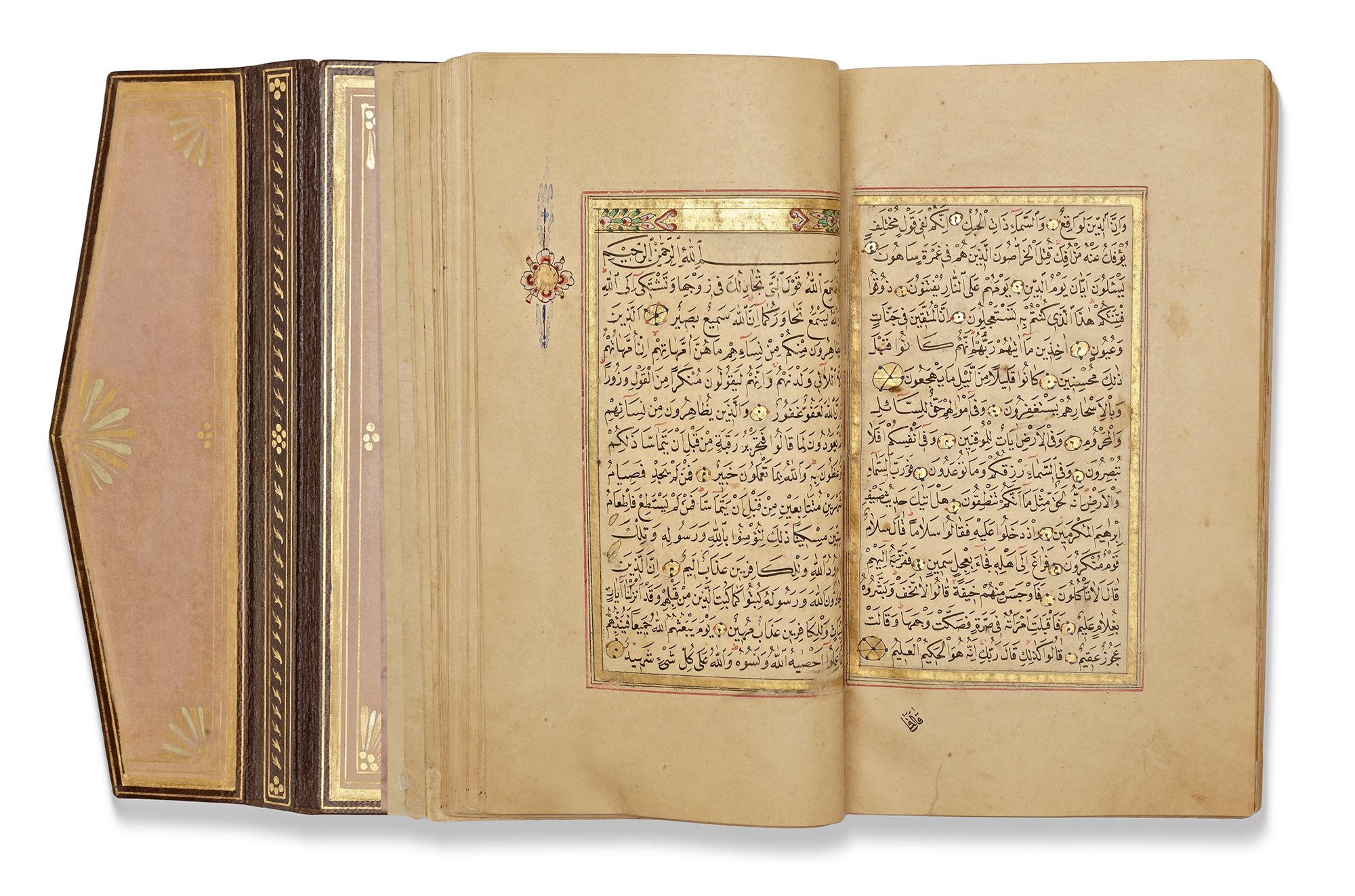 A complete Quran, Arabic manuscript on cream paper, each page with 15 lines, written in black naskh script within gold and polychrome rules, gold roundel verse markers with polychrome dots. Surah headings with gold decoration, gold and polychrome marginal motifs indicating the 'Juz'. Two opening biofolia heavily gilt with rococo-style polychrome decoration framing 7 lines of black naskh in clouds reserved against a sprinkled gold ground.