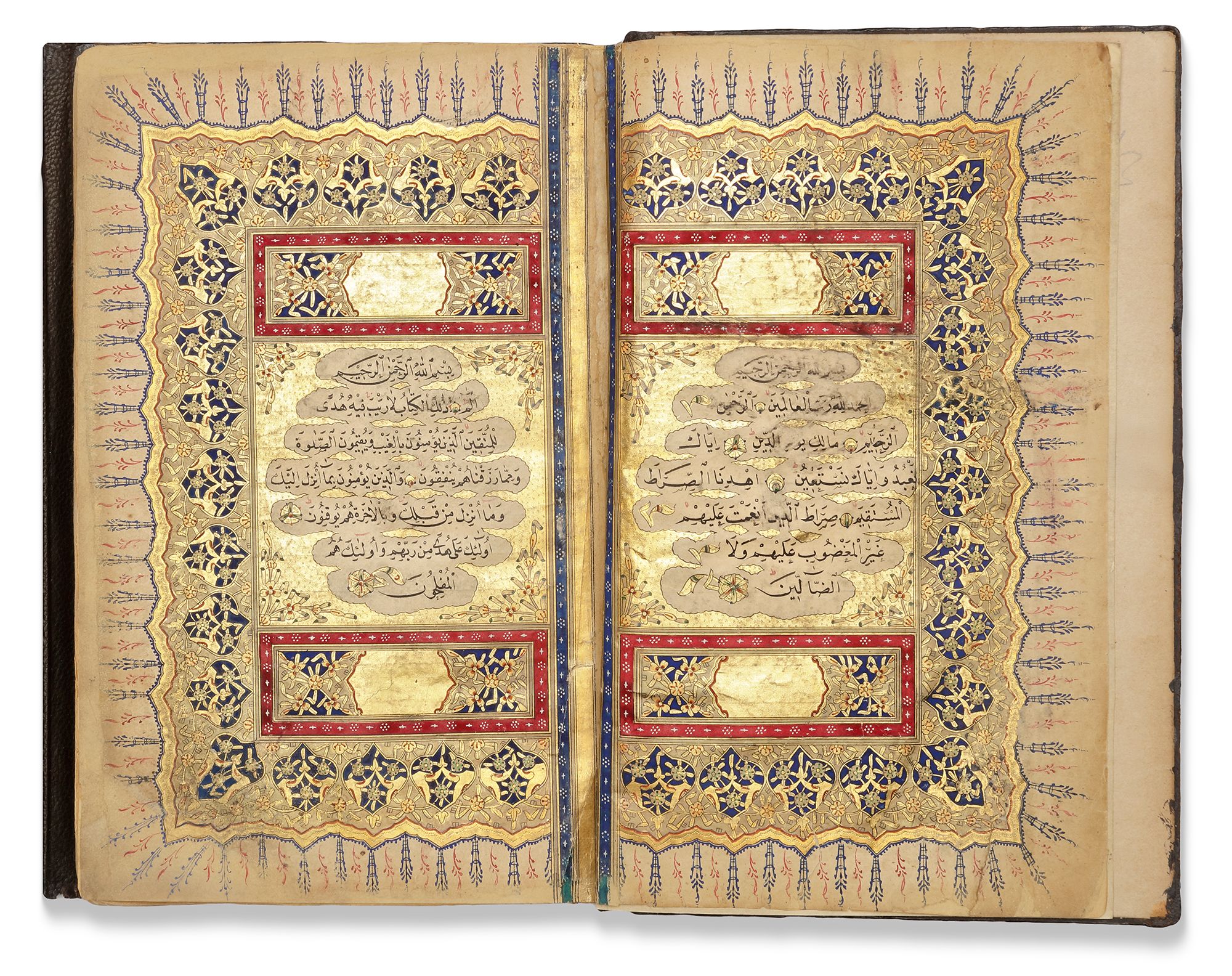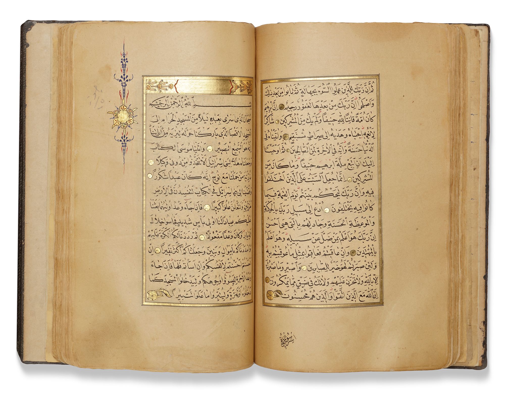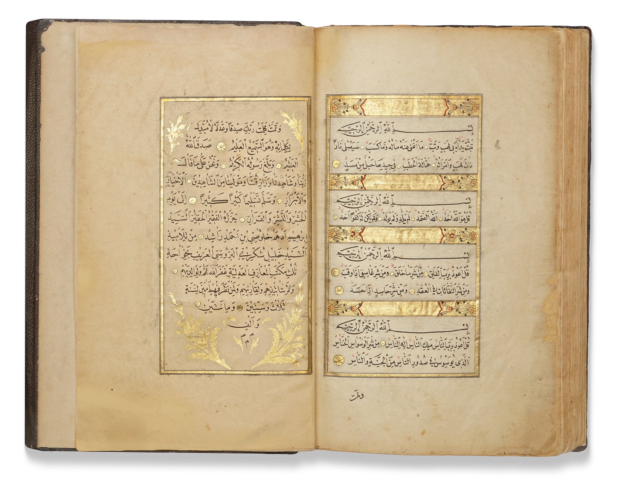 A complete Quran, Arabic manuscript on cream paper, each page with 15 lines, written in black naskh script within gold and black rules, gold roundel verse markers outlined in black. Surah headings with gold and polychrome decoration, gold and polychrome marginal motifs indicating the 'Juz'. Two opening biofolia with heavily gilt and polychrome decoration framing 7 lines of black naskh in clouds reserved against a sprinkled gold ground.
