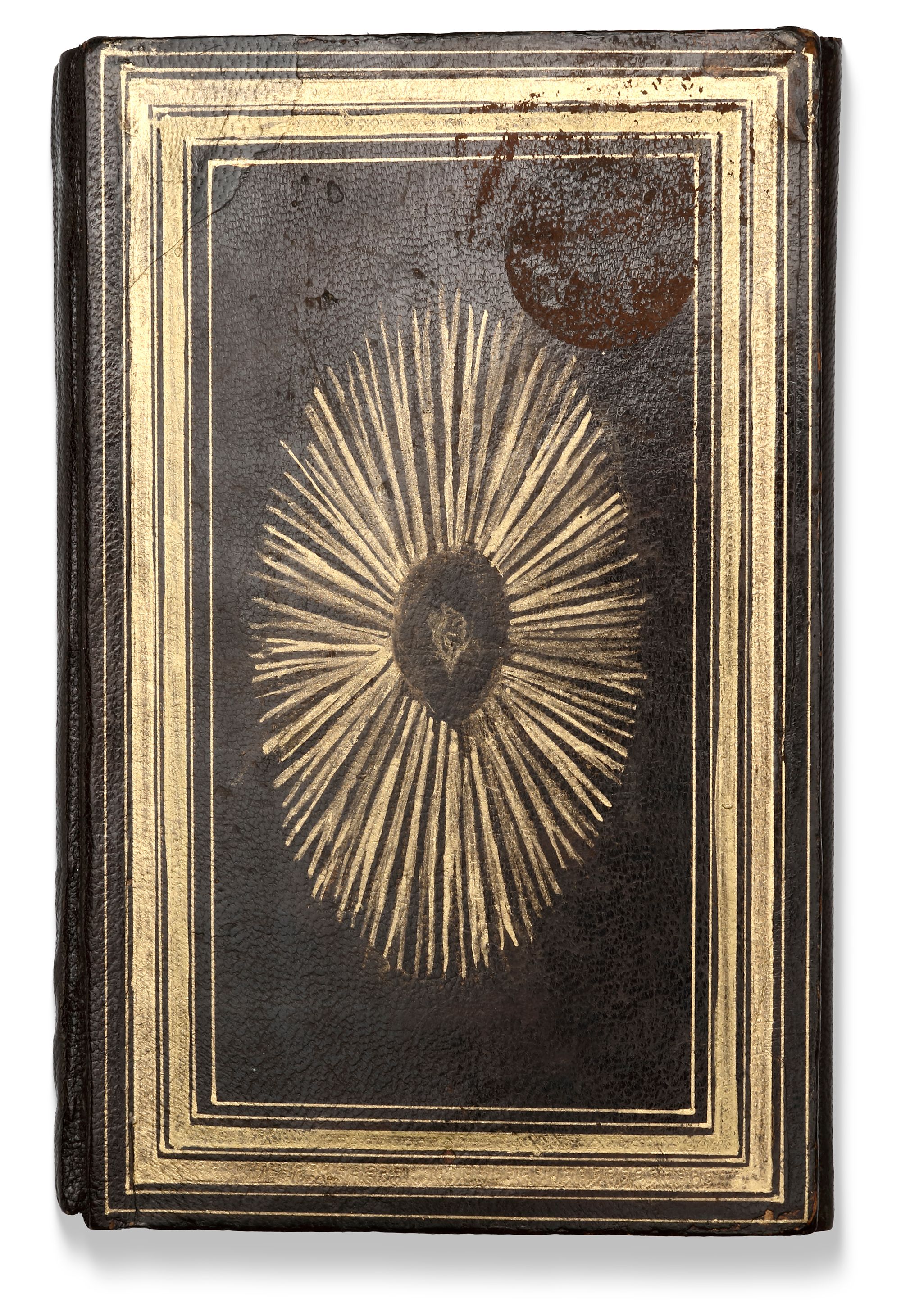 In black leather morocco binding with flap decorated with gold painted central medallion and border.
