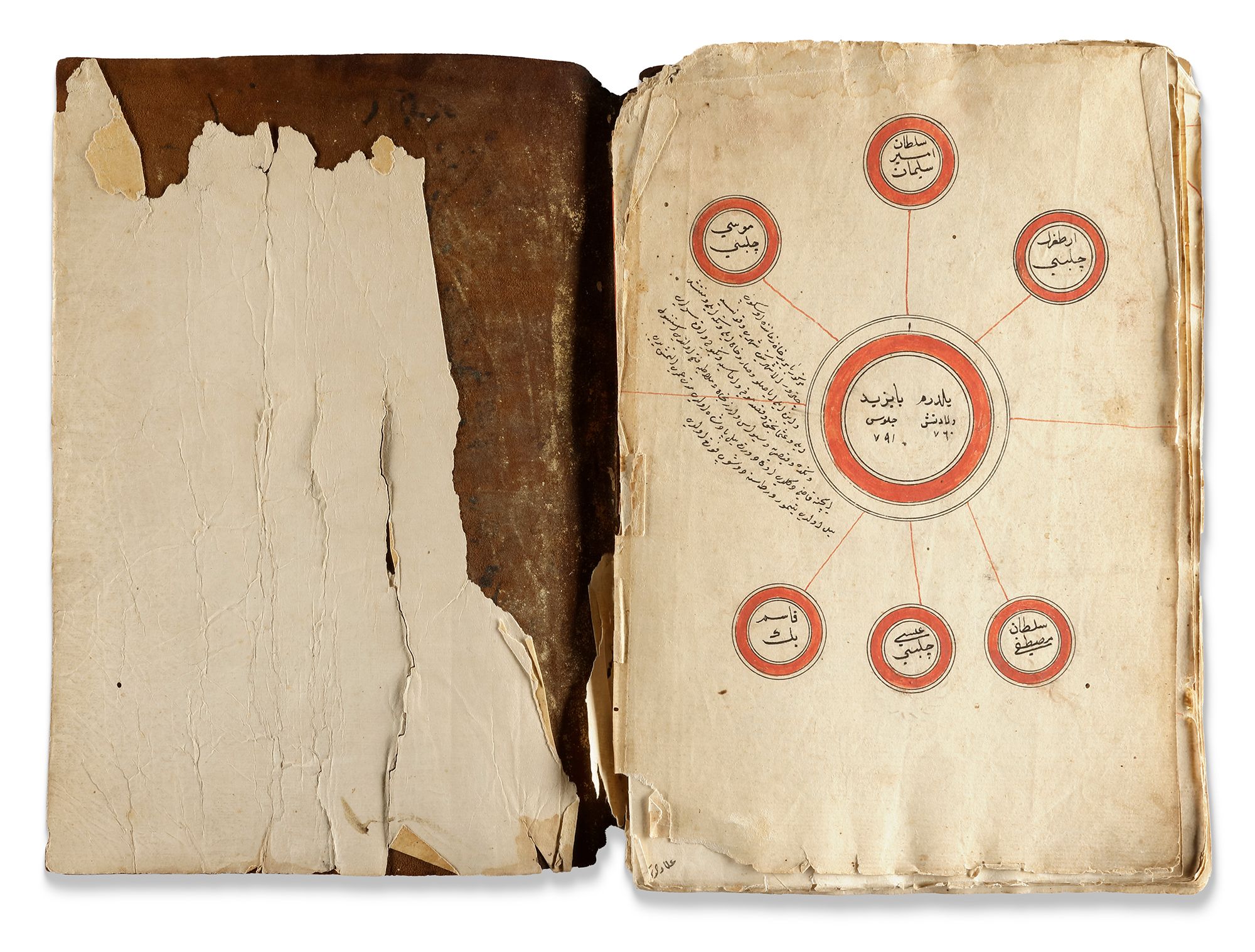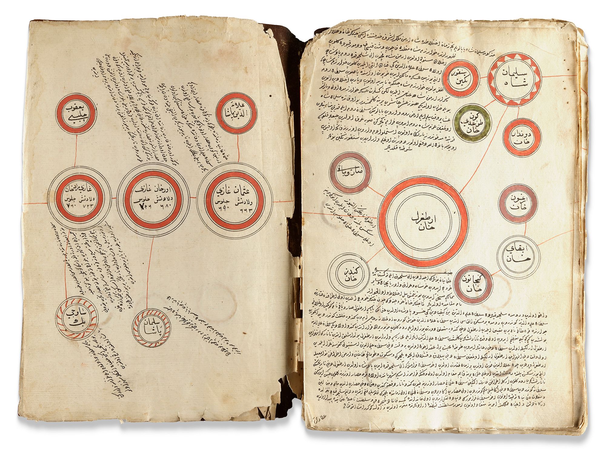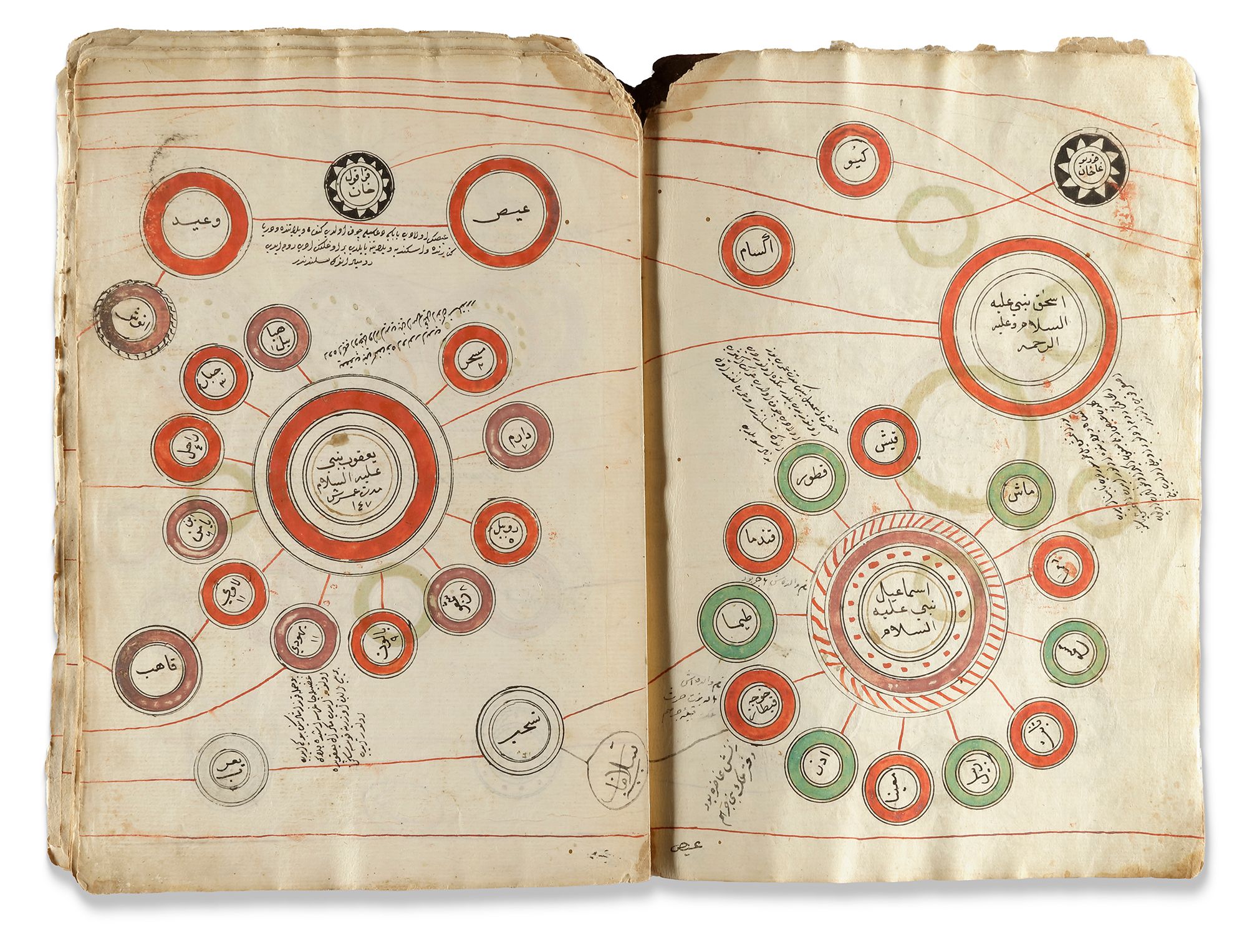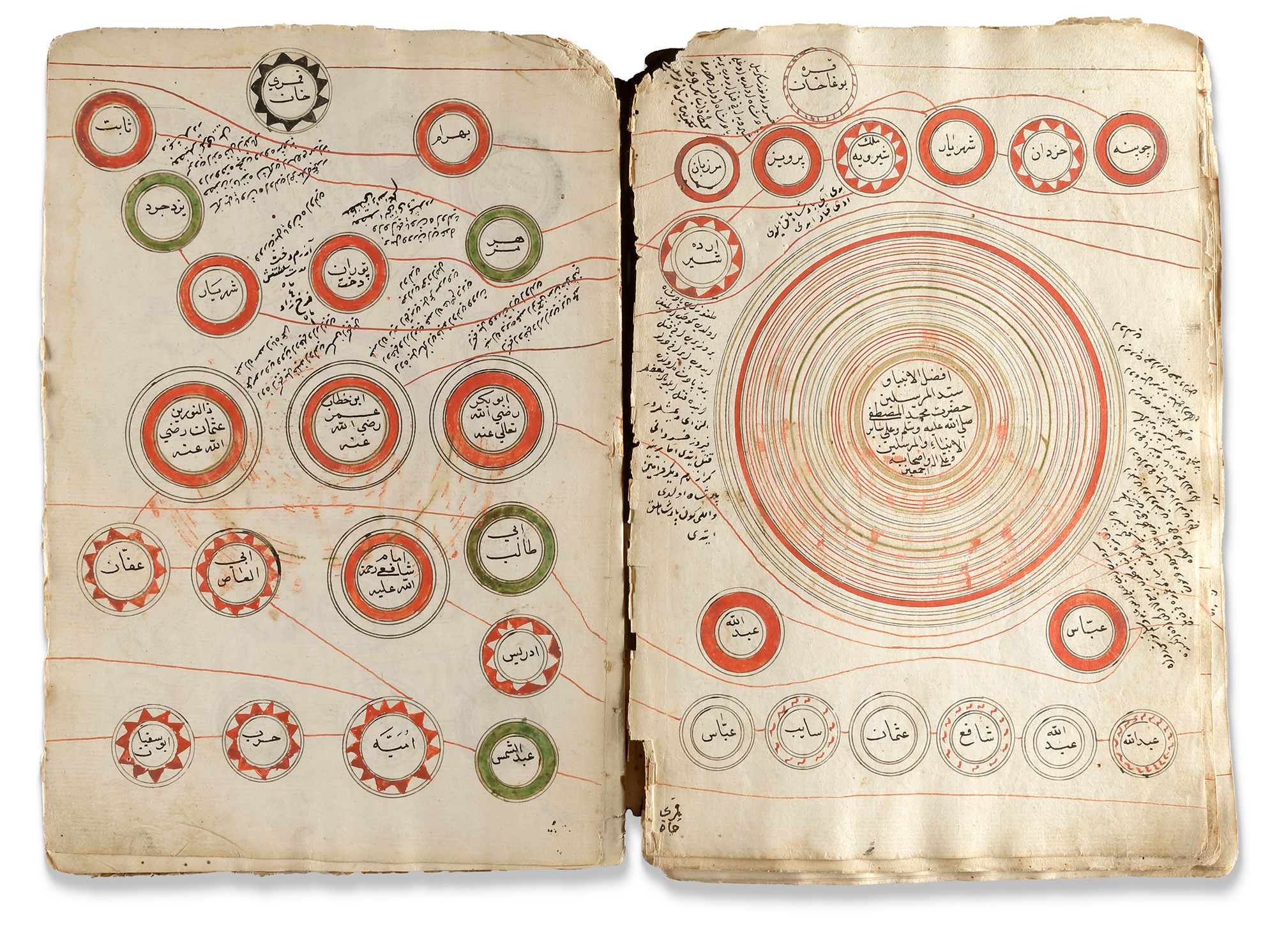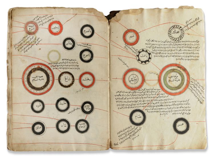 Arabic and Ottoman Turkish manuscript on cream paper, 28 leaves each page with polychrome roundels containing names and titles of religious and historical figures in black Ottoman naskh script, starting with Adam and finishing with the Ottoman Sultan Bayazid, the roundels surrounded by notes in black, illuminated heading followed by an introduction in black ink.