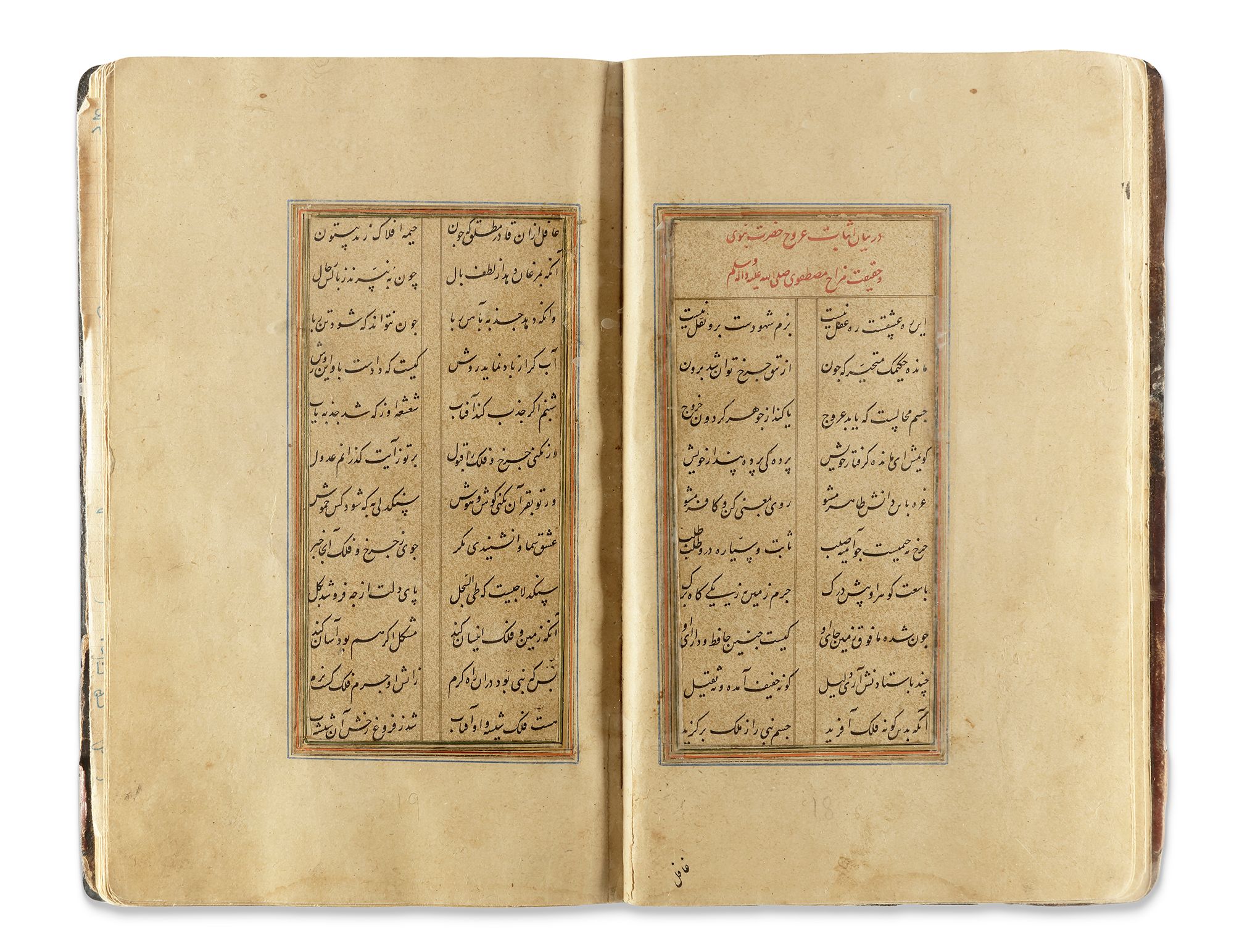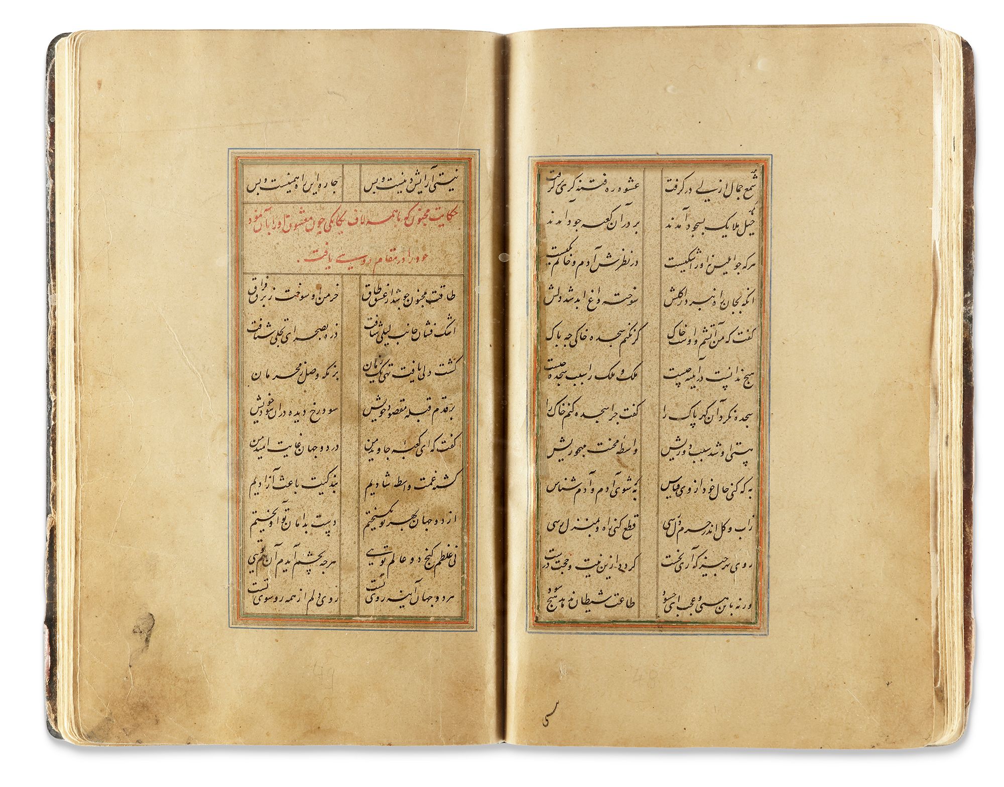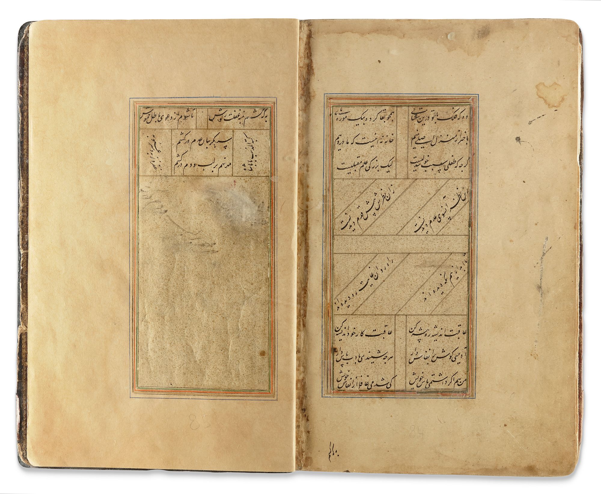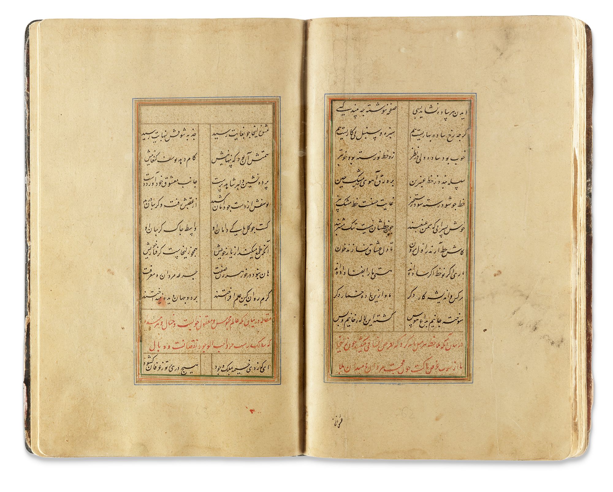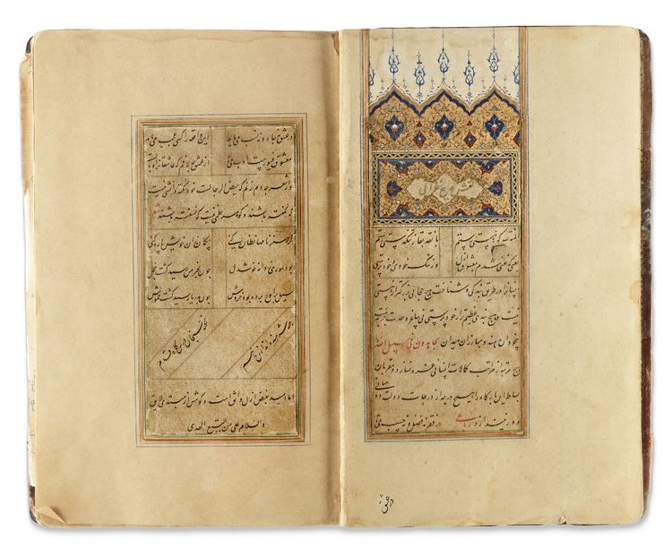 Catalogue Note: This exceptional manuscript showcases the harmonious and exquisitely balanced hand of the master calligrapher Baba Shah, one of the most esteemed figures at the Safavid court of Shah Tahmasp (r. 1524–1576). The poetic text, a mystical composition, was authored by Baba Shah’s contemporary, the distinguished poet Muhammad Ghazali Mashhadi. A qasida from this very work, dedicated to Shah Tahmasp, appears on folio 13a of the present volume.