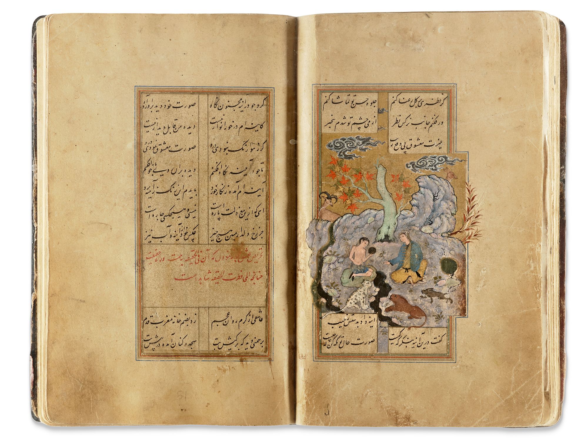 A Persian manuscript on gold-sprinkled paper, comprising 43 leaves with 12 lines per page, written in elegant nastaʿlīq script in black ink. The text is arranged in two columns, ruled in green, orange, gold, and blue. Folio 1b features a polychrome and gold headpiece, while folio 25b contains a miniature of Layla and Majnun rendered in watercolor heightened with gold. The manuscript is bound in brown leather with stamped gilt decoration, and doublures adorned with a central medallion and cornerpieces decorated with delicate filigree over a colored ground.