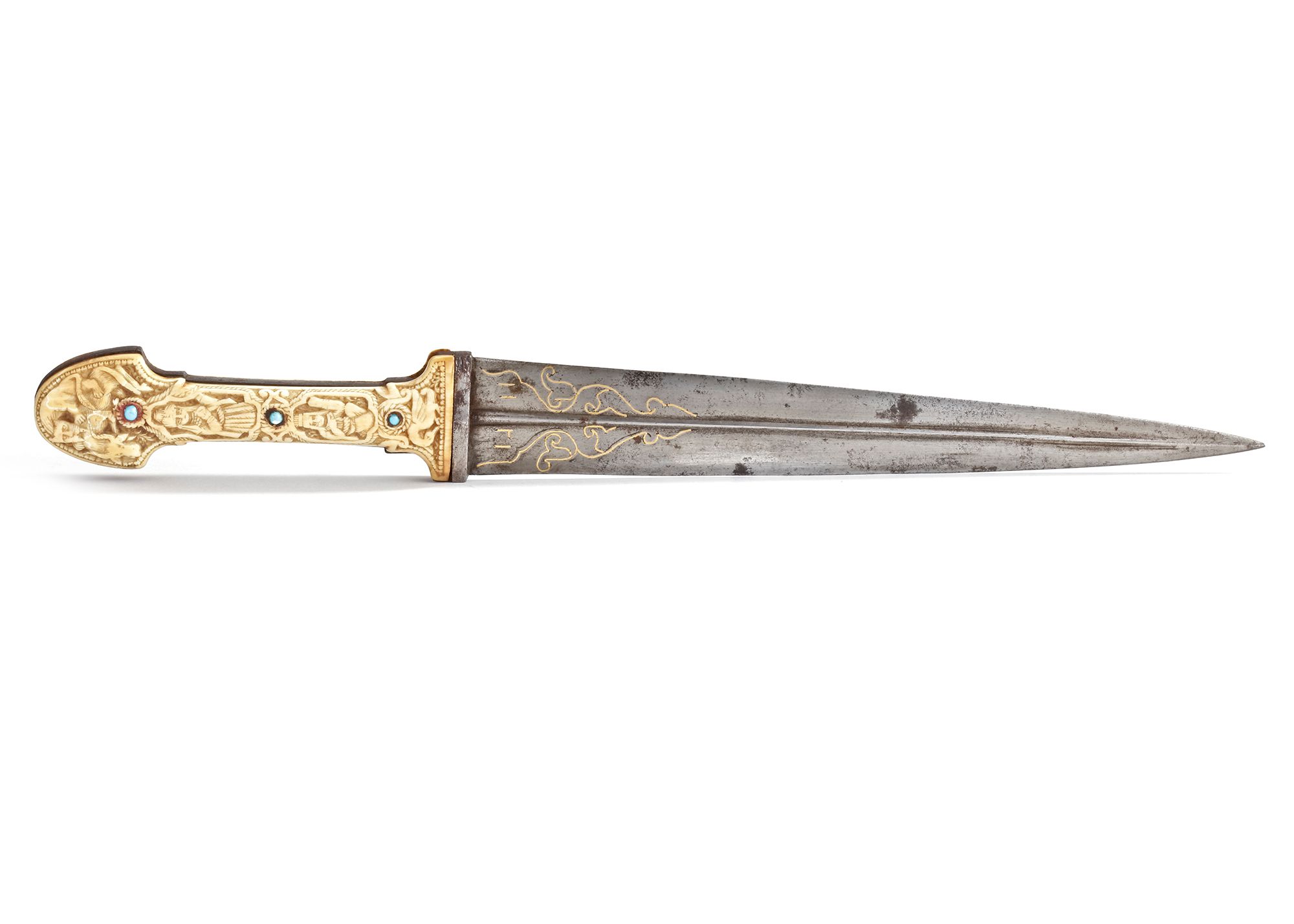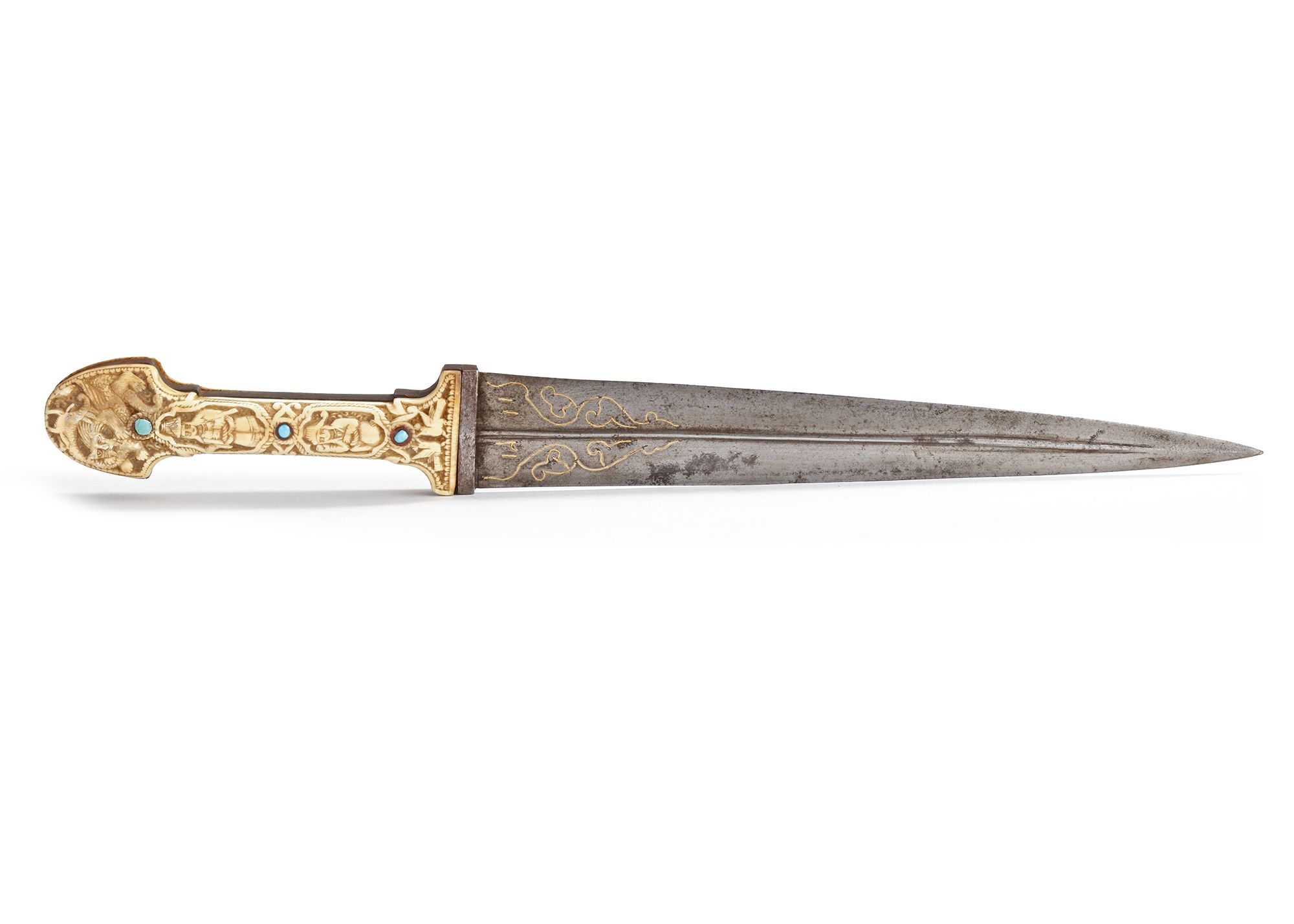 A Persian bone-hilted dagger features a double-edged watered-steel blade with a faint central ridge and subtle wavy patterns, tapering to a sharp point. The bone hilt is intricately carved with cartouches enclosing Persian figures and a hunting scene, embedded with turquoise gemstones. The pommel and guard are elegantly shaped, with gold-overlaid inscriptions at the forte.