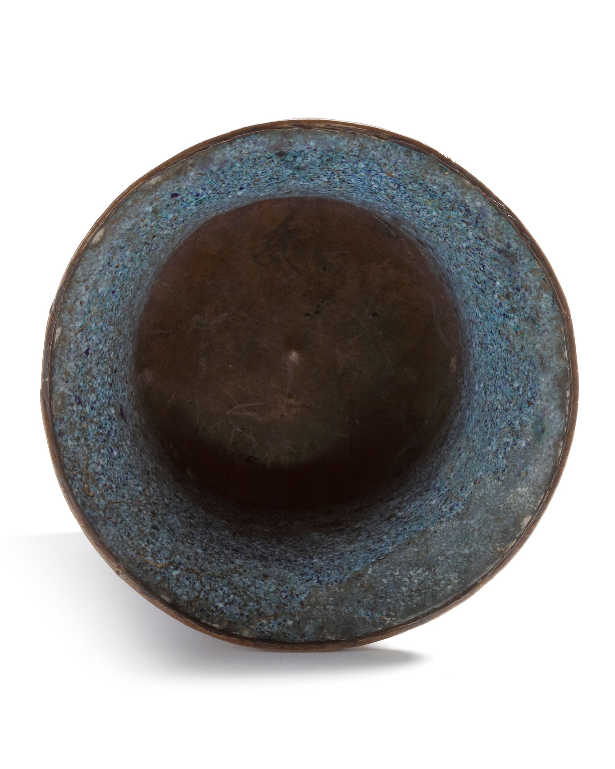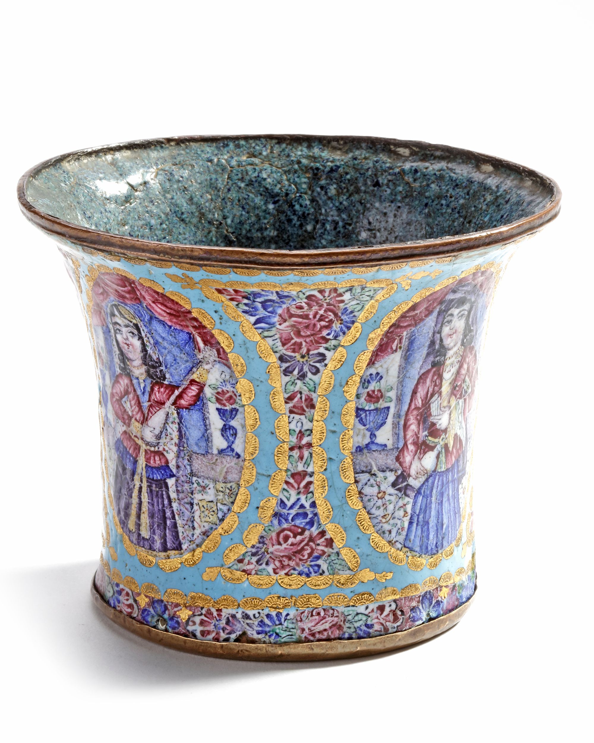 Of typical flaring cylindrical shape, with a wide everted rim, made of gold sheets wrapped around a central copper core, the exterior finely painted with polychrome enamels with four oval medallions filled with the typical Qajar topos of charming maidens' miniature portraits, each medallion framed within a golden beaded band, alternating with golden floral bouquets and foliage against cobalt blue ground.