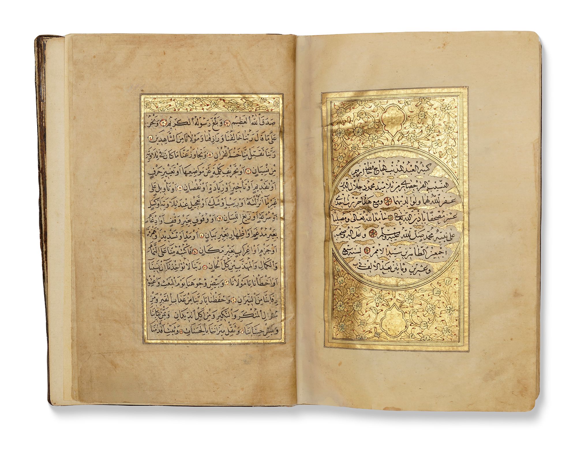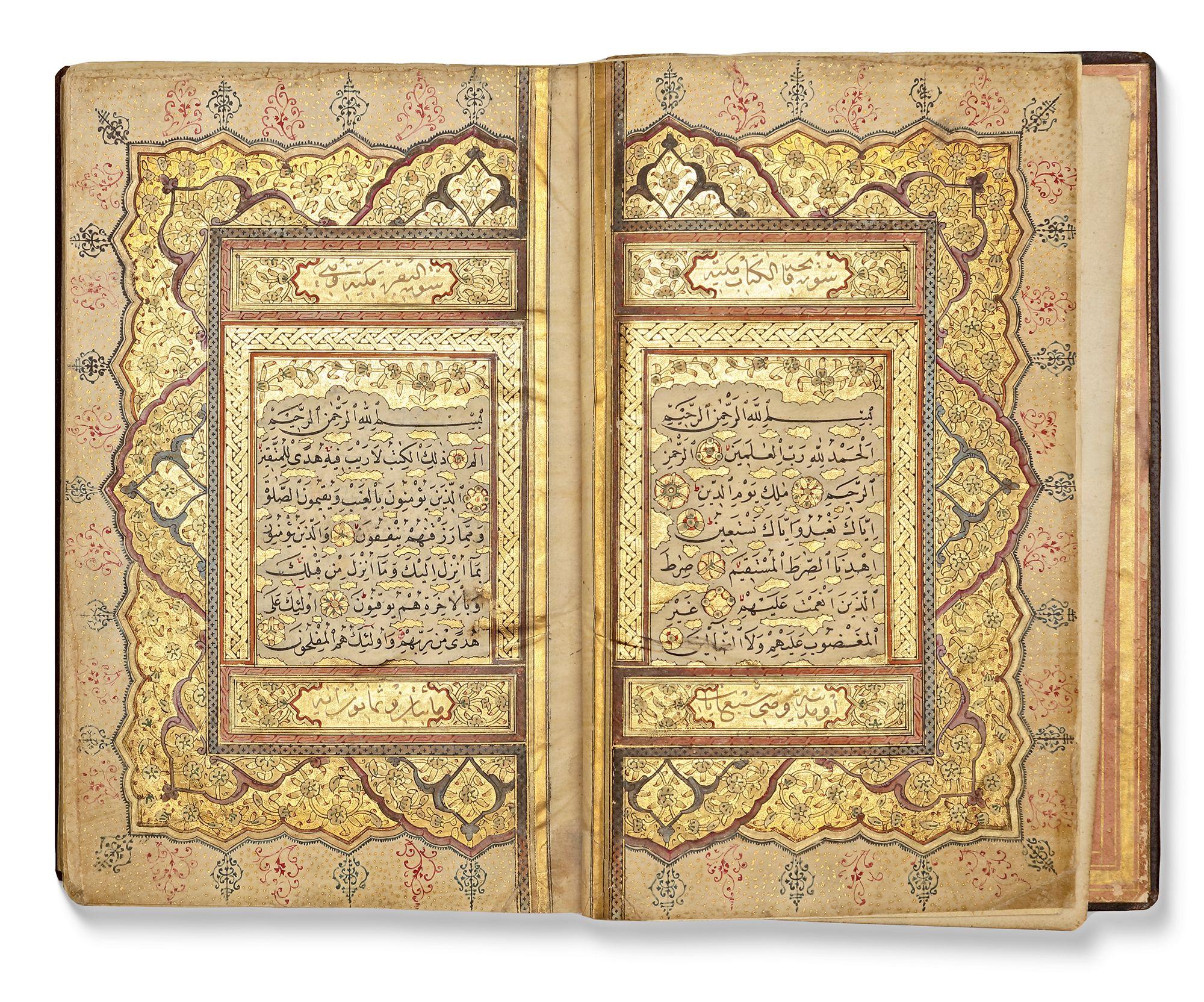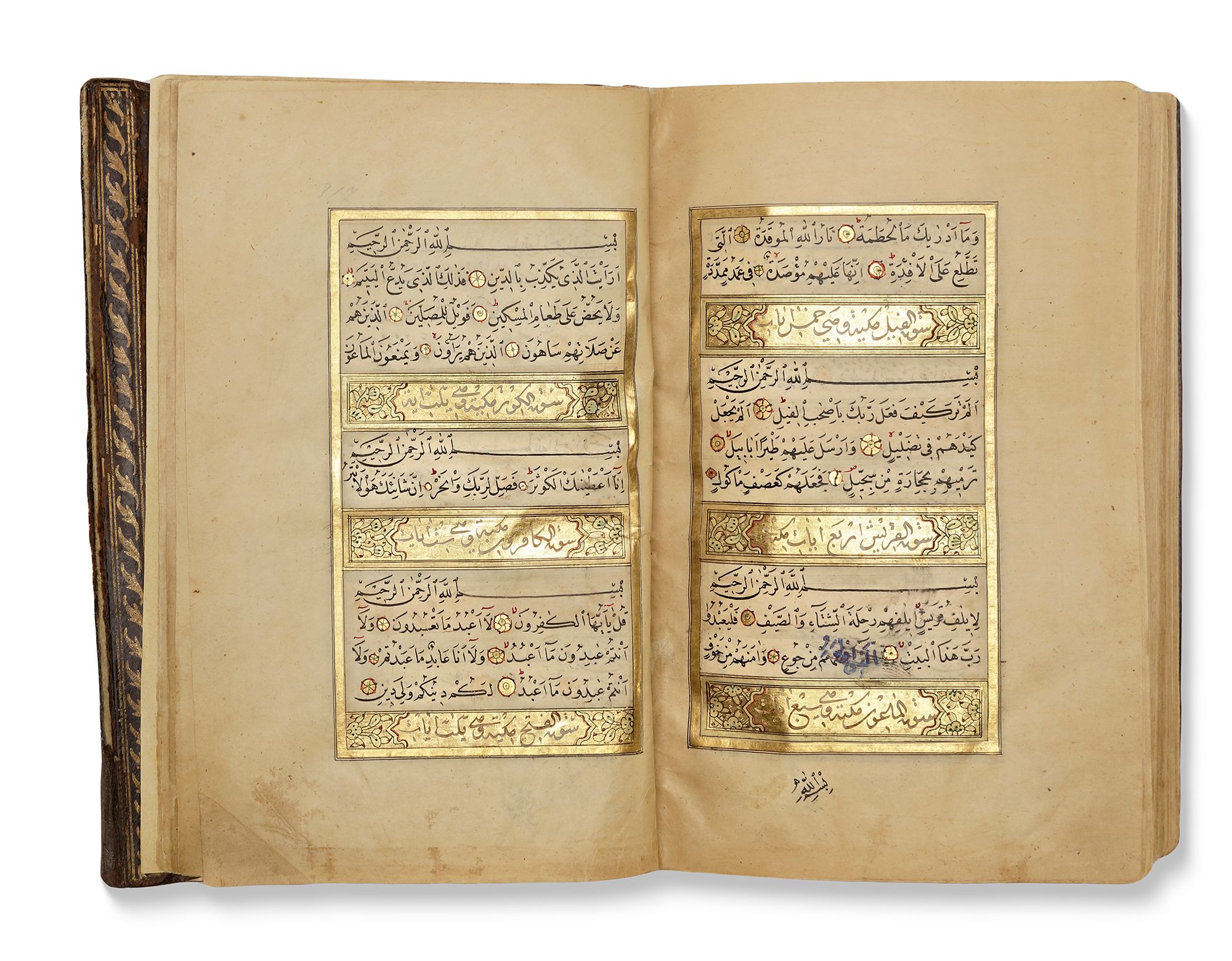 A complete Quran, Arabic manuscript on cream paper, 322 leaves with 2 fly-leaves, each page with 15 lines, written in black naskh script within gold and black rules, gold roundel verse markers outlined in black and pointed in polychrome dots. Surah headings in white thuluth script within gold and polychrome decorated cartouches, gold and polychrome marginal motifs indicating the 'Juz and Hizb'. Two opening biofolia with heavily gilt and polychrome decoration framing 7 lines of black naskh in clouds reserved against a sprinkled gold ground.
