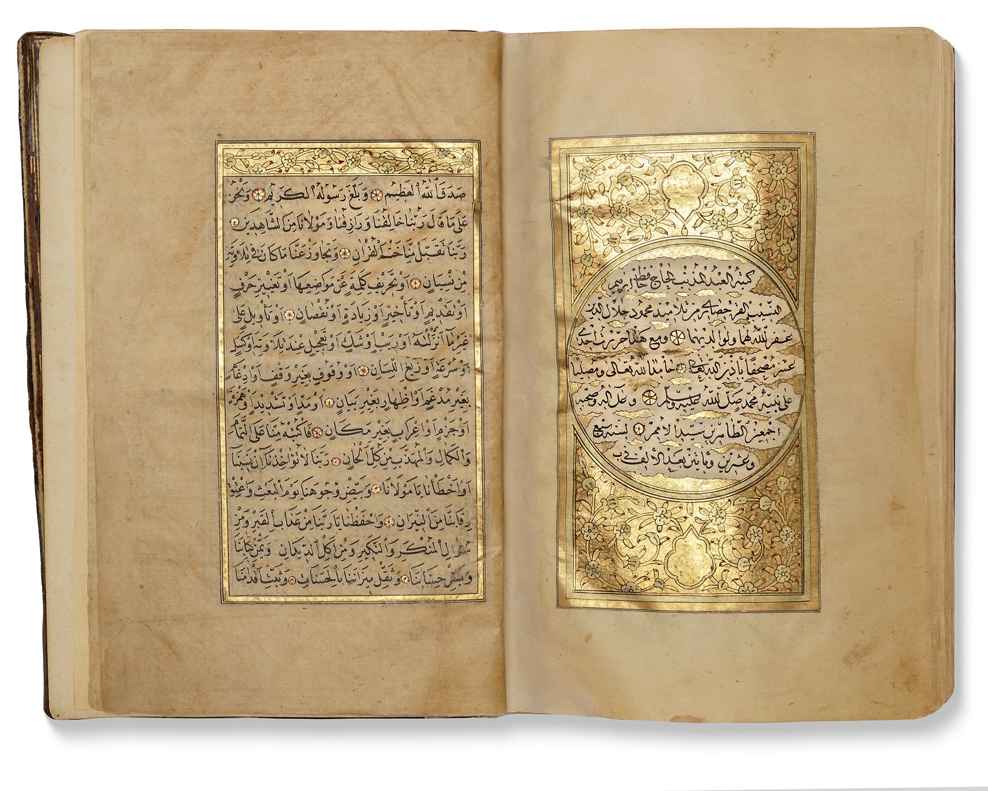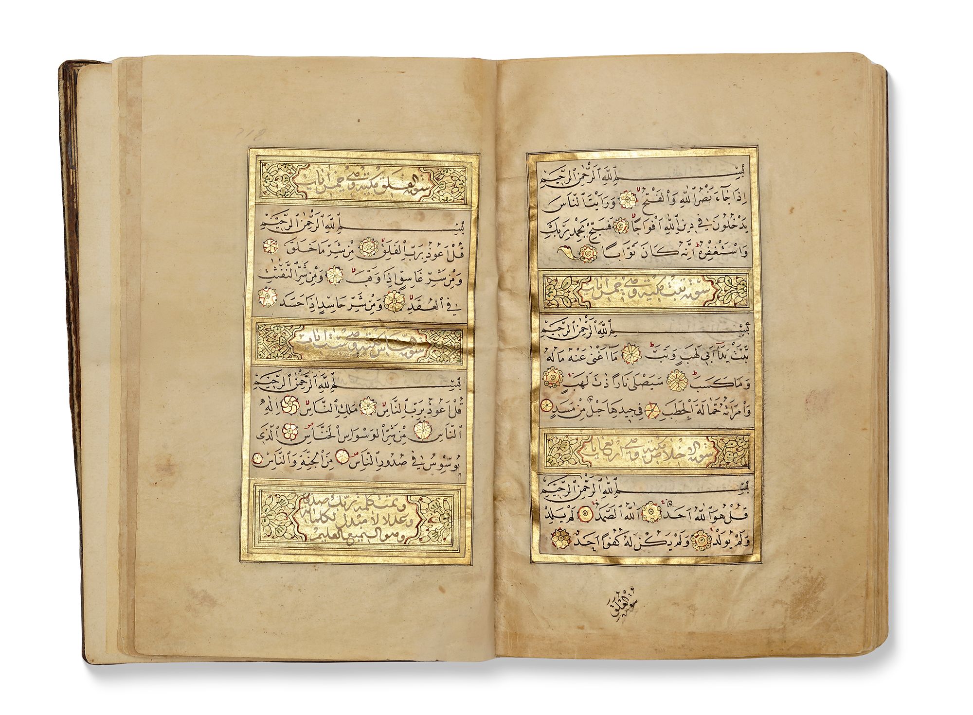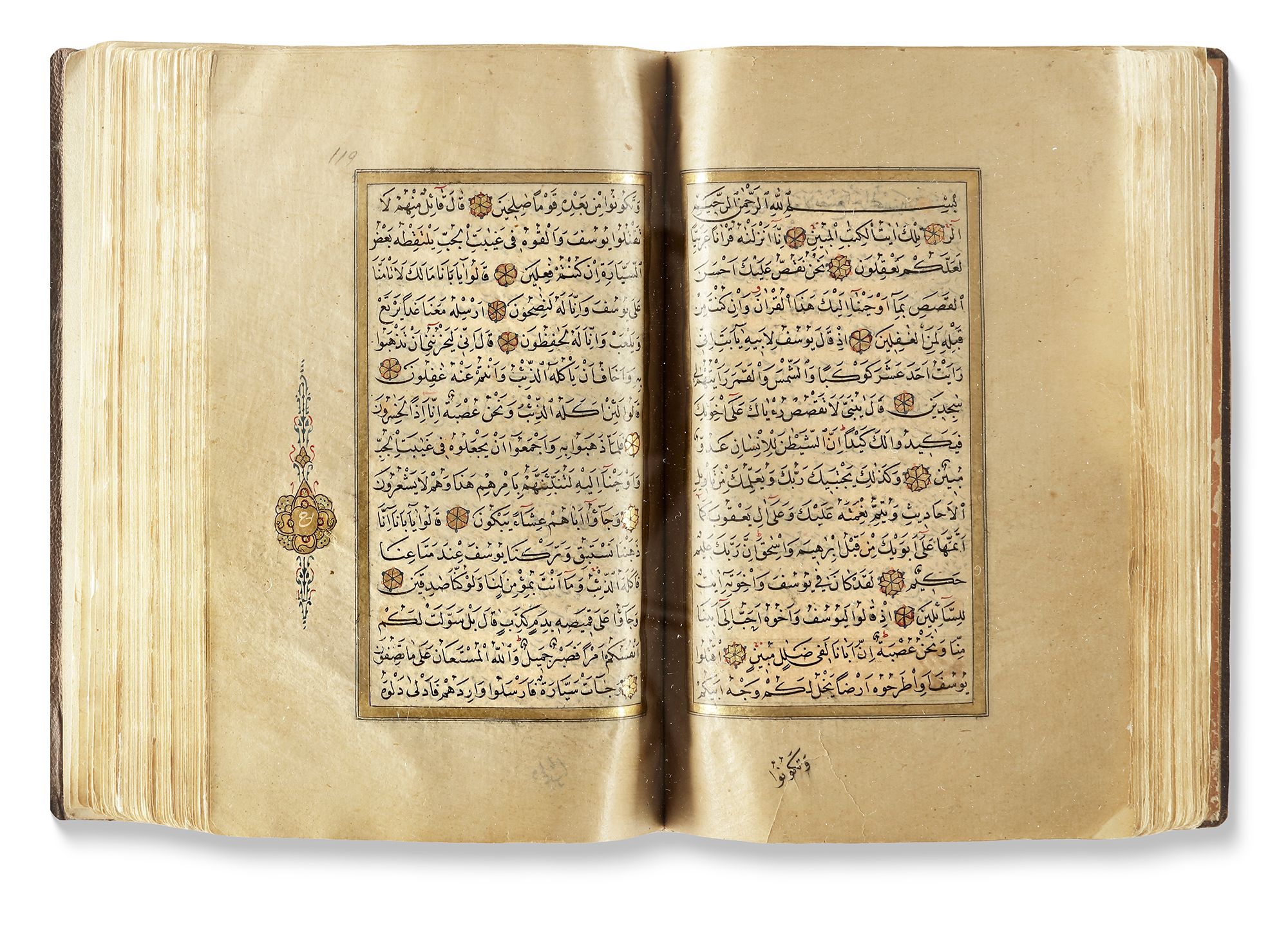 A complete Quran, Arabic manuscript on cream paper, 322 leaves with 2 fly-leaves, each page with 15 lines, written in black naskh script within gold and black rules, gold roundel verse markers outlined in black and pointed in polychrome dots. Surah headings in white thuluth script within gold and polychrome decorated cartouches, gold and polychrome marginal motifs indicating the 'Juz and Hizb'. Two opening biofolia with heavily gilt and polychrome decoration framing 7 lines of black naskh in clouds reserved against a sprinkled gold ground.