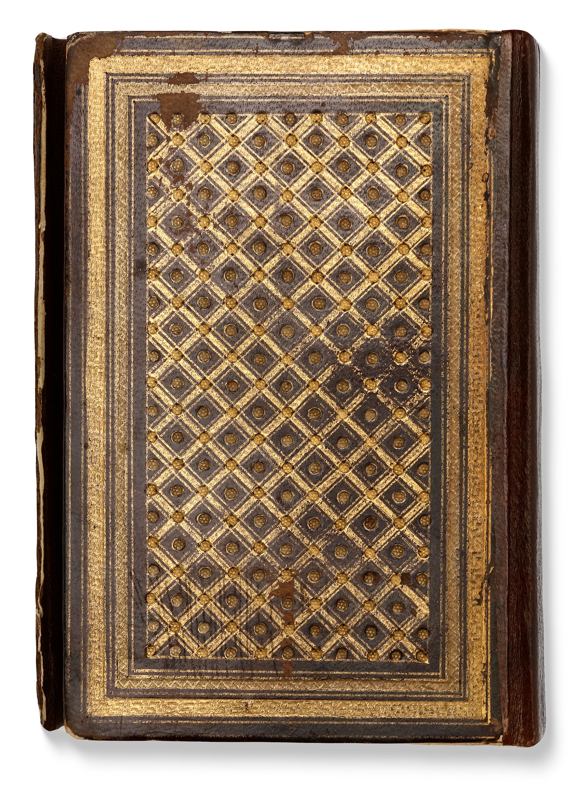 In black leather morocco binding with flap decorated with gold painted central medallion and border.