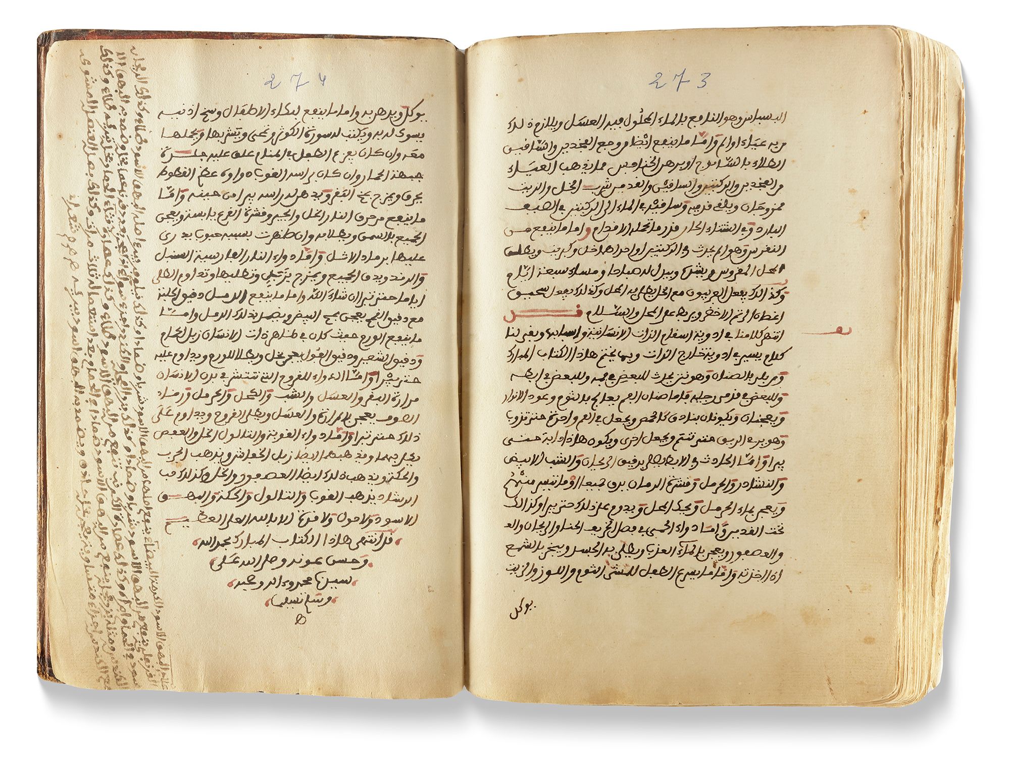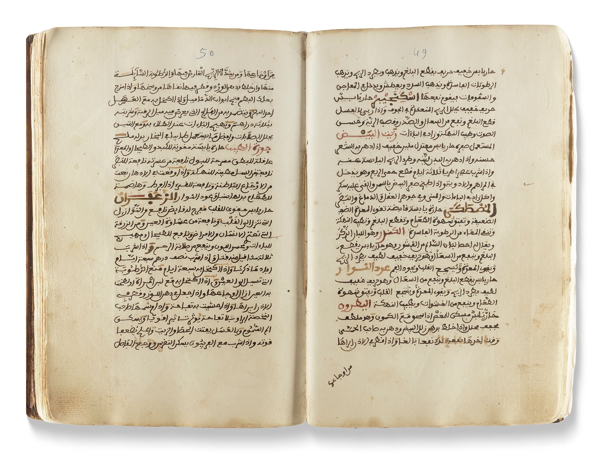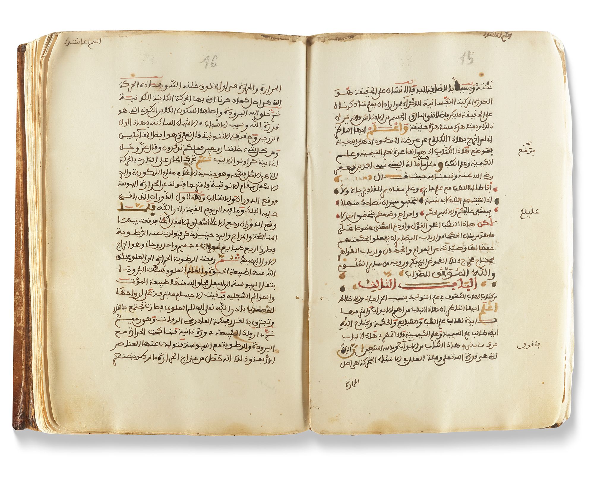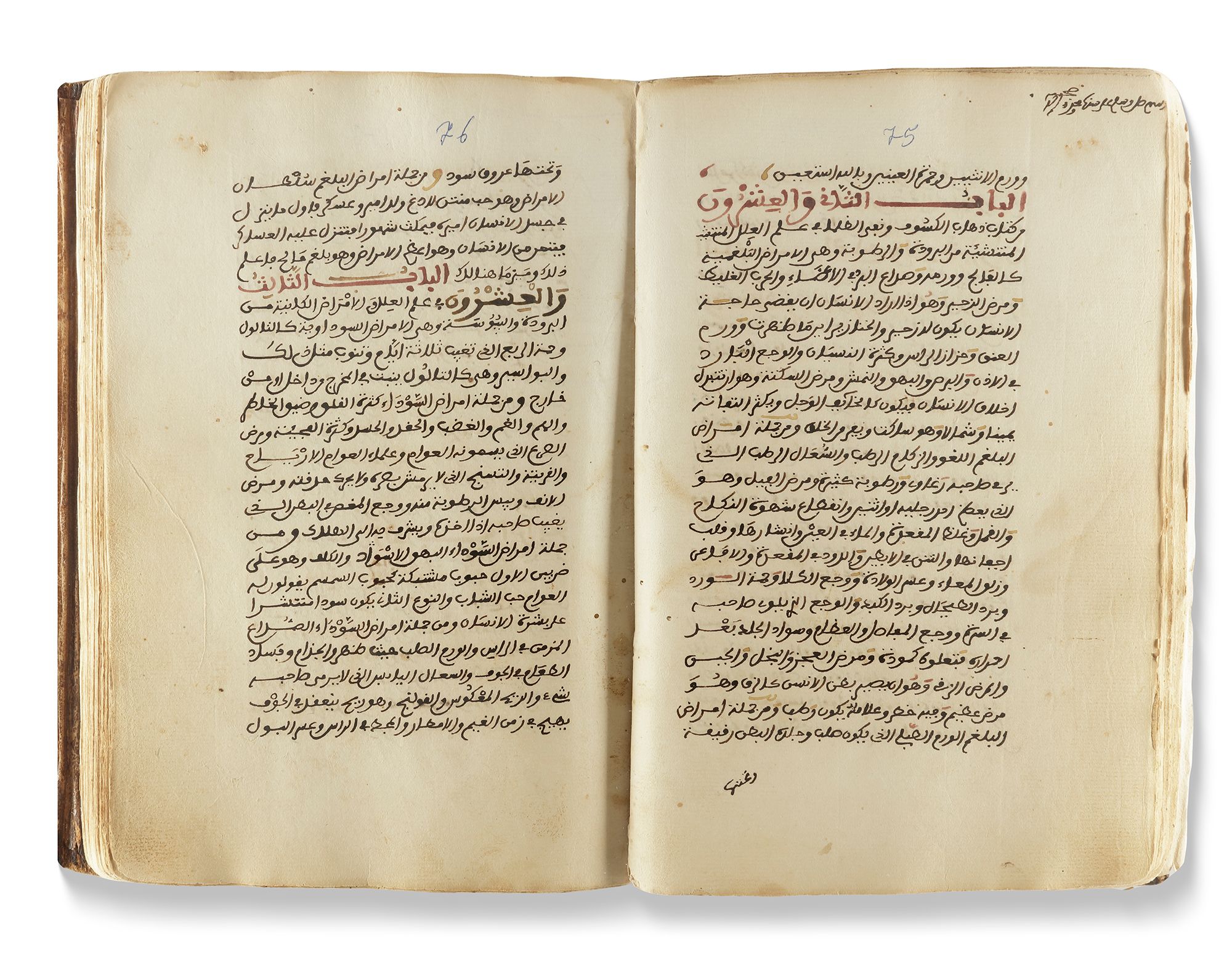 Arabic manusscript on paper, 136 leaves with 4 fly-leaves, each page with 22 lines written in naskh black script, titles and important words in red ink, In red deep leather binding with flap.