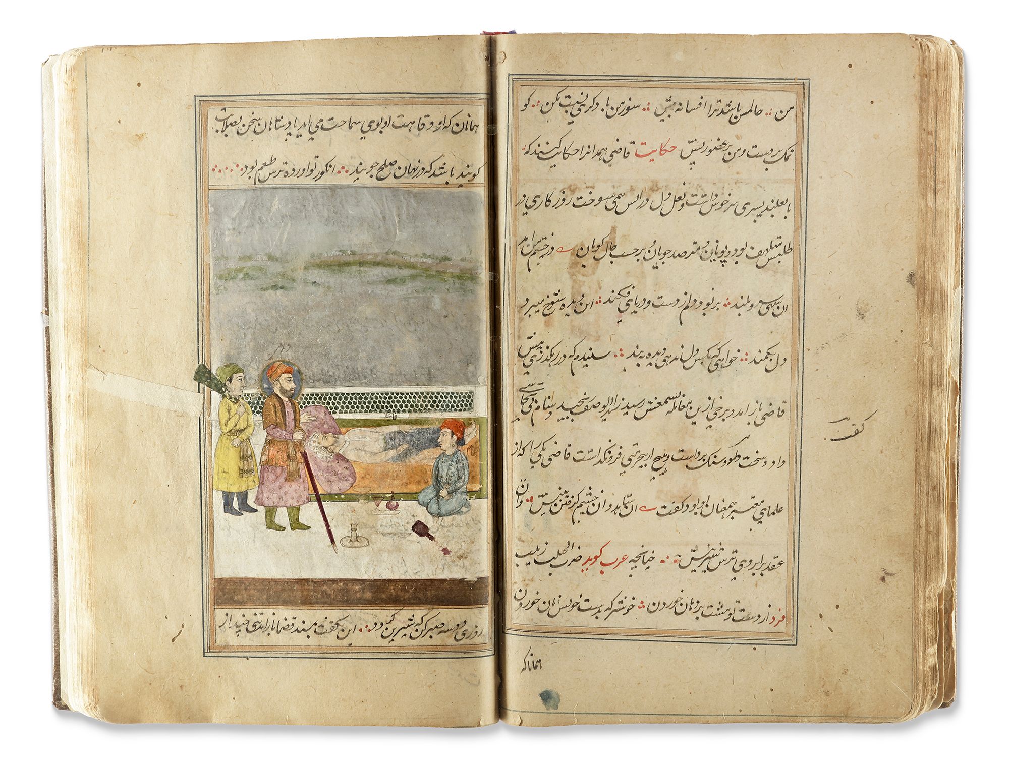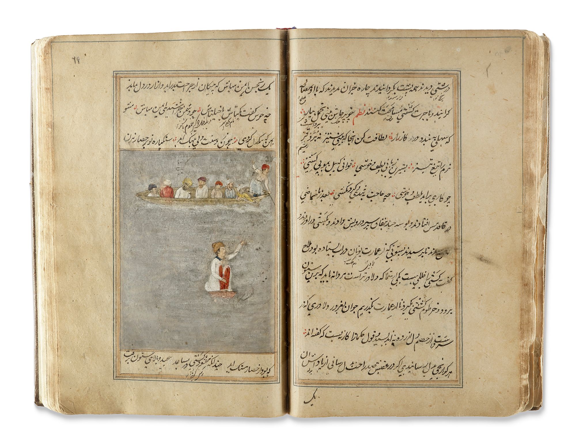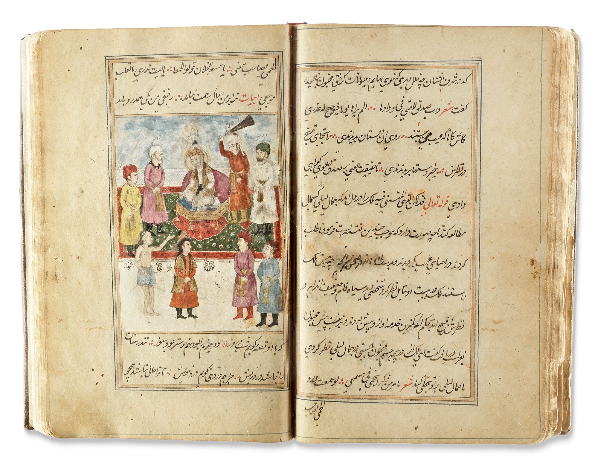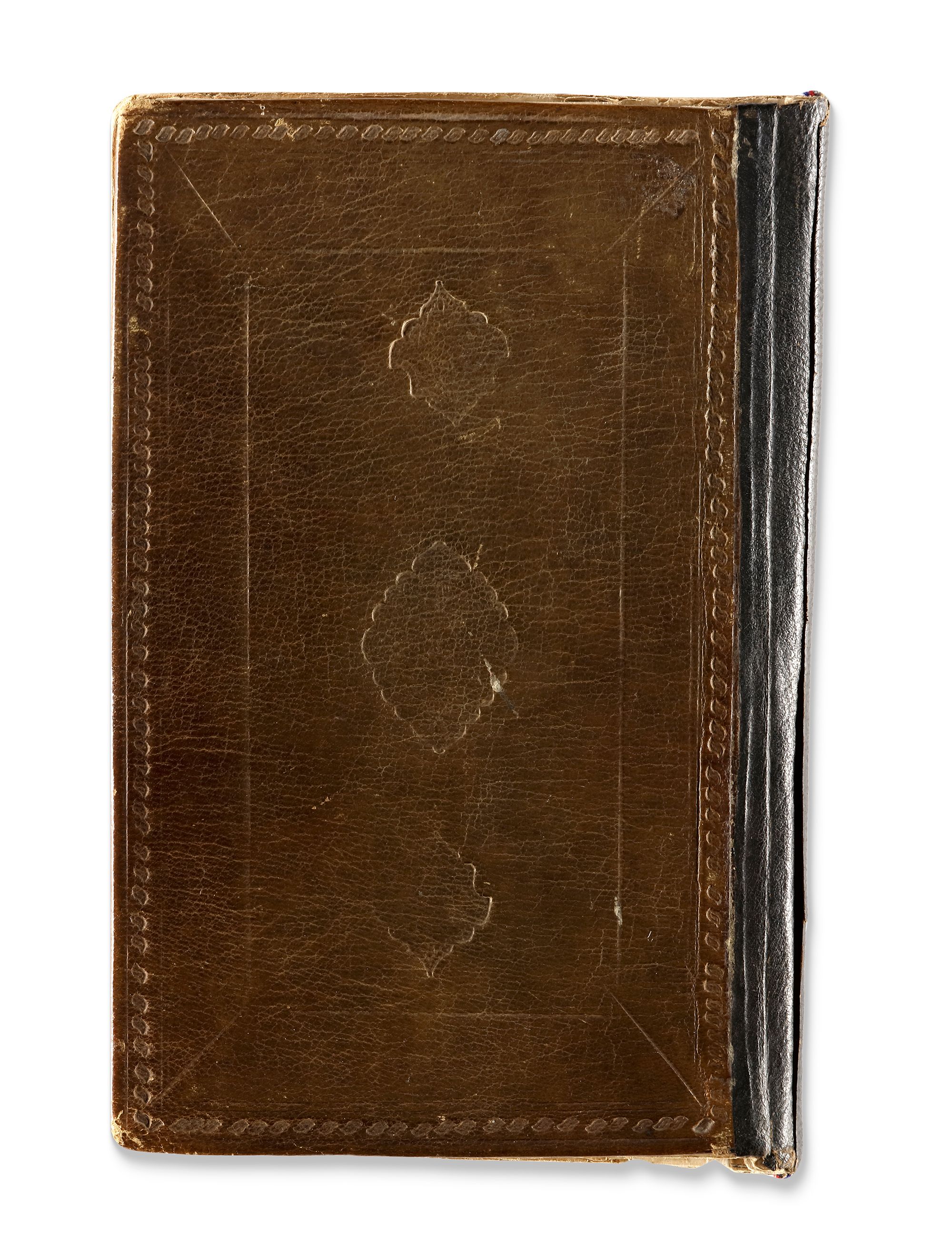 A Persian manuscript on paper, 124ff. with 11 lines per page written in nasta'liq script in black ink. Keywords and phrases are highlighted in red, with ruled gold and blue borders. The two opening bifolia feature a gold and polychrome illuminated headpiece. The manuscript contains various painted miniatures throughout, created in watercolor and heightened with gold. It is bound in brown morocco leather. 22 by 15 cm.