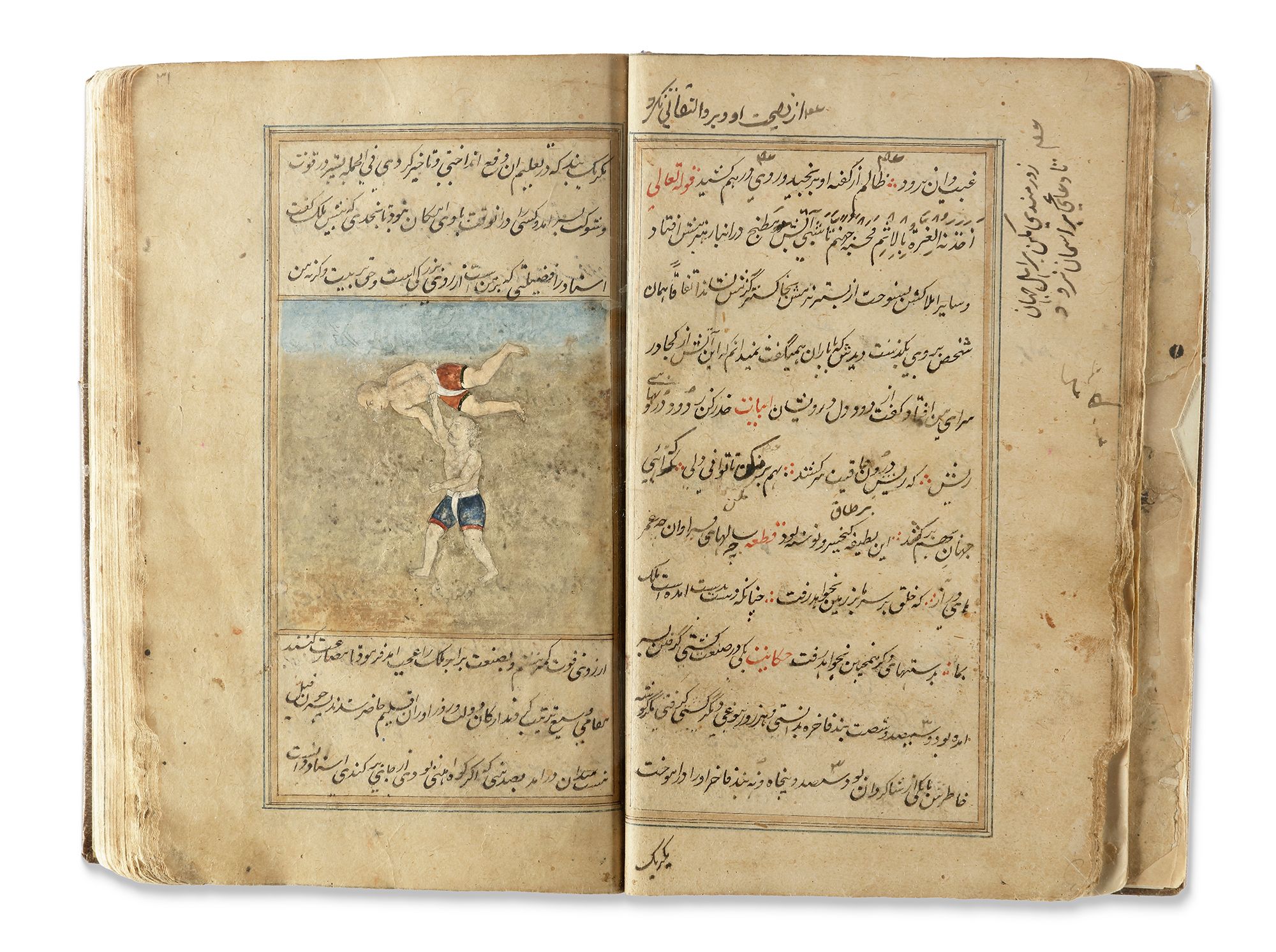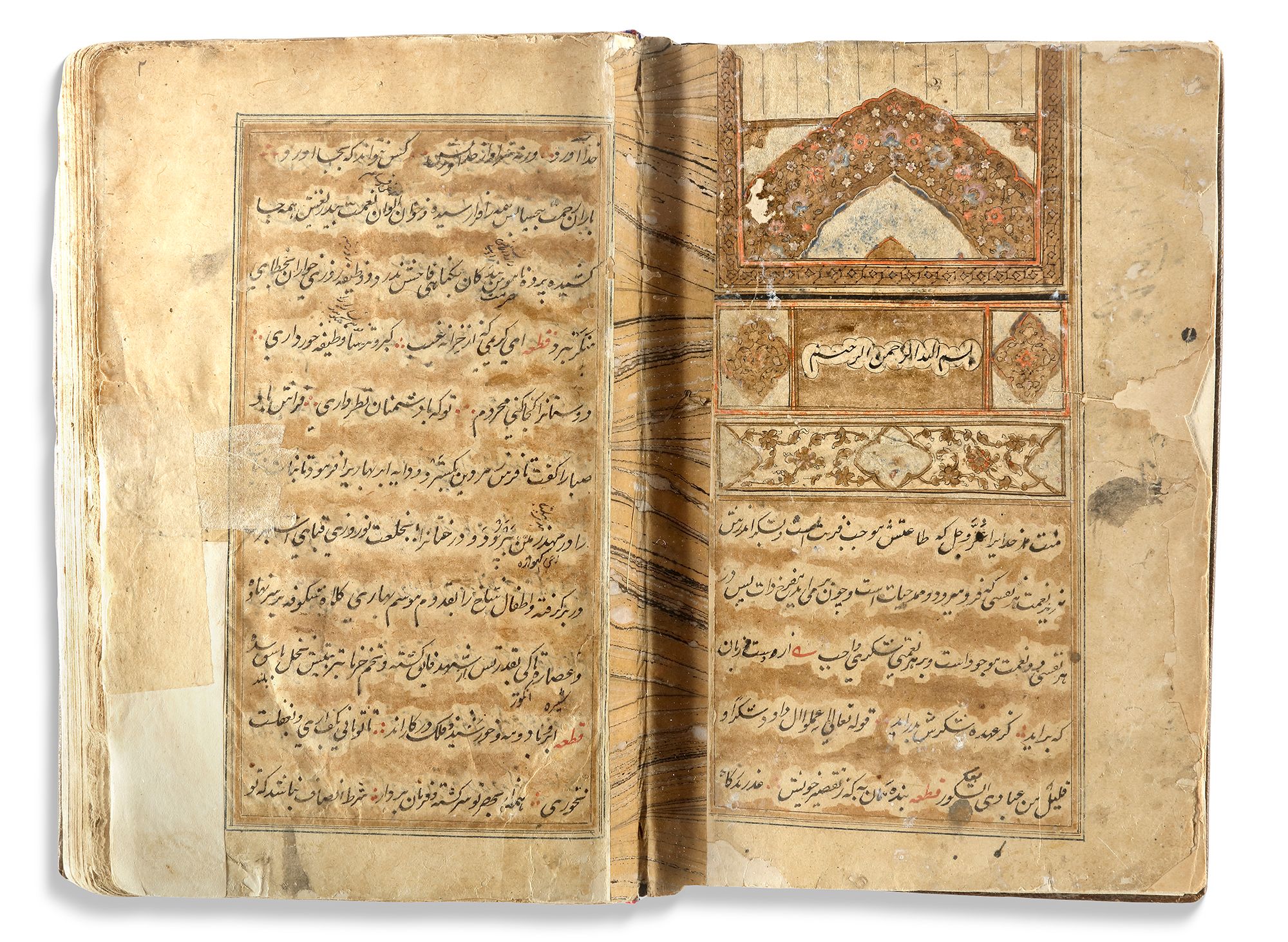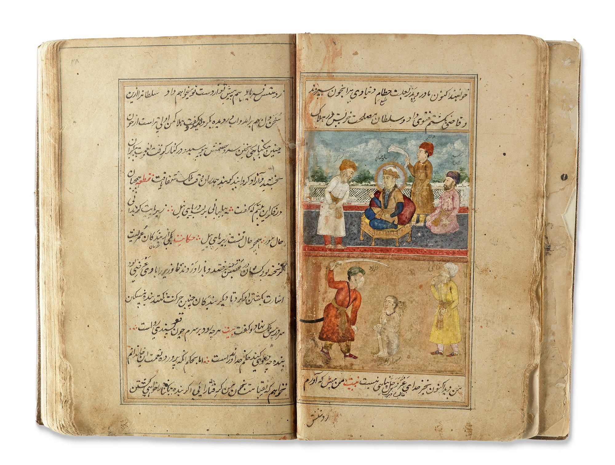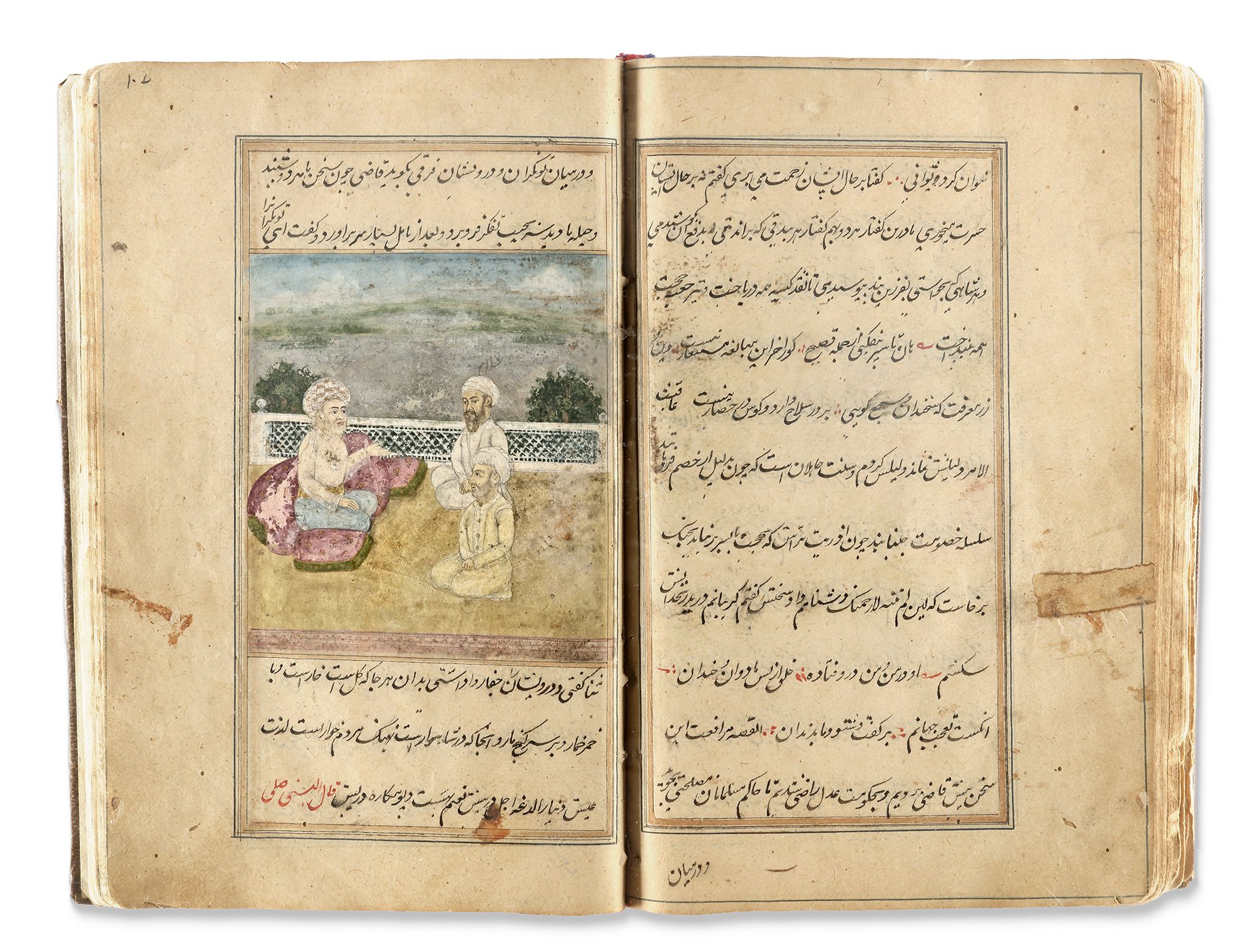 A Persian manuscript on paper, 124ff. with 11 lines per page written in nasta'liq script in black ink. Keywords and phrases are highlighted in red, with ruled gold and blue borders. The two opening bifolia feature a gold and polychrome illuminated headpiece. The manuscript contains various painted miniatures throughout, created in watercolor and heightened with gold. It is bound in brown morocco leather. 22 by 15 cm.